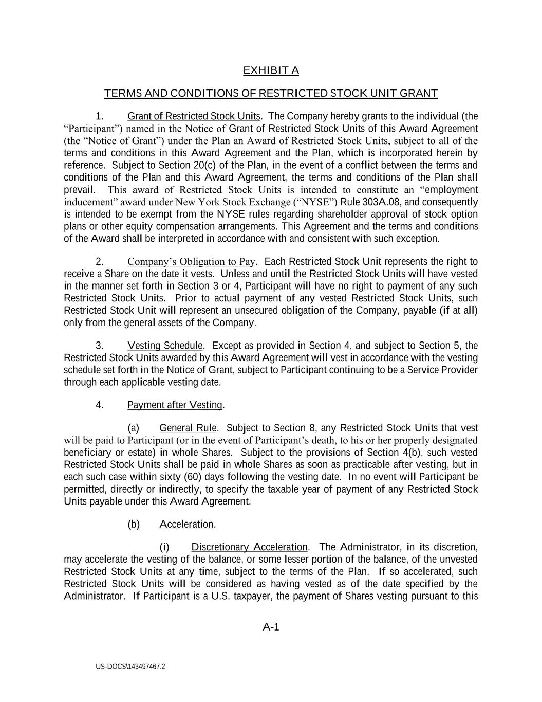 A-1 US-DOCS\143497467.2 EXHIBIT A TERMS AND CONDITIONS OF RESTRICTED STOCK UNIT GRANT 1. Grant of Restricted Stock Units. The Company hereby grants to the individual (the “Participant”) named in the Notice of Grant of Restricted Stock Units of this Award Agreement (the “Notice of Grant”) under the Plan an Award of Restricted Stock Units, subject to all of the terms and conditions in this Award Agreement and the Plan, which is incorporated herein by reference. Subject to Section 20(c) of the Plan, in the event of a conflict between the terms and conditions of the Plan and this Award Agreement, the terms and conditions of the Plan shall prevail. This award of Restricted Stock Units is intended to constitute an “employment inducement” award under New York Stock Exchange (“NYSE”) Rule 303A.08, and consequently is intended to be exempt from the NYSE rules regarding shareholder approval of stock option plans or other equity compensation arrangements. This Agreement and the terms and conditions of the Award shall be interpreted in accordance with and consistent with such exception. 2. Company’s Obligation to Pay. Each Restricted Stock Unit represents the right to receive a Share on the date it vests. Unless and until the Restricted Stock Units will have vested in the manner set forth in Section 3 or 4, Participant will have no right to payment of any such Restricted Stock Units. Prior to actual payment of any vested Restricted Stock Units, such Restricted Stock Unit will represent an unsecured obligation of the Company, payable (if at all) only from the general assets of the Company. 3. Vesting Schedule. Except as provided in Section 4, and subject to Section 5, the Restricted Stock Units awarded by this Award Agreement will vest in accordance with the vesting schedule set forth in the Notice of Grant, subject to Participant continuing to be a Service Provider through each applicable vesting date. 4. Payment after Vesting. (a) General Rule. Subject to Section 8, any Restricted Stock Units that vest will be paid to Participant (or in the event of Participant’s death, to his or her properly designated beneficiary or estate) in whole Shares. Subject to the provisions of Section 4(b), such vested Restricted Stock Units shall be paid in whole Shares as soon as practicable after vesting, but in each such case within sixty (60) days following the vesting date. In no event will Participant be permitted, directly or indirectly, to specify the taxable year of payment of any Restricted Stock Units payable under this Award Agreement. (b) Acceleration. (i) Discretionary Acceleration. The Administrator, in its discretion, may accelerate the vesting of the balance, or some lesser portion of the balance, of the unvested Restricted Stock Units at any time, subject to the terms of the Plan. If so accelerated, such Restricted Stock Units will be considered as having vested as of the date specified by the Administrator. If Participant is a U.S. taxpayer, the payment of Shares vesting pursuant to this
