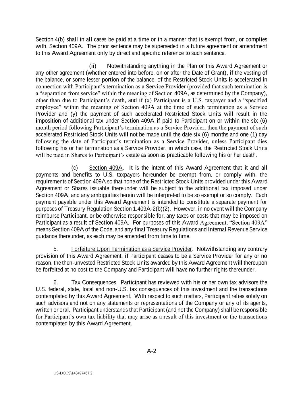 A-2 US-DOCS\143497467.2 Section 4(b) shall in all cases be paid at a time or in a manner that is exempt from, or complies with, Section 409A. The prior sentence may be superseded in a future agreement or amendment to this Award Agreement only by direct and specific reference to such sentence. (ii) Notwithstanding anything in the Plan or this Award Agreement or any other agreement (whether entered into before, on or after the Date of Grant), if the vesting of the balance, or some lesser portion of the balance, of the Restricted Stock Units is accelerated in connection with Participant’s termination as a Service Provider (provided that such termination is a “separation from service” within the meaning of Section 409A, as determined by the Company), other than due to Participant’s death, and if (x) Participant is a U.S. taxpayer and a “specified employee” within the meaning of Section 409A at the time of such termination as a Service Provider and (y) the payment of such accelerated Restricted Stock Units will result in the imposition of additional tax under Section 409A if paid to Participant on or within the six (6) month period following Participant’s termination as a Service Provider, then the payment of such accelerated Restricted Stock Units will not be made until the date six (6) months and one (1) day following the date of Participant’s termination as a Service Provider, unless Participant dies following his or her termination as a Service Provider, in which case, the Restricted Stock Units will be paid in Shares to Participant’s estate as soon as practicable following his or her death. (c) Section 409A. It is the intent of this Award Agreement that it and all payments and benefits to U.S. taxpayers hereunder be exempt from, or comply with, the requirements of Section 409A so that none of the Restricted Stock Units provided under this Award Agreement or Shares issuable thereunder will be subject to the additional tax imposed under Section 409A, and any ambiguities herein will be interpreted to be so exempt or so comply. Each payment payable under this Award Agreement is intended to constitute a separate payment for purposes of Treasury Regulation Section 1.409A-2(b)(2). However, in no event will the Company reimburse Participant, or be otherwise responsible for, any taxes or costs that may be imposed on Participant as a result of Section 409A. For purposes of this Award Agreement, “Section 409A” means Section 409A of the Code, and any final Treasury Regulations and Internal Revenue Service guidance thereunder, as each may be amended from time to time. 5. Forfeiture Upon Termination as a Service Provider. Notwithstanding any contrary provision of this Award Agreement, if Participant ceases to be a Service Provider for any or no reason, the then-unvested Restricted Stock Units awarded by this Award Agreement will thereupon be forfeited at no cost to the Company and Participant will have no further rights thereunder. 6. Tax Consequences. Participant has reviewed with his or her own tax advisors the U.S. federal, state, local and non-U.S. tax consequences of this investment and the transactions contemplated by this Award Agreement. With respect to such matters, Participant relies solely on such advisors and not on any statements or representations of the Company or any of its agents, written or oral. Participant understands that Participant (and not the Company) shall be responsible for Participant’s own tax liability that may arise as a result of this investment or the transactions contemplated by this Award Agreement.