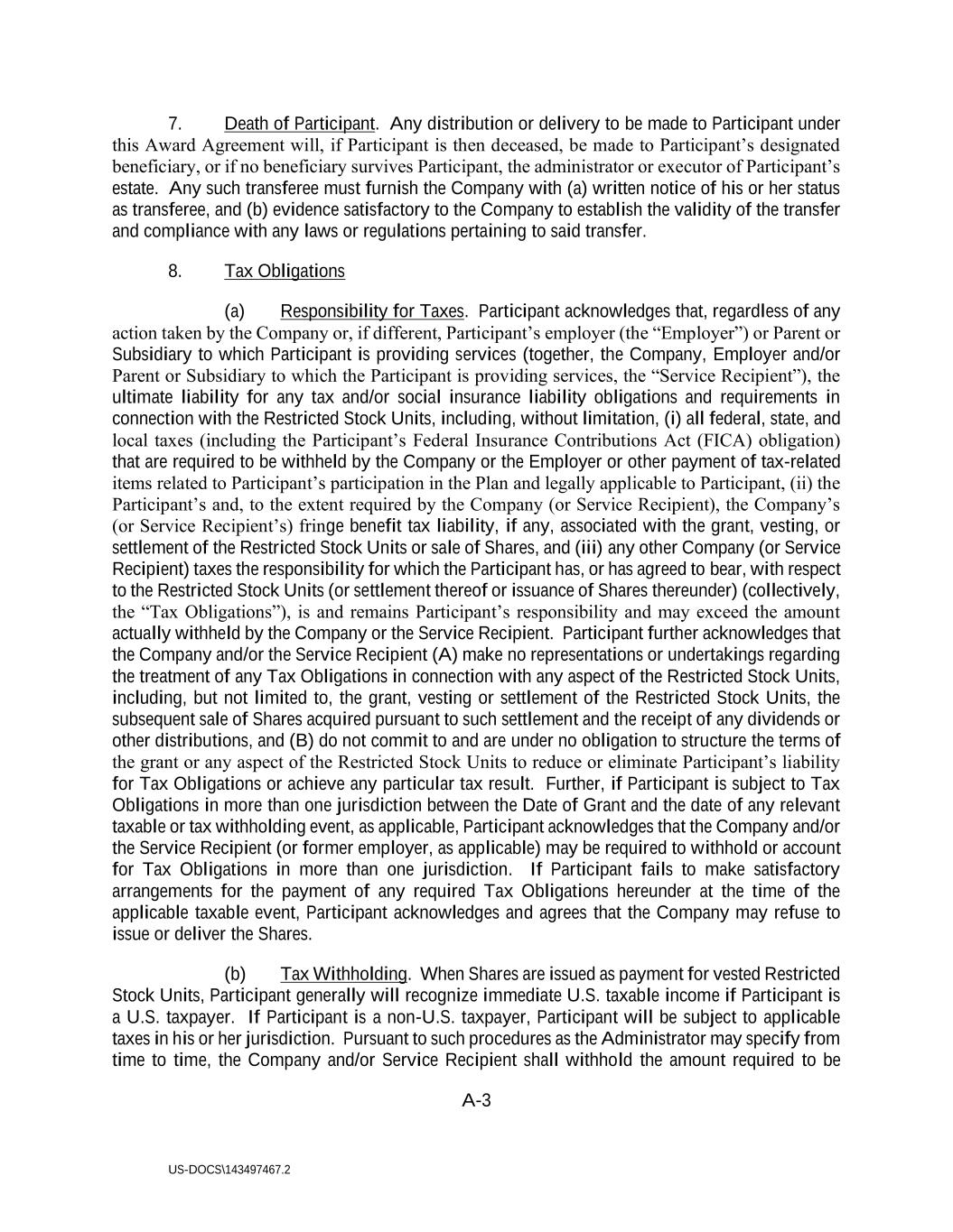 A-3 US-DOCS\143497467.2 7. Death of Participant. Any distribution or delivery to be made to Participant under this Award Agreement will, if Participant is then deceased, be made to Participant’s designated beneficiary, or if no beneficiary survives Participant, the administrator or executor of Participant’s estate. Any such transferee must furnish the Company with (a) written notice of his or her status as transferee, and (b) evidence satisfactory to the Company to establish the validity of the transfer and compliance with any laws or regulations pertaining to said transfer. 8. Tax Obligations (a) Responsibility for Taxes. Participant acknowledges that, regardless of any action taken by the Company or, if different, Participant’s employer (the “Employer”) or Parent or Subsidiary to which Participant is providing services (together, the Company, Employer and/or Parent or Subsidiary to which the Participant is providing services, the “Service Recipient”), the ultimate liability for any tax and/or social insurance liability obligations and requirements in connection with the Restricted Stock Units, including, without limitation, (i) all federal, state, and local taxes (including the Participant’s Federal Insurance Contributions Act (FICA) obligation) that are required to be withheld by the Company or the Employer or other payment of tax-related items related to Participant’s participation in the Plan and legally applicable to Participant, (ii) the Participant’s and, to the extent required by the Company (or Service Recipient), the Company’s (or Service Recipient’s) fringe benefit tax liability, if any, associated with the grant, vesting, or settlement of the Restricted Stock Units or sale of Shares, and (iii) any other Company (or Service Recipient) taxes the responsibility for which the Participant has, or has agreed to bear, with respect to the Restricted Stock Units (or settlement thereof or issuance of Shares thereunder) (collectively, the “Tax Obligations”), is and remains Participant’s responsibility and may exceed the amount actually withheld by the Company or the Service Recipient. Participant further acknowledges that the Company and/or the Service Recipient (A) make no representations or undertakings regarding the treatment of any Tax Obligations in connection with any aspect of the Restricted Stock Units, including, but not limited to, the grant, vesting or settlement of the Restricted Stock Units, the subsequent sale of Shares acquired pursuant to such settlement and the receipt of any dividends or other distributions, and (B) do not commit to and are under no obligation to structure the terms of the grant or any aspect of the Restricted Stock Units to reduce or eliminate Participant’s liability for Tax Obligations or achieve any particular tax result. Further, if Participant is subject to Tax Obligations in more than one jurisdiction between the Date of Grant and the date of any relevant taxable or tax withholding event, as applicable, Participant acknowledges that the Company and/or the Service Recipient (or former employer, as applicable) may be required to withhold or account for Tax Obligations in more than one jurisdiction. If Participant fails to make satisfactory arrangements for the payment of any required Tax Obligations hereunder at the time of the applicable taxable event, Participant acknowledges and agrees that the Company may refuse to issue or deliver the Shares. (b) Tax Withholding. When Shares are issued as payment for vested Restricted Stock Units, Participant generally will recognize immediate U.S. taxable income if Participant is a U.S. taxpayer. If Participant is a non-U.S. taxpayer, Participant will be subject to applicable taxes in his or her jurisdiction. Pursuant to such procedures as the Administrator may specify from time to time, the Company and/or Service Recipient shall withhold the amount required to be