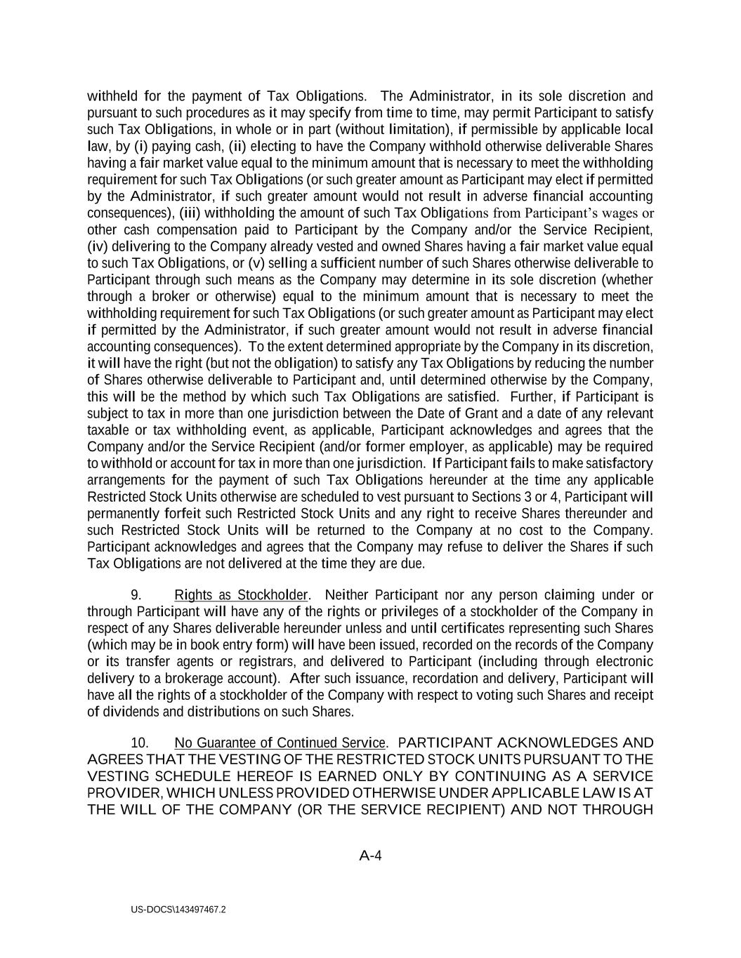 A-4 US-DOCS\143497467.2 withheld for the payment of Tax Obligations. The Administrator, in its sole discretion and pursuant to such procedures as it may specify from time to time, may permit Participant to satisfy such Tax Obligations, in whole or in part (without limitation), if permissible by applicable local law, by (i) paying cash, (ii) electing to have the Company withhold otherwise deliverable Shares having a fair market value equal to the minimum amount that is necessary to meet the withholding requirement for such Tax Obligations (or such greater amount as Participant may elect if permitted by the Administrator, if such greater amount would not result in adverse financial accounting consequences), (iii) withholding the amount of such Tax Obligations from Participant’s wages or other cash compensation paid to Participant by the Company and/or the Service Recipient, (iv) delivering to the Company already vested and owned Shares having a fair market value equal to such Tax Obligations, or (v) selling a sufficient number of such Shares otherwise deliverable to Participant through such means as the Company may determine in its sole discretion (whether through a broker or otherwise) equal to the minimum amount that is necessary to meet the withholding requirement for such Tax Obligations (or such greater amount as Participant may elect if permitted by the Administrator, if such greater amount would not result in adverse financial accounting consequences). To the extent determined appropriate by the Company in its discretion, it will have the right (but not the obligation) to satisfy any Tax Obligations by reducing the number of Shares otherwise deliverable to Participant and, until determined otherwise by the Company, this will be the method by which such Tax Obligations are satisfied. Further, if Participant is subject to tax in more than one jurisdiction between the Date of Grant and a date of any relevant taxable or tax withholding event, as applicable, Participant acknowledges and agrees that the Company and/or the Service Recipient (and/or former employer, as applicable) may be required to withhold or account for tax in more than one jurisdiction. If Participant fails to make satisfactory arrangements for the payment of such Tax Obligations hereunder at the time any applicable Restricted Stock Units otherwise are scheduled to vest pursuant to Sections 3 or 4, Participant will permanently forfeit such Restricted Stock Units and any right to receive Shares thereunder and such Restricted Stock Units will be returned to the Company at no cost to the Company. Participant acknowledges and agrees that the Company may refuse to deliver the Shares if such Tax Obligations are not delivered at the time they are due. 9. Rights as Stockholder. Neither Participant nor any person claiming under or through Participant will have any of the rights or privileges of a stockholder of the Company in respect of any Shares deliverable hereunder unless and until certificates representing such Shares (which may be in book entry form) will have been issued, recorded on the records of the Company or its transfer agents or registrars, and delivered to Participant (including through electronic delivery to a brokerage account). After such issuance, recordation and delivery, Participant will have all the rights of a stockholder of the Company with respect to voting such Shares and receipt of dividends and distributions on such Shares. 10. No Guarantee of Continued Service. PARTICIPANT ACKNOWLEDGES AND AGREES THAT THE VESTING OF THE RESTRICTED STOCK UNITS PURSUANT TO THE VESTING SCHEDULE HEREOF IS EARNED ONLY BY CONTINUING AS A SERVICE PROVIDER, WHICH UNLESS PROVIDED OTHERWISE UNDER APPLICABLE LAW IS AT THE WILL OF THE COMPANY (OR THE SERVICE RECIPIENT) AND NOT THROUGH
