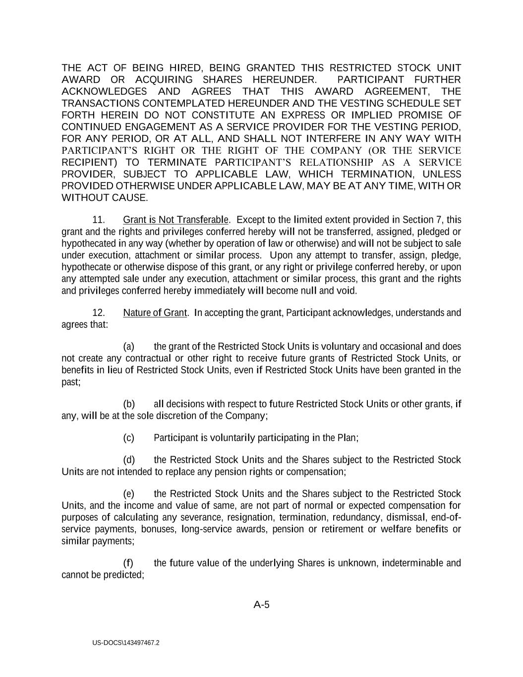 A-5 US-DOCS\143497467.2 THE ACT OF BEING HIRED, BEING GRANTED THIS RESTRICTED STOCK UNIT AWARD OR ACQUIRING SHARES HEREUNDER. PARTICIPANT FURTHER ACKNOWLEDGES AND AGREES THAT THIS AWARD AGREEMENT, THE TRANSACTIONS CONTEMPLATED HEREUNDER AND THE VESTING SCHEDULE SET FORTH HEREIN DO NOT CONSTITUTE AN EXPRESS OR IMPLIED PROMISE OF CONTINUED ENGAGEMENT AS A SERVICE PROVIDER FOR THE VESTING PERIOD, FOR ANY PERIOD, OR AT ALL, AND SHALL NOT INTERFERE IN ANY WAY WITH PARTICIPANT’S RIGHT OR THE RIGHT OF THE COMPANY (OR THE SERVICE RECIPIENT) TO TERMINATE PARTICIPANT’S RELATIONSHIP AS A SERVICE PROVIDER, SUBJECT TO APPLICABLE LAW, WHICH TERMINATION, UNLESS PROVIDED OTHERWISE UNDER APPLICABLE LAW, MAY BE AT ANY TIME, WITH OR WITHOUT CAUSE. 11. Grant is Not Transferable. Except to the limited extent provided in Section 7, this grant and the rights and privileges conferred hereby will not be transferred, assigned, pledged or hypothecated in any way (whether by operation of law or otherwise) and will not be subject to sale under execution, attachment or similar process. Upon any attempt to transfer, assign, pledge, hypothecate or otherwise dispose of this grant, or any right or privilege conferred hereby, or upon any attempted sale under any execution, attachment or similar process, this grant and the rights and privileges conferred hereby immediately will become null and void. 12. Nature of Grant. In accepting the grant, Participant acknowledges, understands and agrees that: (a) the grant of the Restricted Stock Units is voluntary and occasional and does not create any contractual or other right to receive future grants of Restricted Stock Units, or benefits in lieu of Restricted Stock Units, even if Restricted Stock Units have been granted in the past; (b) all decisions with respect to future Restricted Stock Units or other grants, if any, will be at the sole discretion of the Company; (c) Participant is voluntarily participating in the Plan; (d) the Restricted Stock Units and the Shares subject to the Restricted Stock Units are not intended to replace any pension rights or compensation; (e) the Restricted Stock Units and the Shares subject to the Restricted Stock Units, and the income and value of same, are not part of normal or expected compensation for purposes of calculating any severance, resignation, termination, redundancy, dismissal, end-of- service payments, bonuses, long-service awards, pension or retirement or welfare benefits or similar payments; (f) the future value of the underlying Shares is unknown, indeterminable and cannot be predicted;