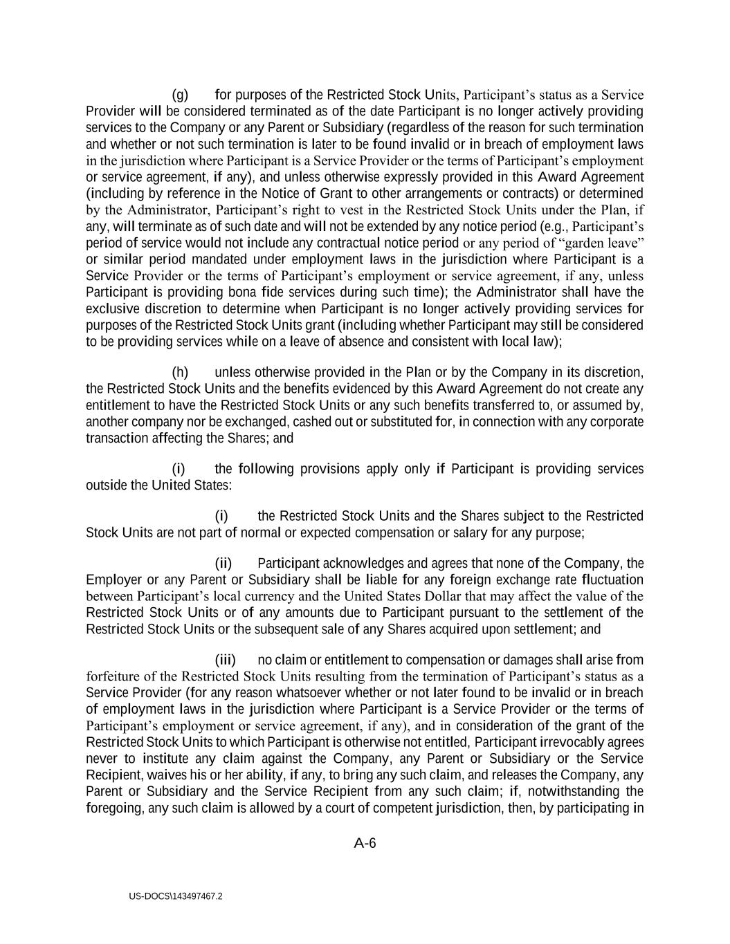 A-6 US-DOCS\143497467.2 (g) for purposes of the Restricted Stock Units, Participant’s status as a Service Provider will be considered terminated as of the date Participant is no longer actively providing services to the Company or any Parent or Subsidiary (regardless of the reason for such termination and whether or not such termination is later to be found invalid or in breach of employment laws in the jurisdiction where Participant is a Service Provider or the terms of Participant’s employment or service agreement, if any), and unless otherwise expressly provided in this Award Agreement (including by reference in the Notice of Grant to other arrangements or contracts) or determined by the Administrator, Participant’s right to vest in the Restricted Stock Units under the Plan, if any, will terminate as of such date and will not be extended by any notice period (e.g., Participant’s period of service would not include any contractual notice period or any period of “garden leave” or similar period mandated under employment laws in the jurisdiction where Participant is a Service Provider or the terms of Participant’s employment or service agreement, if any, unless Participant is providing bona fide services during such time); the Administrator shall have the exclusive discretion to determine when Participant is no longer actively providing services for purposes of the Restricted Stock Units grant (including whether Participant may still be considered to be providing services while on a leave of absence and consistent with local law); (h) unless otherwise provided in the Plan or by the Company in its discretion, the Restricted Stock Units and the benefits evidenced by this Award Agreement do not create any entitlement to have the Restricted Stock Units or any such benefits transferred to, or assumed by, another company nor be exchanged, cashed out or substituted for, in connection with any corporate transaction affecting the Shares; and (i) the following provisions apply only if Participant is providing services outside the United States: (i) the Restricted Stock Units and the Shares subject to the Restricted Stock Units are not part of normal or expected compensation or salary for any purpose; (ii) Participant acknowledges and agrees that none of the Company, the Employer or any Parent or Subsidiary shall be liable for any foreign exchange rate fluctuation between Participant’s local currency and the United States Dollar that may affect the value of the Restricted Stock Units or of any amounts due to Participant pursuant to the settlement of the Restricted Stock Units or the subsequent sale of any Shares acquired upon settlement; and (iii) no claim or entitlement to compensation or damages shall arise from forfeiture of the Restricted Stock Units resulting from the termination of Participant’s status as a Service Provider (for any reason whatsoever whether or not later found to be invalid or in breach of employment laws in the jurisdiction where Participant is a Service Provider or the terms of Participant’s employment or service agreement, if any), and in consideration of the grant of the Restricted Stock Units to which Participant is otherwise not entitled, Participant irrevocably agrees never to institute any claim against the Company, any Parent or Subsidiary or the Service Recipient, waives his or her ability, if any, to bring any such claim, and releases the Company, any Parent or Subsidiary and the Service Recipient from any such claim; if, notwithstanding the foregoing, any such claim is allowed by a court of competent jurisdiction, then, by participating in