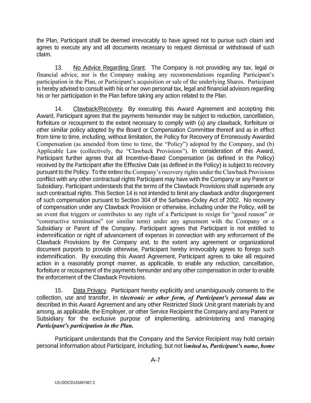 A-7 US-DOCS\143497467.2 the Plan, Participant shall be deemed irrevocably to have agreed not to pursue such claim and agrees to execute any and all documents necessary to request dismissal or withdrawal of such claim. 13. No Advice Regarding Grant. The Company is not providing any tax, legal or financial advice, nor is the Company making any recommendations regarding Participant’s participation in the Plan, or Participant’s acquisition or sale of the underlying Shares. Participant is hereby advised to consult with his or her own personal tax, legal and financial advisors regarding his or her participation in the Plan before taking any action related to the Plan. 14. Clawback/Recovery. By executing this Award Agreement and accepting this Award, Participant agrees that the payments hereunder may be subject to reduction, cancellation, forfeiture or recoupment to the extent necessary to comply with (a) any clawback, forfeiture or other similar policy adopted by the Board or Compensation Committee thereof and as in effect from time to time, including, without limitation, the Policy for Recovery of Erroneously Awarded Compensation (as amended from time to time, the “Policy”) adopted by the Company, and (b) Applicable Law (collectively, the “Clawback Provisions”). In consideration of this Award, Participant further agrees that all Incentive-Based Compensation (as defined in the Policy) received by the Participant after the Effective Date (as defined in the Policy) is subject to recovery pursuant to the Policy. To the extent the Company’s recovery rights under the Clawback Provisions conflict with any other contractual rights Participant may have with the Company or any Parent or Subsidiary, Participant understands that the terms of the Clawback Provisions shall supersede any such contractual rights. This Section 14 is not intended to limit any clawback and/or disgorgement of such compensation pursuant to Section 304 of the Sarbanes-Oxley Act of 2002. No recovery of compensation under any Clawback Provision or otherwise, including under the Policy, will be an event that triggers or contributes to any right of a Participant to resign for “good reason” or “constructive termination” (or similar term) under any agreement with the Company or a Subsidiary or Parent of the Company. Participant agrees that Participant is not entitled to indemnification or right of advancement of expenses in connection with any enforcement of the Clawback Provisions by the Company and, to the extent any agreement or organizational document purports to provide otherwise, Participant hereby irrevocably agrees to forego such indemnification. By executing this Award Agreement, Participant agrees to take all required action in a reasonably prompt manner, as applicable, to enable any reduction, cancellation, forfeiture or recoupment of the payments hereunder and any other compensation in order to enable the enforcement of the Clawback Provisions. 15. Data Privacy. Participant hereby explicitly and unambiguously consents to the collection, use and transfer, in electronic or other form, of Participant’s personal data as described in this Award Agreement and any other Restricted Stock Unit grant materials by and among, as applicable, the Employer, or other Service Recipient the Company and any Parent or Subsidiary for the exclusive purpose of implementing, administering and managing Participant’s participation in the Plan. Participant understands that the Company and the Service Recipient may hold certain personal information about Participant, including, but not limited to, Participant’s name, home