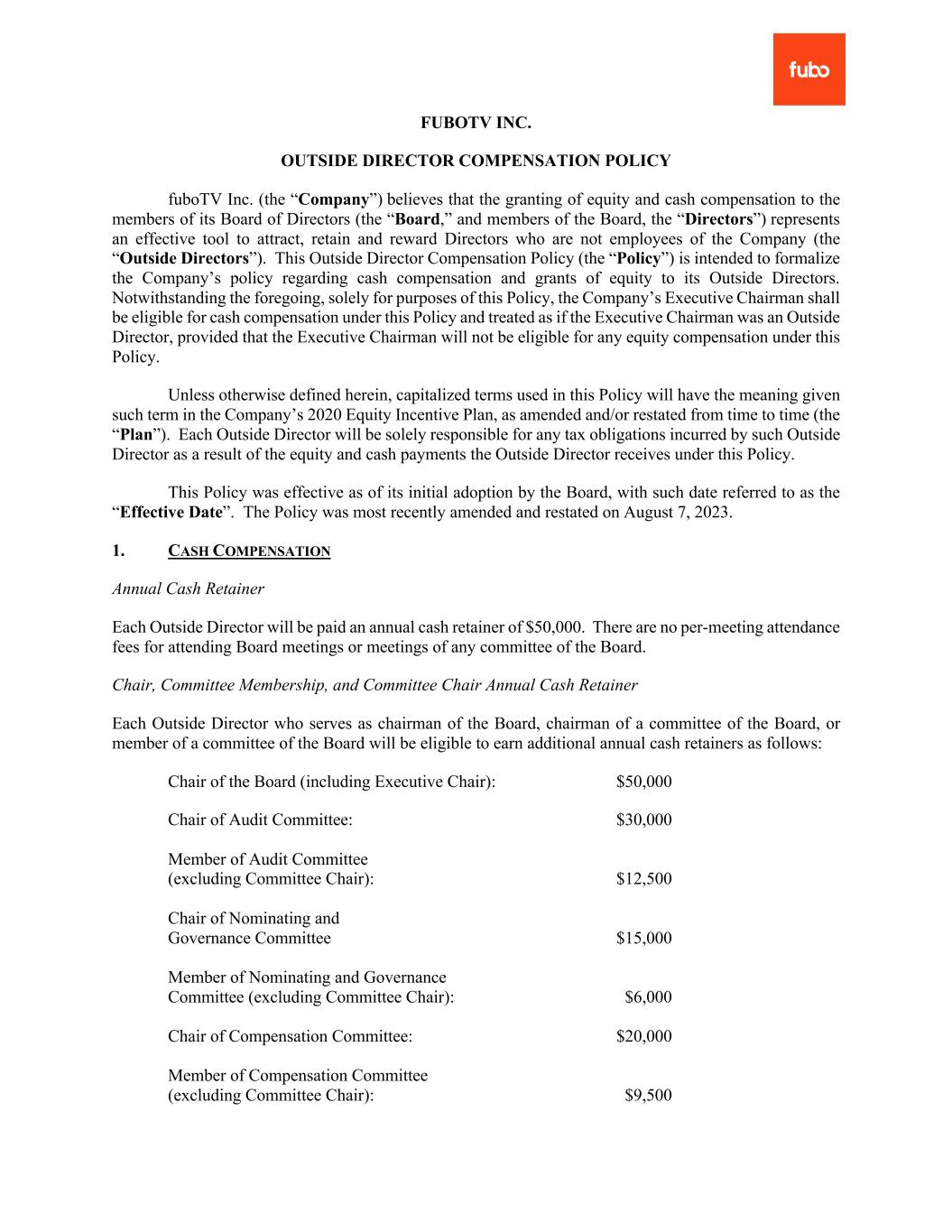 FUBOTV INC. OUTSIDE DIRECTOR COMPENSATION POLICY fuboTV Inc. (the “Company”) believes that the granting of equity and cash compensation to the members of its Board of Directors (the “Board,” and members of the Board, the “Directors”) represents an effective tool to attract, retain and reward Directors who are not employees of the Company (the “Outside Directors”). This Outside Director Compensation Policy (the “Policy”) is intended to formalize the Company’s policy regarding cash compensation and grants of equity to its Outside Directors. Notwithstanding the foregoing, solely for purposes of this Policy, the Company’s Executive Chairman shall be eligible for cash compensation under this Policy and treated as if the Executive Chairman was an Outside Director, provided that the Executive Chairman will not be eligible for any equity compensation under this Policy. Unless otherwise defined herein, capitalized terms used in this Policy will have the meaning given such term in the Company’s 2020 Equity Incentive Plan, as amended and/or restated from time to time (the “Plan”). Each Outside Director will be solely responsible for any tax obligations incurred by such Outside Director as a result of the equity and cash payments the Outside Director receives under this Policy. This Policy was effective as of its initial adoption by the Board, with such date referred to as the “Effective Date”. The Policy was most recently amended and restated on August 7, 2023. 1. CASH COMPENSATION Annual Cash Retainer Each Outside Director will be paid an annual cash retainer of $50,000. There are no per-meeting attendance fees for attending Board meetings or meetings of any committee of the Board. Chair, Committee Membership, and Committee Chair Annual Cash Retainer Each Outside Director who serves as chairman of the Board, chairman of a committee of the Board, or member of a committee of the Board will be eligible to earn additional annual cash retainers as follows: Chair of the Board (including Executive Chair): $50,000 Chair of Audit Committee: $30,000 Member of Audit Committee (excluding Committee Chair): $12,500 Chair of Nominating and Governance Committee $15,000 Member of Nominating and Governance Committee (excluding Committee Chair): $6,000 Chair of Compensation Committee: $20,000 Member of Compensation Committee (excluding Committee Chair): $9,500
