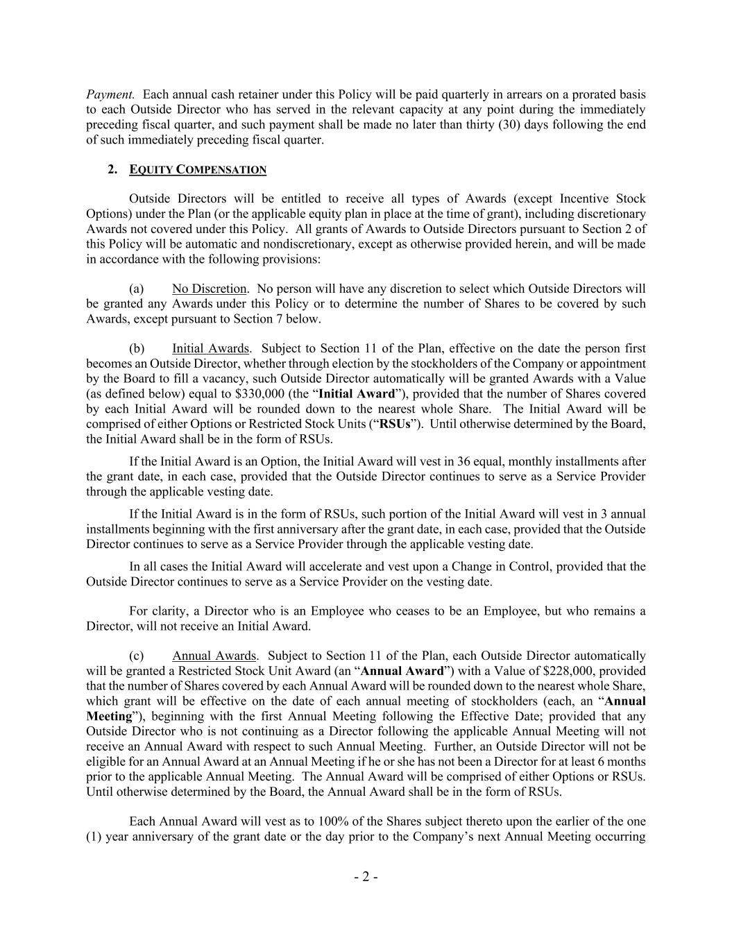 - 2 - Payment. Each annual cash retainer under this Policy will be paid quarterly in arrears on a prorated basis to each Outside Director who has served in the relevant capacity at any point during the immediately preceding fiscal quarter, and such payment shall be made no later than thirty (30) days following the end of such immediately preceding fiscal quarter. 2. EQUITY COMPENSATION Outside Directors will be entitled to receive all types of Awards (except Incentive Stock Options) under the Plan (or the applicable equity plan in place at the time of grant), including discretionary Awards not covered under this Policy. All grants of Awards to Outside Directors pursuant to Section 2 of this Policy will be automatic and nondiscretionary, except as otherwise provided herein, and will be made in accordance with the following provisions: (a) No Discretion. No person will have any discretion to select which Outside Directors will be granted any Awards under this Policy or to determine the number of Shares to be covered by such Awards, except pursuant to Section 7 below. (b) Initial Awards. Subject to Section 11 of the Plan, effective on the date the person first becomes an Outside Director, whether through election by the stockholders of the Company or appointment by the Board to fill a vacancy, such Outside Director automatically will be granted Awards with a Value (as defined below) equal to $330,000 (the “Initial Award”), provided that the number of Shares covered by each Initial Award will be rounded down to the nearest whole Share. The Initial Award will be comprised of either Options or Restricted Stock Units (“RSUs”). Until otherwise determined by the Board, the Initial Award shall be in the form of RSUs. If the Initial Award is an Option, the Initial Award will vest in 36 equal, monthly installments after the grant date, in each case, provided that the Outside Director continues to serve as a Service Provider through the applicable vesting date. If the Initial Award is in the form of RSUs, such portion of the Initial Award will vest in 3 annual installments beginning with the first anniversary after the grant date, in each case, provided that the Outside Director continues to serve as a Service Provider through the applicable vesting date. In all cases the Initial Award will accelerate and vest upon a Change in Control, provided that the Outside Director continues to serve as a Service Provider on the vesting date. For clarity, a Director who is an Employee who ceases to be an Employee, but who remains a Director, will not receive an Initial Award. (c) Annual Awards. Subject to Section 11 of the Plan, each Outside Director automatically will be granted a Restricted Stock Unit Award (an “Annual Award”) with a Value of $228,000, provided that the number of Shares covered by each Annual Award will be rounded down to the nearest whole Share, which grant will be effective on the date of each annual meeting of stockholders (each, an “Annual Meeting”), beginning with the first Annual Meeting following the Effective Date; provided that any Outside Director who is not continuing as a Director following the applicable Annual Meeting will not receive an Annual Award with respect to such Annual Meeting. Further, an Outside Director will not be eligible for an Annual Award at an Annual Meeting if he or she has not been a Director for at least 6 months prior to the applicable Annual Meeting. The Annual Award will be comprised of either Options or RSUs. Until otherwise determined by the Board, the Annual Award shall be in the form of RSUs. Each Annual Award will vest as to 100% of the Shares subject thereto upon the earlier of the one (1) year anniversary of the grant date or the day prior to the Company’s next Annual Meeting occurring