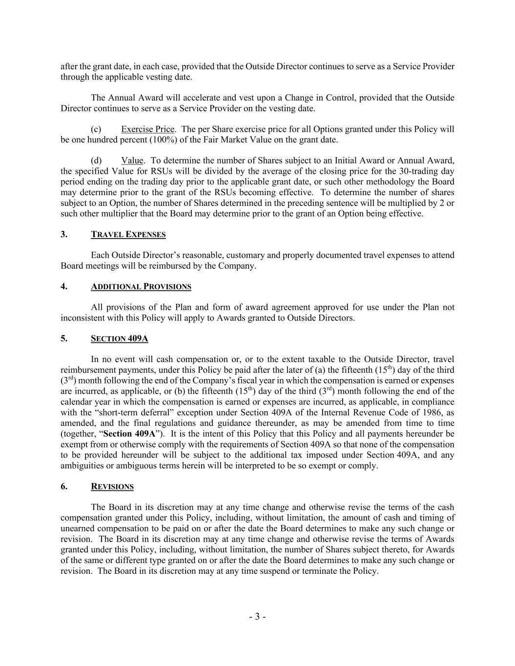 - 3 - after the grant date, in each case, provided that the Outside Director continues to serve as a Service Provider through the applicable vesting date. The Annual Award will accelerate and vest upon a Change in Control, provided that the Outside Director continues to serve as a Service Provider on the vesting date. (c) Exercise Price. The per Share exercise price for all Options granted under this Policy will be one hundred percent (100%) of the Fair Market Value on the grant date. (d) Value. To determine the number of Shares subject to an Initial Award or Annual Award, the specified Value for RSUs will be divided by the average of the closing price for the 30-trading day period ending on the trading day prior to the applicable grant date, or such other methodology the Board may determine prior to the grant of the RSUs becoming effective. To determine the number of shares subject to an Option, the number of Shares determined in the preceding sentence will be multiplied by 2 or such other multiplier that the Board may determine prior to the grant of an Option being effective. 3. TRAVEL EXPENSES Each Outside Director’s reasonable, customary and properly documented travel expenses to attend Board meetings will be reimbursed by the Company. 4. ADDITIONAL PROVISIONS All provisions of the Plan and form of award agreement approved for use under the Plan not inconsistent with this Policy will apply to Awards granted to Outside Directors. 5. SECTION 409A In no event will cash compensation or, or to the extent taxable to the Outside Director, travel reimbursement payments, under this Policy be paid after the later of (a) the fifteenth (15th) day of the third (3rd) month following the end of the Company’s fiscal year in which the compensation is earned or expenses are incurred, as applicable, or (b) the fifteenth (15th) day of the third (3rd) month following the end of the calendar year in which the compensation is earned or expenses are incurred, as applicable, in compliance with the “short-term deferral” exception under Section 409A of the Internal Revenue Code of 1986, as amended, and the final regulations and guidance thereunder, as may be amended from time to time (together, “Section 409A”). It is the intent of this Policy that this Policy and all payments hereunder be exempt from or otherwise comply with the requirements of Section 409A so that none of the compensation to be provided hereunder will be subject to the additional tax imposed under Section 409A, and any ambiguities or ambiguous terms herein will be interpreted to be so exempt or comply. 6. REVISIONS The Board in its discretion may at any time change and otherwise revise the terms of the cash compensation granted under this Policy, including, without limitation, the amount of cash and timing of unearned compensation to be paid on or after the date the Board determines to make any such change or revision. The Board in its discretion may at any time change and otherwise revise the terms of Awards granted under this Policy, including, without limitation, the number of Shares subject thereto, for Awards of the same or different type granted on or after the date the Board determines to make any such change or revision. The Board in its discretion may at any time suspend or terminate the Policy.