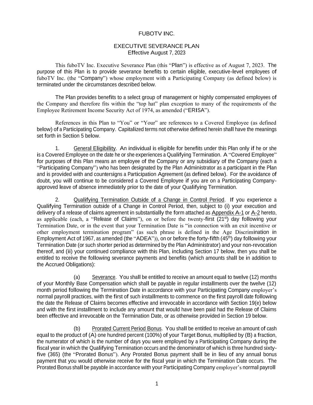 1 FUBOTV INC. EXECUTIVE SEVERANCE PLAN Effective August 7, 2023 This fuboTV Inc. Executive Severance Plan (this “Plan”) is effective as of August 7, 2023. The purpose of this Plan is to provide severance benefits to certain eligible, executive-level employees of fuboTV Inc. (the “Company”) whose employment with a Participating Company (as defined below) is terminated under the circumstances described below. The Plan provides benefits to a select group of management or highly compensated employees of the Company and therefore fits within the “top hat” plan exception to many of the requirements of the Employee Retirement Income Security Act of 1974, as amended (“ERISA”). References in this Plan to “You” or “Your” are references to a Covered Employee (as defined below) of a Participating Company. Capitalized terms not otherwise defined herein shall have the meanings set forth in Section 5 below. 1. General Eligibility. An individual is eligible for benefits under this Plan only if he or she is a Covered Employee on the date he or she experiences a Qualifying Termination. A “Covered Employee” for purposes of this Plan means an employee of the Company or any subsidiary of the Company (each a “Participating Company”) who has been designated by the Plan Administrator as a participant in the Plan and is provided with and countersigns a Participation Agreement (as defined below). For the avoidance of doubt, you will continue to be considered a Covered Employee if you are on a Participating Company- approved leave of absence immediately prior to the date of your Qualifying Termination. 2. Qualifying Termination Outside of a Change in Control Period. If you experience a Qualifying Termination outside of a Change in Control Period, then, subject to (i) your execution and delivery of a release of claims agreement in substantially the form attached as Appendix A-1 or A-2 hereto, as applicable (each, a “Release of Claims”), on or before the twenty-first (21st) day following your Termination Date, or in the event that your Termination Date is “in connection with an exit incentive or other employment termination program” (as such phrase is defined in the Age Discrimination in Employment Act of 1967, as amended (the “ADEA”)), on or before the forty-fifth (45th) day following your Termination Date (or such shorter period as determined by the Plan Administrator) and your non-revocation thereof, and (ii) your continued compliance with this Plan, including Section 17 below, then you shall be entitled to receive the following severance payments and benefits (which amounts shall be in addition to the Accrued Obligations): (a) Severance. You shall be entitled to receive an amount equal to twelve (12) months of your Monthly Base Compensation which shall be payable in regular installments over the twelve (12) month period following the Termination Date in accordance with your Participating Company employer’s normal payroll practices, with the first of such installments to commence on the first payroll date following the date the Release of Claims becomes effective and irrevocable in accordance with Section 19(e) below and with the first installment to include any amount that would have been paid had the Release of Claims been effective and irrevocable on the Termination Date, or as otherwise provided in Section 19 below. (b) Prorated Current Period Bonus. You shall be entitled to receive an amount of cash equal to the product of (A) one hundred percent (100%) of your Target Bonus, multiplied by (B) a fraction, the numerator of which is the number of days you were employed by a Participating Company during the fiscal year in which the Qualifying Termination occurs and the denominator of which is three hundred sixty- five (365) (the “Prorated Bonus”). Any Prorated Bonus payment shall be in lieu of any annual bonus payment that you would otherwise receive for the fiscal year in which the Termination Date occurs. The Prorated Bonus shall be payable in accordance with your Participating Company employer’s normal payroll