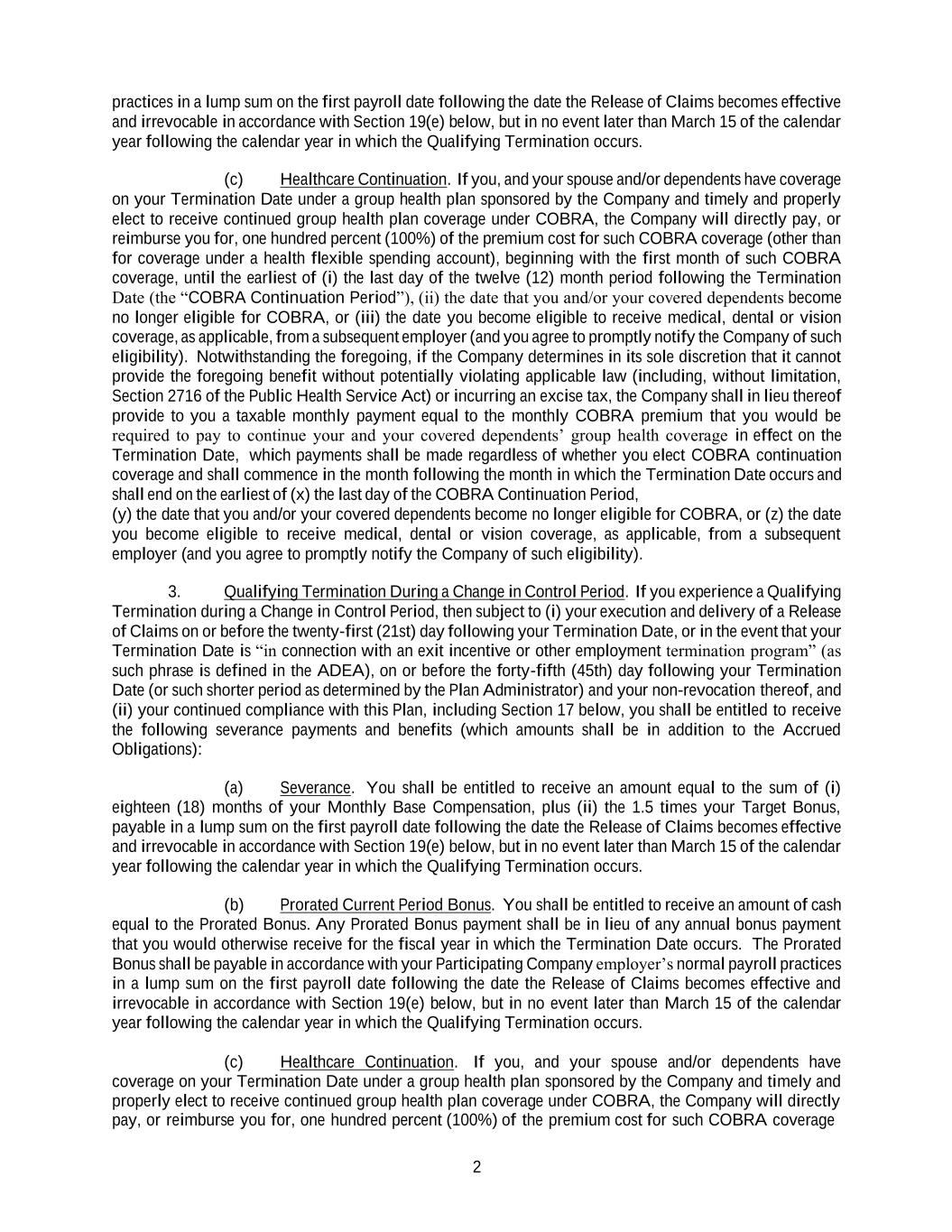 2 practices in a lump sum on the first payroll date following the date the Release of Claims becomes effective and irrevocable in accordance with Section 19(e) below, but in no event later than March 15 of the calendar year following the calendar year in which the Qualifying Termination occurs. (c) Healthcare Continuation. If you, and your spouse and/or dependents have coverage on your Termination Date under a group health plan sponsored by the Company and timely and properly elect to receive continued group health plan coverage under COBRA, the Company will directly pay, or reimburse you for, one hundred percent (100%) of the premium cost for such COBRA coverage (other than for coverage under a health flexible spending account), beginning with the first month of such COBRA coverage, until the earliest of (i) the last day of the twelve (12) month period following the Termination Date (the “COBRA Continuation Period”), (ii) the date that you and/or your covered dependents become no longer eligible for COBRA, or (iii) the date you become eligible to receive medical, dental or vision coverage, as applicable, from a subsequent employer (and you agree to promptly notify the Company of such eligibility). Notwithstanding the foregoing, if the Company determines in its sole discretion that it cannot provide the foregoing benefit without potentially violating applicable law (including, without limitation, Section 2716 of the Public Health Service Act) or incurring an excise tax, the Company shall in lieu thereof provide to you a taxable monthly payment equal to the monthly COBRA premium that you would be required to pay to continue your and your covered dependents’ group health coverage in effect on the Termination Date, which payments shall be made regardless of whether you elect COBRA continuation coverage and shall commence in the month following the month in which the Termination Date occurs and shall end on the earliest of (x) the last day of the COBRA Continuation Period, (y) the date that you and/or your covered dependents become no longer eligible for COBRA, or (z) the date you become eligible to receive medical, dental or vision coverage, as applicable, from a subsequent employer (and you agree to promptly notify the Company of such eligibility). 3. Qualifying Termination During a Change in Control Period. If you experience a Qualifying Termination during a Change in Control Period, then subject to (i) your execution and delivery of a Release of Claims on or before the twenty-first (21st) day following your Termination Date, or in the event that your Termination Date is “in connection with an exit incentive or other employment termination program” (as such phrase is defined in the ADEA), on or before the forty-fifth (45th) day following your Termination Date (or such shorter period as determined by the Plan Administrator) and your non-revocation thereof, and (ii) your continued compliance with this Plan, including Section 17 below, you shall be entitled to receive the following severance payments and benefits (which amounts shall be in addition to the Accrued Obligations): (a) Severance. You shall be entitled to receive an amount equal to the sum of (i) eighteen (18) months of your Monthly Base Compensation, plus (ii) the 1.5 times your Target Bonus, payable in a lump sum on the first payroll date following the date the Release of Claims becomes effective and irrevocable in accordance with Section 19(e) below, but in no event later than March 15 of the calendar year following the calendar year in which the Qualifying Termination occurs. (b) Prorated Current Period Bonus. You shall be entitled to receive an amount of cash equal to the Prorated Bonus. Any Prorated Bonus payment shall be in lieu of any annual bonus payment that you would otherwise receive for the fiscal year in which the Termination Date occurs. The Prorated Bonus shall be payable in accordance with your Participating Company employer’s normal payroll practices in a lump sum on the first payroll date following the date the Release of Claims becomes effective and irrevocable in accordance with Section 19(e) below, but in no event later than March 15 of the calendar year following the calendar year in which the Qualifying Termination occurs. (c) Healthcare Continuation. If you, and your spouse and/or dependents have coverage on your Termination Date under a group health plan sponsored by the Company and timely and properly elect to receive continued group health plan coverage under COBRA, the Company will directly pay, or reimburse you for, one hundred percent (100%) of the premium cost for such COBRA coverage