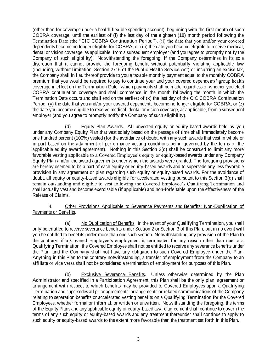 3 (other than for coverage under a health flexible spending account), beginning with the first month of such COBRA coverage, until the earliest of (i) the last day of the eighteen (18) month period following the Termination Date (the “CIC COBRA Continuation Period”), (ii) the date that you and/or your covered dependents become no longer eligible for COBRA, or (iii) the date you become eligible to receive medical, dental or vision coverage, as applicable, from a subsequent employer (and you agree to promptly notify the Company of such eligibility). Notwithstanding the foregoing, if the Company determines in its sole discretion that it cannot provide the foregoing benefit without potentially violating applicable law (including, without limitation, Section 2716 of the Public Health Service Act) or incurring an excise tax, the Company shall in lieu thereof provide to you a taxable monthly payment equal to the monthly COBRA premium that you would be required to pay to continue your and your covered dependents’ group health coverage in effect on the Termination Date, which payments shall be made regardless of whether you elect COBRA continuation coverage and shall commence in the month following the month in which the Termination Date occurs and shall end on the earliest of (x) the last day of the CIC COBRA Continuation Period, (y) the date that you and/or your covered dependents become no longer eligible for COBRA, or (z) the date you become eligible to receive medical, dental or vision coverage, as applicable, from a subsequent employer (and you agree to promptly notify the Company of such eligibility). (d) Equity Plan Awards. All unvested equity or equity-based awards held by you under any Company Equity Plan that vest solely based on the passage of time shall immediately become one hundred percent (100%) vested (for the avoidance of doubt, with any such awards that vest in whole or in part based on the attainment of performance-vesting conditions being governed by the terms of the applicable equity award agreement). Nothing in this Section 3(d) shall be construed to limit any more favorable vesting applicable to a Covered Employee’s equity or equity-based awards under any Company Equity Plan and/or the award agreements under which the awards were granted. The foregoing provisions are hereby deemed to be a part of each equity or equity-based awards and to supersede any less favorable provision in any agreement or plan regarding such equity or equity-based awards. For the avoidance of doubt, all equity or equity-based awards eligible for accelerated vesting pursuant to this Section 3(d) shall remain outstanding and eligible to vest following the Covered Employee’s Qualifying Termination and shall actually vest and become exercisable (if applicable) and non-forfeitable upon the effectiveness of the Release of Claims. 4. Other Provisions Applicable to Severance Payments and Benefits; Non-Duplication of Payments or Benefits. (a) No Duplication of Benefits. In the event of your Qualifying Termination, you shall only be entitled to receive severance benefits under Section 2 or Section 3 of this Plan, but in no event will you be entitled to benefits under more than one such section. Notwithstanding any provision of the Plan to the contrary, if a Covered Employee’s employment is terminated for any reason other than due to a Qualifying Termination, the Covered Employee shall not be entitled to receive any severance benefits under the Plan, and the Company shall not have any obligation to such Covered Employee under the Plan. Anything in this Plan to the contrary notwithstanding, a transfer of employment from the Company to an affiliate or vice versa shall not be considered a termination of employment for purposes of this Plan. (b) Exclusive Severance Benefits. Unless otherwise determined by the Plan Administrator and specified in a Participation Agreement, this Plan shall be the only plan, agreement or arrangement with respect to which benefits may be provided to Covered Employees upon a Qualifying Termination and supersedes all prior agreements, arrangements or related communications of the Company relating to separation benefits or accelerated vesting benefits on a Qualifying Termination for the Covered Employees, whether formal or informal, or written or unwritten. Notwithstanding the foregoing, the terms of the Equity Plans and any applicable equity or equity-based award agreement shall continue to govern the terms of any such equity or equity-based awards and any treatment thereunder shall continue to apply to such equity or equity-based awards to the extent more favorable than the treatment set forth in this Plan.