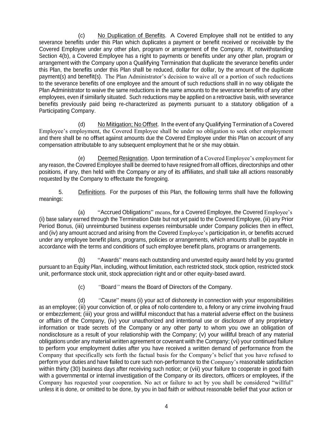 4 (c) No Duplication of Benefits. A Covered Employee shall not be entitled to any severance benefits under this Plan which duplicates a payment or benefit received or receivable by the Covered Employee under any other plan, program or arrangement of the Company. If, notwithstanding Section 4(b), a Covered Employee has a right to payments or benefits under any other plan, program or arrangement with the Company upon a Qualifying Termination that duplicate the severance benefits under this Plan, the benefits under this Plan shall be reduced, dollar for dollar, by the amount of the duplicate payment(s) and benefit(s). The Plan Administrator’s decision to waive all or a portion of such reductions to the severance benefits of one employee and the amount of such reductions shall in no way obligate the Plan Administrator to waive the same reductions in the same amounts to the severance benefits of any other employees, even if similarly situated. Such reductions may be applied on a retroactive basis, with severance benefits previously paid being re-characterized as payments pursuant to a statutory obligation of a Participating Company. (d) No Mitigation; No Offset. In the event of any Qualifying Termination of a Covered Employee’s employment, the Covered Employee shall be under no obligation to seek other employment and there shall be no offset against amounts due the Covered Employee under this Plan on account of any compensation attributable to any subsequent employment that he or she may obtain. (e) Deemed Resignation. Upon termination of a Covered Employee’s employment for any reason, the Covered Employee shall be deemed to have resigned from all offices, directorships and other positions, if any, then held with the Company or any of its affiliates, and shall take all actions reasonably requested by the Company to effectuate the foregoing. 5. Definitions. For the purposes of this Plan, the following terms shall have the following meanings: (a) “Accrued Obligations” means, for a Covered Employee, the Covered Employee’s (i) base salary earned through the Termination Date but not yet paid to the Covered Employee, (ii) any Prior Period Bonus, (iii) unreimbursed business expenses reimbursable under Company policies then in effect, and (iv) any amount accrued and arising from the Covered Employee’s participation in, or benefits accrued under any employee benefit plans, programs, policies or arrangements, which amounts shall be payable in accordance with the terms and conditions of such employee benefit plans, programs or arrangements. (b) “Awards” means each outstanding and unvested equity award held by you granted pursuant to an Equity Plan, including, without limitation, each restricted stock, stock option, restricted stock unit, performance stock unit, stock appreciation right and or other equity-based award. (c) “Board” means the Board of Directors of the Company. (d) “Cause” means (i) your act of dishonesty in connection with your responsibilities as an employee; (ii) your conviction of, or plea of nolo contendere to, a felony or any crime involving fraud or embezzlement; (iii) your gross and willful misconduct that has a material adverse effect on the business or affairs of the Company, (iv) your unauthorized and intentional use or disclosure of any proprietary information or trade secrets of the Company or any other party to whom you owe an obligation of nondisclosure as a result of your relationship with the Company; (v) your willful breach of any material obligations under any material written agreement or covenant with the Company; (vi) your continued failure to perform your employment duties after you have received a written demand of performance from the Company that specifically sets forth the factual basis for the Company’s belief that you have refused to perform your duties and have failed to cure such non-performance to the Company’s reasonable satisfaction within thirty (30) business days after receiving such notice; or (vii) your failure to cooperate in good faith with a governmental or internal investigation of the Company or its directors, officers or employees, if the Company has requested your cooperation. No act or failure to act by you shall be considered “willful” unless it is done, or omitted to be done, by you in bad faith or without reasonable belief that your action or
