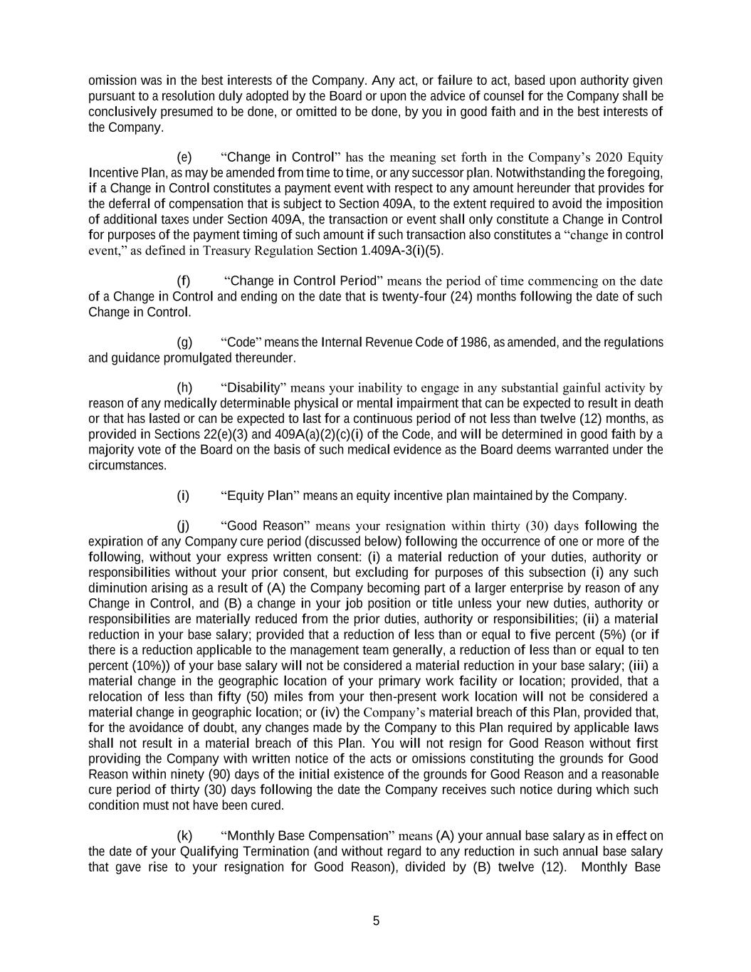 5 omission was in the best interests of the Company. Any act, or failure to act, based upon authority given pursuant to a resolution duly adopted by the Board or upon the advice of counsel for the Company shall be conclusively presumed to be done, or omitted to be done, by you in good faith and in the best interests of the Company. (e) “Change in Control” has the meaning set forth in the Company’s 2020 Equity Incentive Plan, as may be amended from time to time, or any successor plan. Notwithstanding the foregoing, if a Change in Control constitutes a payment event with respect to any amount hereunder that provides for the deferral of compensation that is subject to Section 409A, to the extent required to avoid the imposition of additional taxes under Section 409A, the transaction or event shall only constitute a Change in Control for purposes of the payment timing of such amount if such transaction also constitutes a “change in control event,” as defined in Treasury Regulation Section 1.409A-3(i)(5). (f) “Change in Control Period” means the period of time commencing on the date of a Change in Control and ending on the date that is twenty-four (24) months following the date of such Change in Control. (g) “Code” means the Internal Revenue Code of 1986, as amended, and the regulations and guidance promulgated thereunder. (h) “Disability” means your inability to engage in any substantial gainful activity by reason of any medically determinable physical or mental impairment that can be expected to result in death or that has lasted or can be expected to last for a continuous period of not less than twelve (12) months, as provided in Sections 22(e)(3) and 409A(a)(2)(c)(i) of the Code, and will be determined in good faith by a majority vote of the Board on the basis of such medical evidence as the Board deems warranted under the circumstances. (i) “Equity Plan” means an equity incentive plan maintained by the Company. (j) “Good Reason” means your resignation within thirty (30) days following the expiration of any Company cure period (discussed below) following the occurrence of one or more of the following, without your express written consent: (i) a material reduction of your duties, authority or responsibilities without your prior consent, but excluding for purposes of this subsection (i) any such diminution arising as a result of (A) the Company becoming part of a larger enterprise by reason of any Change in Control, and (B) a change in your job position or title unless your new duties, authority or responsibilities are materially reduced from the prior duties, authority or responsibilities; (ii) a material reduction in your base salary; provided that a reduction of less than or equal to five percent (5%) (or if there is a reduction applicable to the management team generally, a reduction of less than or equal to ten percent (10%)) of your base salary will not be considered a material reduction in your base salary; (iii) a material change in the geographic location of your primary work facility or location; provided, that a relocation of less than fifty (50) miles from your then-present work location will not be considered a material change in geographic location; or (iv) the Company’s material breach of this Plan, provided that, for the avoidance of doubt, any changes made by the Company to this Plan required by applicable laws shall not result in a material breach of this Plan. You will not resign for Good Reason without first providing the Company with written notice of the acts or omissions constituting the grounds for Good Reason within ninety (90) days of the initial existence of the grounds for Good Reason and a reasonable cure period of thirty (30) days following the date the Company receives such notice during which such condition must not have been cured. (k) “Monthly Base Compensation” means (A) your annual base salary as in effect on the date of your Qualifying Termination (and without regard to any reduction in such annual base salary that gave rise to your resignation for Good Reason), divided by (B) twelve (12). Monthly Base