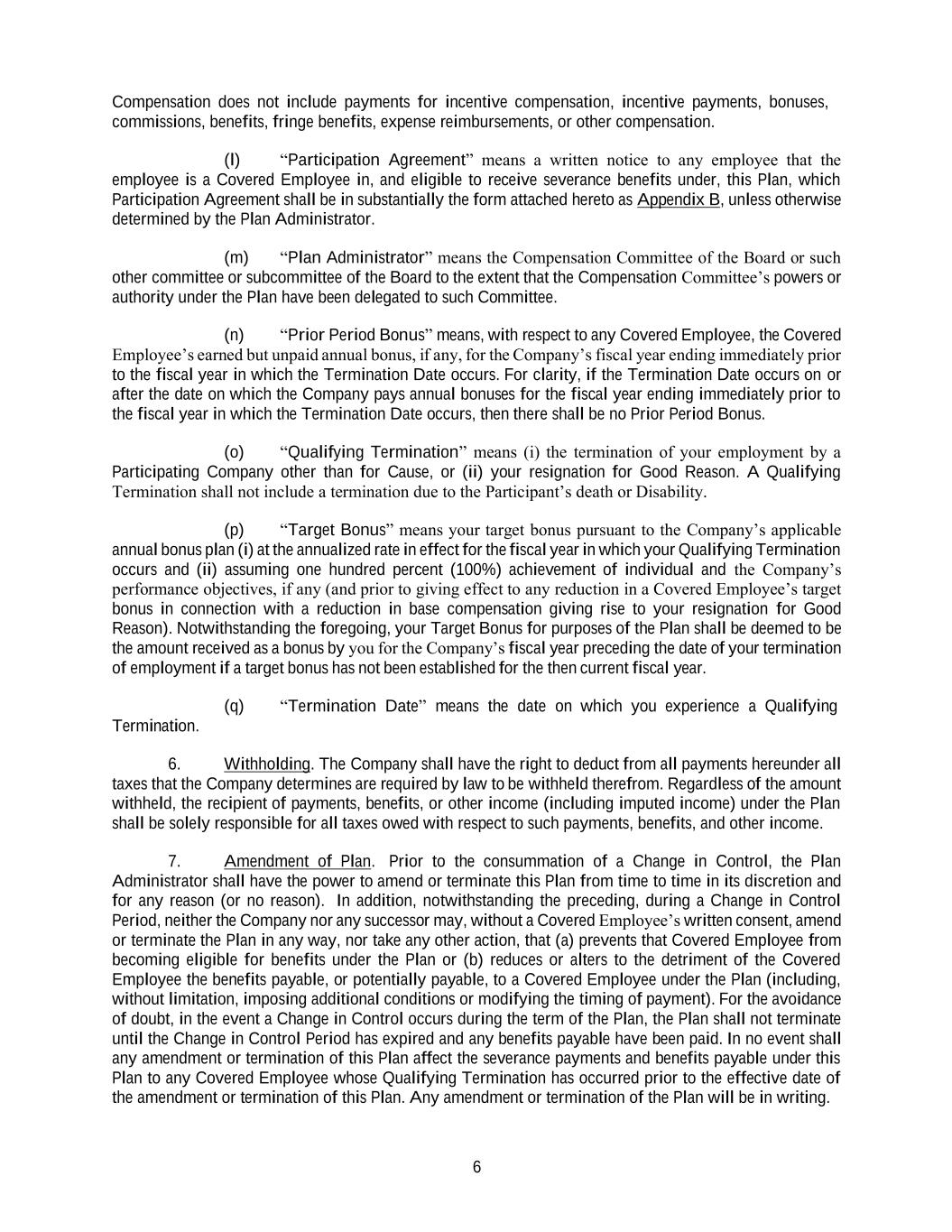 6 Compensation does not include payments for incentive compensation, incentive payments, bonuses, commissions, benefits, fringe benefits, expense reimbursements, or other compensation. (l) “Participation Agreement” means a written notice to any employee that the employee is a Covered Employee in, and eligible to receive severance benefits under, this Plan, which Participation Agreement shall be in substantially the form attached hereto as Appendix B, unless otherwise determined by the Plan Administrator. (m) “Plan Administrator” means the Compensation Committee of the Board or such other committee or subcommittee of the Board to the extent that the Compensation Committee’s powers or authority under the Plan have been delegated to such Committee. (n) “Prior Period Bonus” means, with respect to any Covered Employee, the Covered Employee’s earned but unpaid annual bonus, if any, for the Company’s fiscal year ending immediately prior to the fiscal year in which the Termination Date occurs. For clarity, if the Termination Date occurs on or after the date on which the Company pays annual bonuses for the fiscal year ending immediately prior to the fiscal year in which the Termination Date occurs, then there shall be no Prior Period Bonus. (o) “Qualifying Termination” means (i) the termination of your employment by a Participating Company other than for Cause, or (ii) your resignation for Good Reason. A Qualifying Termination shall not include a termination due to the Participant’s death or Disability. (p) “Target Bonus” means your target bonus pursuant to the Company’s applicable annual bonus plan (i) at the annualized rate in effect for the fiscal year in which your Qualifying Termination occurs and (ii) assuming one hundred percent (100%) achievement of individual and the Company’s performance objectives, if any (and prior to giving effect to any reduction in a Covered Employee’s target bonus in connection with a reduction in base compensation giving rise to your resignation for Good Reason). Notwithstanding the foregoing, your Target Bonus for purposes of the Plan shall be deemed to be the amount received as a bonus by you for the Company’s fiscal year preceding the date of your termination of employment if a target bonus has not been established for the then current fiscal year. (q) “Termination Date” means the date on which you experience a Qualifying Termination. 6. Withholding. The Company shall have the right to deduct from all payments hereunder all taxes that the Company determines are required by law to be withheld therefrom. Regardless of the amount withheld, the recipient of payments, benefits, or other income (including imputed income) under the Plan shall be solely responsible for all taxes owed with respect to such payments, benefits, and other income. 7. Amendment of Plan. Prior to the consummation of a Change in Control, the Plan Administrator shall have the power to amend or terminate this Plan from time to time in its discretion and for any reason (or no reason). In addition, notwithstanding the preceding, during a Change in Control Period, neither the Company nor any successor may, without a Covered Employee’s written consent, amend or terminate the Plan in any way, nor take any other action, that (a) prevents that Covered Employee from becoming eligible for benefits under the Plan or (b) reduces or alters to the detriment of the Covered Employee the benefits payable, or potentially payable, to a Covered Employee under the Plan (including, without limitation, imposing additional conditions or modifying the timing of payment). For the avoidance of doubt, in the event a Change in Control occurs during the term of the Plan, the Plan shall not terminate until the Change in Control Period has expired and any benefits payable have been paid. In no event shall any amendment or termination of this Plan affect the severance payments and benefits payable under this Plan to any Covered Employee whose Qualifying Termination has occurred prior to the effective date of the amendment or termination of this Plan. Any amendment or termination of the Plan will be in writing.