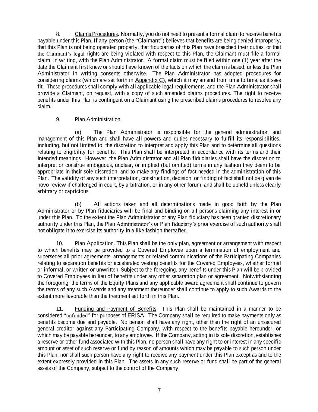 7 8. Claims Procedures. Normally, you do not need to present a formal claim to receive benefits payable under this Plan. If any person (the “Claimant”) believes that benefits are being denied improperly, that this Plan is not being operated properly, that fiduciaries of this Plan have breached their duties, or that the Claimant’s legal rights are being violated with respect to this Plan, the Claimant must file a formal claim, in writing, with the Plan Administrator. A formal claim must be filed within one (1) year after the date the Claimant first knew or should have known of the facts on which the claim is based, unless the Plan Administrator in writing consents otherwise. The Plan Administrator has adopted procedures for considering claims (which are set forth in Appendix C), which it may amend from time to time, as it sees fit. These procedures shall comply with all applicable legal requirements, and the Plan Administrator shall provide a Claimant, on request, with a copy of such amended claims procedures. The right to receive benefits under this Plan is contingent on a Claimant using the prescribed claims procedures to resolve any claim. 9. Plan Administration. (a) The Plan Administrator is responsible for the general administration and management of this Plan and shall have all powers and duties necessary to fulfill its responsibilities, including, but not limited to, the discretion to interpret and apply this Plan and to determine all questions relating to eligibility for benefits. This Plan shall be interpreted in accordance with its terms and their intended meanings. However, the Plan Administrator and all Plan fiduciaries shall have the discretion to interpret or construe ambiguous, unclear, or implied (but omitted) terms in any fashion they deem to be appropriate in their sole discretion, and to make any findings of fact needed in the administration of this Plan. The validity of any such interpretation, construction, decision, or finding of fact shall not be given de novo review if challenged in court, by arbitration, or in any other forum, and shall be upheld unless clearly arbitrary or capricious. (b) All actions taken and all determinations made in good faith by the Plan Administrator or by Plan fiduciaries will be final and binding on all persons claiming any interest in or under this Plan. To the extent the Plan Administrator or any Plan fiduciary has been granted discretionary authority under this Plan, the Plan Administrator’s or Plan fiduciary’s prior exercise of such authority shall not obligate it to exercise its authority in a like fashion thereafter. 10. Plan Application. This Plan shall be the only plan, agreement or arrangement with respect to which benefits may be provided to a Covered Employee upon a termination of employment and supersedes all prior agreements, arrangements or related communications of the Participating Companies relating to separation benefits or accelerated vesting benefits for the Covered Employees, whether formal or informal, or written or unwritten. Subject to the foregoing, any benefits under this Plan will be provided to Covered Employees in lieu of benefits under any other separation plan or agreement. Notwithstanding the foregoing, the terms of the Equity Plans and any applicable award agreement shall continue to govern the terms of any such Awards and any treatment thereunder shall continue to apply to such Awards to the extent more favorable than the treatment set forth in this Plan. 11. Funding and Payment of Benefits. This Plan shall be maintained in a manner to be considered “unfunded” for purposes of ERISA. The Company shall be required to make payments only as benefits become due and payable. No person shall have any right, other than the right of an unsecured general creditor against any Participating Company, with respect to the benefits payable hereunder, or which may be payable hereunder, to any employee. If the Company, acting in its sole discretion, establishes a reserve or other fund associated with this Plan, no person shall have any right to or interest in any specific amount or asset of such reserve or fund by reason of amounts which may be payable to such person under this Plan, nor shall such person have any right to receive any payment under this Plan except as and to the extent expressly provided in this Plan. The assets in any such reserve or fund shall be part of the general assets of the Company, subject to the control of the Company.