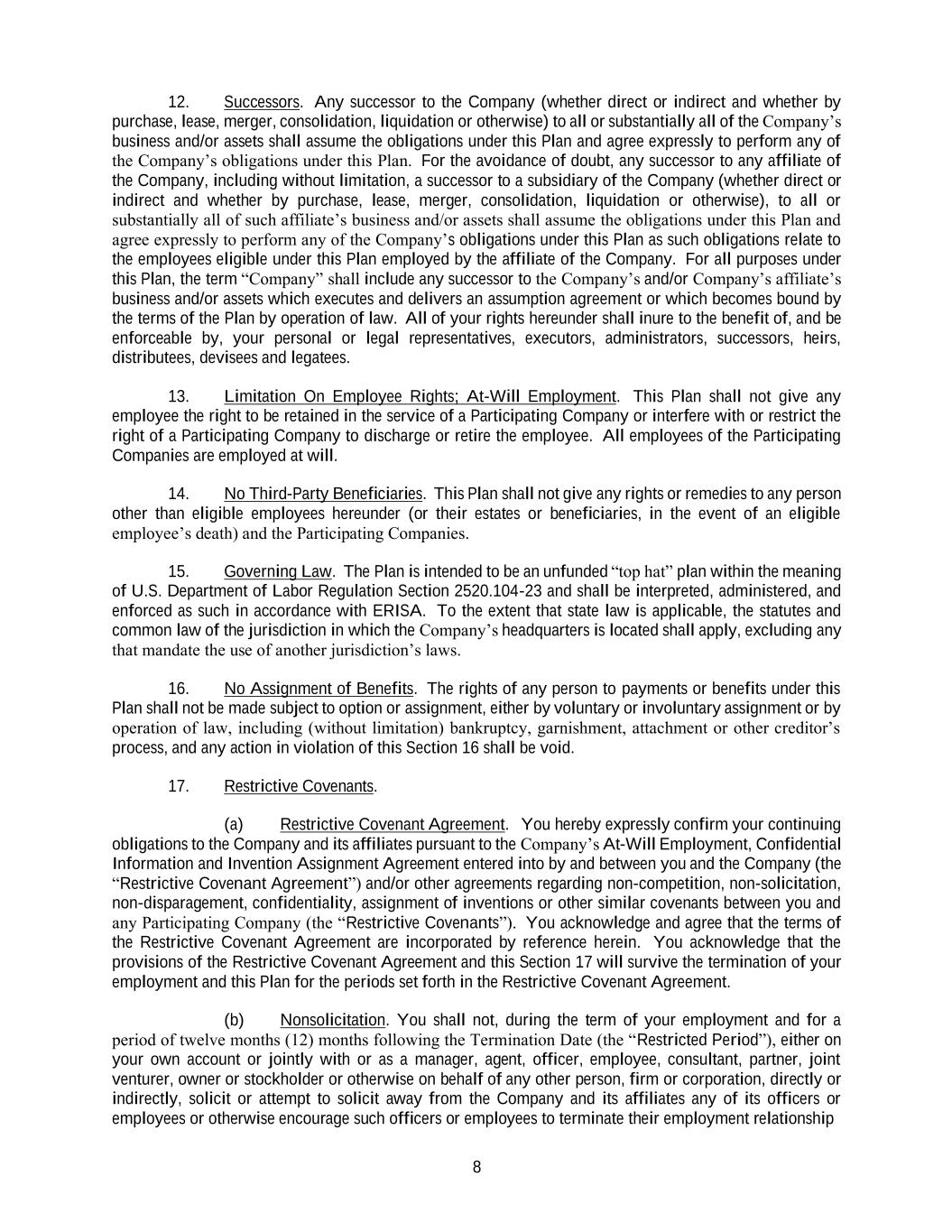 8 12. Successors. Any successor to the Company (whether direct or indirect and whether by purchase, lease, merger, consolidation, liquidation or otherwise) to all or substantially all of the Company’s business and/or assets shall assume the obligations under this Plan and agree expressly to perform any of the Company’s obligations under this Plan. For the avoidance of doubt, any successor to any affiliate of the Company, including without limitation, a successor to a subsidiary of the Company (whether direct or indirect and whether by purchase, lease, merger, consolidation, liquidation or otherwise), to all or substantially all of such affiliate’s business and/or assets shall assume the obligations under this Plan and agree expressly to perform any of the Company’s obligations under this Plan as such obligations relate to the employees eligible under this Plan employed by the affiliate of the Company. For all purposes under this Plan, the term “Company” shall include any successor to the Company’s and/or Company’s affiliate’s business and/or assets which executes and delivers an assumption agreement or which becomes bound by the terms of the Plan by operation of law. All of your rights hereunder shall inure to the benefit of, and be enforceable by, your personal or legal representatives, executors, administrators, successors, heirs, distributees, devisees and legatees. 13. Limitation On Employee Rights; At-Will Employment. This Plan shall not give any employee the right to be retained in the service of a Participating Company or interfere with or restrict the right of a Participating Company to discharge or retire the employee. All employees of the Participating Companies are employed at will. 14. No Third-Party Beneficiaries. This Plan shall not give any rights or remedies to any person other than eligible employees hereunder (or their estates or beneficiaries, in the event of an eligible employee’s death) and the Participating Companies. 15. Governing Law. The Plan is intended to be an unfunded “top hat” plan within the meaning of U.S. Department of Labor Regulation Section 2520.104-23 and shall be interpreted, administered, and enforced as such in accordance with ERISA. To the extent that state law is applicable, the statutes and common law of the jurisdiction in which the Company’s headquarters is located shall apply, excluding any that mandate the use of another jurisdiction’s laws. 16. No Assignment of Benefits. The rights of any person to payments or benefits under this Plan shall not be made subject to option or assignment, either by voluntary or involuntary assignment or by operation of law, including (without limitation) bankruptcy, garnishment, attachment or other creditor’s process, and any action in violation of this Section 16 shall be void. 17. Restrictive Covenants. (a) Restrictive Covenant Agreement. You hereby expressly confirm your continuing obligations to the Company and its affiliates pursuant to the Company’s At-Will Employment, Confidential Information and Invention Assignment Agreement entered into by and between you and the Company (the “Restrictive Covenant Agreement”) and/or other agreements regarding non-competition, non-solicitation, non-disparagement, confidentiality, assignment of inventions or other similar covenants between you and any Participating Company (the “Restrictive Covenants”). You acknowledge and agree that the terms of the Restrictive Covenant Agreement are incorporated by reference herein. You acknowledge that the provisions of the Restrictive Covenant Agreement and this Section 17 will survive the termination of your employment and this Plan for the periods set forth in the Restrictive Covenant Agreement. (b) Nonsolicitation. You shall not, during the term of your employment and for a period of twelve months (12) months following the Termination Date (the “Restricted Period”), either on your own account or jointly with or as a manager, agent, officer, employee, consultant, partner, joint venturer, owner or stockholder or otherwise on behalf of any other person, firm or corporation, directly or indirectly, solicit or attempt to solicit away from the Company and its affiliates any of its officers or employees or otherwise encourage such officers or employees to terminate their employment relationship