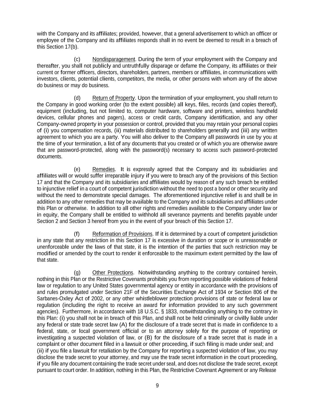 9 with the Company and its affiliates; provided, however, that a general advertisement to which an officer or employee of the Company and its affiliates responds shall in no event be deemed to result in a breach of this Section 17(b). (c) Nondisparagement. During the term of your employment with the Company and thereafter, you shall not publicly and untruthfully disparage or defame the Company, its affiliates or their current or former officers, directors, shareholders, partners, members or affiliates, in communications with investors, clients, potential clients, competitors, the media, or other persons with whom any of the above do business or may do business. (d) Return of Property. Upon the termination of your employment, you shall return to the Company in good working order (to the extent possible) all keys, files, records (and copies thereof), equipment (including, but not limited to, computer hardware, software and printers, wireless handheld devices, cellular phones and pagers), access or credit cards, Company identification, and any other Company-owned property in your possession or control, provided that you may retain your personal copies of (i) you compensation records, (ii) materials distributed to shareholders generally and (iii) any written agreement to which you are a party. You will also deliver to the Company all passwords in use by you at the time of your termination, a list of any documents that you created or of which you are otherwise aware that are password-protected, along with the password(s) necessary to access such password-protected documents. (e) Remedies. It is expressly agreed that the Company and its subsidiaries and affiliates will or would suffer irreparable injury if you were to breach any of the provisions of this Section 17 and that the Company and its subsidiaries and affiliates would by reason of any such breach be entitled to injunctive relief in a court of competent jurisdiction without the need to post a bond or other security and without the need to demonstrate special damages. The aforementioned injunctive relief is and shall be in addition to any other remedies that may be available to the Company and its subsidiaries and affiliates under this Plan or otherwise. In addition to all other rights and remedies available to the Company under law or in equity, the Company shall be entitled to withhold all severance payments and benefits payable under Section 2 and Section 3 hereof from you in the event of your breach of this Section 17. (f) Reformation of Provisions. If it is determined by a court of competent jurisdiction in any state that any restriction in this Section 17 is excessive in duration or scope or is unreasonable or unenforceable under the laws of that state, it is the intention of the parties that such restriction may be modified or amended by the court to render it enforceable to the maximum extent permitted by the law of that state. (g) Other Protections. Notwithstanding anything to the contrary contained herein, nothing in this Plan or the Restrictive Covenants prohibits you from reporting possible violations of federal law or regulation to any United States governmental agency or entity in accordance with the provisions of and rules promulgated under Section 21F of the Securities Exchange Act of 1934 or Section 806 of the Sarbanes-Oxley Act of 2002, or any other whistleblower protection provisions of state or federal law or regulation (including the right to receive an award for information provided to any such government agencies). Furthermore, in accordance with 18 U.S.C. § 1833, notwithstanding anything to the contrary in this Plan: (i) you shall not be in breach of this Plan, and shall not be held criminally or civilly liable under any federal or state trade secret law (A) for the disclosure of a trade secret that is made in confidence to a federal, state, or local government official or to an attorney solely for the purpose of reporting or investigating a suspected violation of law, or (B) for the disclosure of a trade secret that is made in a complaint or other document filed in a lawsuit or other proceeding, if such filing is made under seal; and (ii) if you file a lawsuit for retaliation by the Company for reporting a suspected violation of law, you may disclose the trade secret to your attorney, and may use the trade secret information in the court proceeding, if you file any document containing the trade secret under seal, and does not disclose the trade secret, except pursuant to court order. In addition, nothing in this Plan, the Restrictive Covenant Agreement or any Release