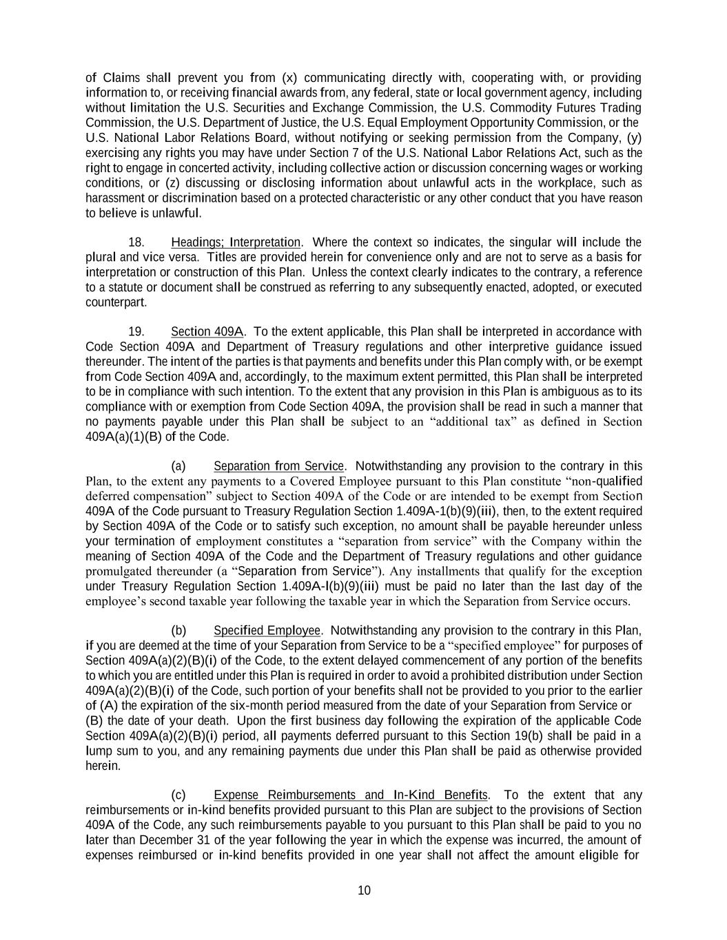 10 of Claims shall prevent you from (x) communicating directly with, cooperating with, or providing information to, or receiving financial awards from, any federal, state or local government agency, including without limitation the U.S. Securities and Exchange Commission, the U.S. Commodity Futures Trading Commission, the U.S. Department of Justice, the U.S. Equal Employment Opportunity Commission, or the U.S. National Labor Relations Board, without notifying or seeking permission from the Company, (y) exercising any rights you may have under Section 7 of the U.S. National Labor Relations Act, such as the right to engage in concerted activity, including collective action or discussion concerning wages or working conditions, or (z) discussing or disclosing information about unlawful acts in the workplace, such as harassment or discrimination based on a protected characteristic or any other conduct that you have reason to believe is unlawful. 18. Headings; Interpretation. Where the context so indicates, the singular will include the plural and vice versa. Titles are provided herein for convenience only and are not to serve as a basis for interpretation or construction of this Plan. Unless the context clearly indicates to the contrary, a reference to a statute or document shall be construed as referring to any subsequently enacted, adopted, or executed counterpart. 19. Section 409A. To the extent applicable, this Plan shall be interpreted in accordance with Code Section 409A and Department of Treasury regulations and other interpretive guidance issued thereunder. The intent of the parties is that payments and benefits under this Plan comply with, or be exempt from Code Section 409A and, accordingly, to the maximum extent permitted, this Plan shall be interpreted to be in compliance with such intention. To the extent that any provision in this Plan is ambiguous as to its compliance with or exemption from Code Section 409A, the provision shall be read in such a manner that no payments payable under this Plan shall be subject to an “additional tax” as defined in Section 409A(a)(1)(B) of the Code. (a) Separation from Service. Notwithstanding any provision to the contrary in this Plan, to the extent any payments to a Covered Employee pursuant to this Plan constitute “non-qualified deferred compensation” subject to Section 409A of the Code or are intended to be exempt from Section 409A of the Code pursuant to Treasury Regulation Section 1.409A-1(b)(9)(iii), then, to the extent required by Section 409A of the Code or to satisfy such exception, no amount shall be payable hereunder unless your termination of employment constitutes a “separation from service” with the Company within the meaning of Section 409A of the Code and the Department of Treasury regulations and other guidance promulgated thereunder (a “Separation from Service”). Any installments that qualify for the exception under Treasury Regulation Section 1.409A-l(b)(9)(iii) must be paid no later than the last day of the employee’s second taxable year following the taxable year in which the Separation from Service occurs. (b) Specified Employee. Notwithstanding any provision to the contrary in this Plan, if you are deemed at the time of your Separation from Service to be a “specified employee” for purposes of Section 409A(a)(2)(B)(i) of the Code, to the extent delayed commencement of any portion of the benefits to which you are entitled under this Plan is required in order to avoid a prohibited distribution under Section 409A(a)(2)(B)(i) of the Code, such portion of your benefits shall not be provided to you prior to the earlier of (A) the expiration of the six-month period measured from the date of your Separation from Service or (B) the date of your death. Upon the first business day following the expiration of the applicable Code Section 409A(a)(2)(B)(i) period, all payments deferred pursuant to this Section 19(b) shall be paid in a lump sum to you, and any remaining payments due under this Plan shall be paid as otherwise provided herein. (c) Expense Reimbursements and In-Kind Benefits. To the extent that any reimbursements or in-kind benefits provided pursuant to this Plan are subject to the provisions of Section 409A of the Code, any such reimbursements payable to you pursuant to this Plan shall be paid to you no later than December 31 of the year following the year in which the expense was incurred, the amount of expenses reimbursed or in-kind benefits provided in one year shall not affect the amount eligible for