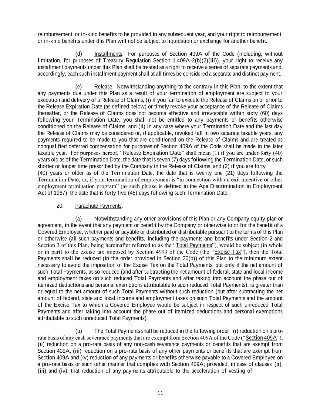 11 reimbursement or in-kind benefits to be provided in any subsequent year, and your right to reimbursement or in-kind benefits under this Plan will not be subject to liquidation or exchange for another benefit. (d) Installments. For purposes of Section 409A of the Code (including, without limitation, for purposes of Treasury Regulation Section 1.409A-2(b)(2)(iii)), your right to receive any installment payments under this Plan shall be treated as a right to receive a series of separate payments and, accordingly, each such installment payment shall at all times be considered a separate and distinct payment. (e) Release. Notwithstanding anything to the contrary in this Plan, to the extent that any payments due under this Plan as a result of your termination of employment are subject to your execution and delivery of a Release of Claims, (i) if you fail to execute the Release of Claims on or prior to the Release Expiration Date (as defined below) or timely revoke your acceptance of the Release of Claims thereafter, or the Release of Claims does not become effective and irrevocable within sixty (60) days following your Termination Date, you shall not be entitled to any payments or benefits otherwise conditioned on the Release of Claims, and (ii) in any case where your Termination Date and the last day the Release of Claims may be considered or, if applicable, revoked fall in two separate taxable years, any payments required to be made to you that are conditioned on the Release of Claims and are treated as nonqualified deferred compensation for purposes of Section 409A of the Code shall be made in the later taxable year. For purposes hereof, “Release Expiration Date” shall mean (1) if you are under forty (40) years old as of the Termination Date, the date that is seven (7) days following the Termination Date, or such shorter or longer time prescribed by the Company in the Release of Claims, and (2) if you are forty (40) years or older as of the Termination Date, the date that is twenty one (21) days following the Termination Date, or, if your termination of employment is “in connection with an exit incentive or other employment termination program” (as such phrase is defined in the Age Discrimination in Employment Act of 1967), the date that is forty five (45) days following such Termination Date. 20. Parachute Payments. (a) Notwithstanding any other provisions of this Plan or any Company equity plan or agreement, in the event that any payment or benefit by the Company or otherwise to or for the benefit of a Covered Employee, whether paid or payable or distributed or distributable pursuant to the terms of this Plan or otherwise (all such payments and benefits, including the payments and benefits under Section 2 and Section 3 of this Plan, being hereinafter referred to as the “Total Payments”), would be subject (in whole or in part) to the excise tax imposed by Section 4999 of the Code (the “Excise Tax”), then the Total Payments shall be reduced (in the order provided in Section 20(b)) of this Plan to the minimum extent necessary to avoid the imposition of the Excise Tax on the Total Payments, but only if the net amount of such Total Payments, as so reduced (and after subtracting the net amount of federal, state and local income and employment taxes on such reduced Total Payments and after taking into account the phase out of itemized deductions and personal exemptions attributable to such reduced Total Payments), is greater than or equal to the net amount of such Total Payments without such reduction (but after subtracting the net amount of federal, state and local income and employment taxes on such Total Payments and the amount of the Excise Tax to which a Covered Employee would be subject in respect of such unreduced Total Payments and after taking into account the phase out of itemized deductions and personal exemptions attributable to such unreduced Total Payments). (b) The Total Payments shall be reduced in the following order: (i) reduction on a pro- rata basis of any cash severance payments that are exempt from Section 409A of the Code (“Section 409A”), (ii) reduction on a pro-rata basis of any non-cash severance payments or benefits that are exempt from Section 409A, (iii) reduction on a pro-rata basis of any other payments or benefits that are exempt from Section 409A and (iv) reduction of any payments or benefits otherwise payable to a Covered Employee on a pro-rata basis or such other manner that complies with Section 409A; provided, in case of clauses (ii), (iii) and (iv), that reduction of any payments attributable to the acceleration of vesting of