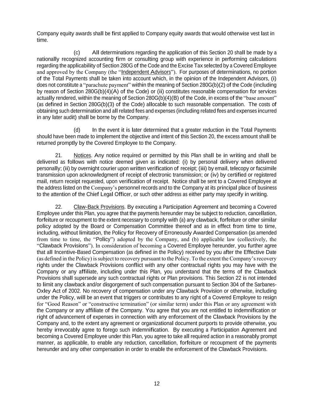 12 Company equity awards shall be first applied to Company equity awards that would otherwise vest last in time. (c) All determinations regarding the application of this Section 20 shall be made by a nationally recognized accounting firm or consulting group with experience in performing calculations regarding the applicability of Section 280G of the Code and the Excise Tax selected by a Covered Employee and approved by the Company (the “Independent Advisors”). For purposes of determinations, no portion of the Total Payments shall be taken into account which, in the opinion of the Independent Advisors, (i) does not constitute a “parachute payment” within the meaning of Section 280G(b)(2) of the Code (including by reason of Section 280G(b)(4)(A) of the Code) or (ii) constitutes reasonable compensation for services actually rendered, within the meaning of Section 280G(b)(4)(B) of the Code, in excess of the “base amount” (as defined in Section 280G(b)(3) of the Code) allocable to such reasonable compensation. The costs of obtaining such determination and all related fees and expenses (including related fees and expenses incurred in any later audit) shall be borne by the Company. (d) In the event it is later determined that a greater reduction in the Total Payments should have been made to implement the objective and intent of this Section 20, the excess amount shall be returned promptly by the Covered Employee to the Company. 21. Notices. Any notice required or permitted by this Plan shall be in writing and shall be delivered as follows with notice deemed given as indicated: (i) by personal delivery when delivered personally; (ii) by overnight courier upon written verification of receipt; (iii) by email, telecopy or facsimile transmission upon acknowledgment of receipt of electronic transmission; or (iv) by certified or registered mail, return receipt requested, upon verification of receipt. Notice shall be sent to a Covered Employee at the address listed on the Company’s personnel records and to the Company at its principal place of business to the attention of the Chief Legal Officer, or such other address as either party may specify in writing. 22. Claw-Back Provisions. By executing a Participation Agreement and becoming a Covered Employee under this Plan, you agree that the payments hereunder may be subject to reduction, cancellation, forfeiture or recoupment to the extent necessary to comply with (a) any clawback, forfeiture or other similar policy adopted by the Board or Compensation Committee thereof and as in effect from time to time, including, without limitation, the Policy for Recovery of Erroneously Awarded Compensation (as amended from time to time, the “Policy”) adopted by the Company, and (b) applicable law (collectively, the “Clawback Provisions”). In consideration of becoming a Covered Employee hereunder, you further agree that all Incentive-Based Compensation (as defined in the Policy) received by you after the Effective Date (as defined in the Policy) is subject to recovery pursuant to the Policy. To the extent the Company’s recovery rights under the Clawback Provisions conflict with any other contractual rights you may have with the Company or any affiliate, including under this Plan, you understand that the terms of the Clawback Provisions shall supersede any such contractual rights or Plan provisions. This Section 22 is not intended to limit any clawback and/or disgorgement of such compensation pursuant to Section 304 of the Sarbanes- Oxley Act of 2002. No recovery of compensation under any Clawback Provision or otherwise, including under the Policy, will be an event that triggers or contributes to any right of a Covered Employee to resign for “Good Reason” or “constructive termination” (or similar term) under this Plan or any agreement with the Company or any affiliate of the Company. You agree that you are not entitled to indemnification or right of advancement of expenses in connection with any enforcement of the Clawback Provisions by the Company and, to the extent any agreement or organizational document purports to provide otherwise, you hereby irrevocably agree to forego such indemnification. By executing a Participation Agreement and becoming a Covered Employee under this Plan, you agree to take all required action in a reasonably prompt manner, as applicable, to enable any reduction, cancellation, forfeiture or recoupment of the payments hereunder and any other compensation in order to enable the enforcement of the Clawback Provisions.