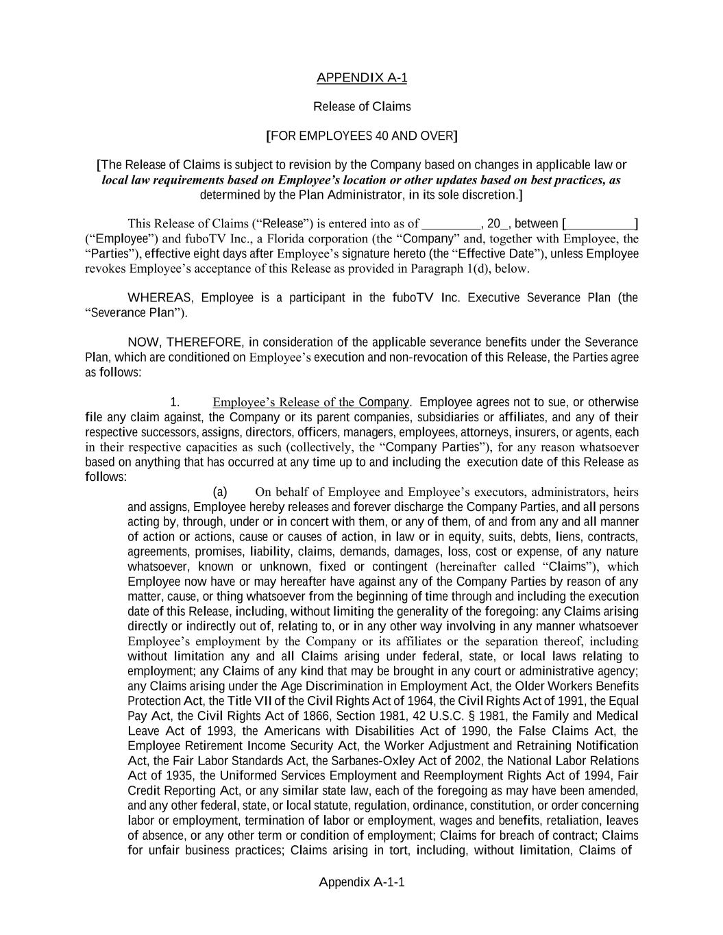 Appendix A-1-1 APPENDIX A-1 Release of Claims [FOR EMPLOYEES 40 AND OVER] [The Release of Claims is subject to revision by the Company based on changes in applicable law or local law requirements based on Employee’s location or other updates based on best practices, as determined by the Plan Administrator, in its sole discretion.] This Release of Claims (“Release”) is entered into as of , 20 , between [ ] (“Employee”) and fuboTV Inc., a Florida corporation (the “Company” and, together with Employee, the “Parties”), effective eight days after Employee’s signature hereto (the “Effective Date”), unless Employee revokes Employee’s acceptance of this Release as provided in Paragraph 1(d), below. WHEREAS, Employee is a participant in the fuboTV Inc. Executive Severance Plan (the “Severance Plan”). NOW, THEREFORE, in consideration of the applicable severance benefits under the Severance Plan, which are conditioned on Employee’s execution and non-revocation of this Release, the Parties agree as follows: 1. Employee’s Release of the Company. Employee agrees not to sue, or otherwise file any claim against, the Company or its parent companies, subsidiaries or affiliates, and any of their respective successors, assigns, directors, officers, managers, employees, attorneys, insurers, or agents, each in their respective capacities as such (collectively, the “Company Parties”), for any reason whatsoever based on anything that has occurred at any time up to and including the execution date of this Release as follows: (a) On behalf of Employee and Employee’s executors, administrators, heirs and assigns, Employee hereby releases and forever discharge the Company Parties, and all persons acting by, through, under or in concert with them, or any of them, of and from any and all manner of action or actions, cause or causes of action, in law or in equity, suits, debts, liens, contracts, agreements, promises, liability, claims, demands, damages, loss, cost or expense, of any nature whatsoever, known or unknown, fixed or contingent (hereinafter called “Claims”), which Employee now have or may hereafter have against any of the Company Parties by reason of any matter, cause, or thing whatsoever from the beginning of time through and including the execution date of this Release, including, without limiting the generality of the foregoing: any Claims arising directly or indirectly out of, relating to, or in any other way involving in any manner whatsoever Employee’s employment by the Company or its affiliates or the separation thereof, including without limitation any and all Claims arising under federal, state, or local laws relating to employment; any Claims of any kind that may be brought in any court or administrative agency; any Claims arising under the Age Discrimination in Employment Act, the Older Workers Benefits Protection Act, the Title VII of the Civil Rights Act of 1964, the Civil Rights Act of 1991, the Equal Pay Act, the Civil Rights Act of 1866, Section 1981, 42 U.S.C. § 1981, the Family and Medical Leave Act of 1993, the Americans with Disabilities Act of 1990, the False Claims Act, the Employee Retirement Income Security Act, the Worker Adjustment and Retraining Notification Act, the Fair Labor Standards Act, the Sarbanes-Oxley Act of 2002, the National Labor Relations Act of 1935, the Uniformed Services Employment and Reemployment Rights Act of 1994, Fair Credit Reporting Act, or any similar state law, each of the foregoing as may have been amended, and any other federal, state, or local statute, regulation, ordinance, constitution, or order concerning labor or employment, termination of labor or employment, wages and benefits, retaliation, leaves of absence, or any other term or condition of employment; Claims for breach of contract; Claims for unfair business practices; Claims arising in tort, including, without limitation, Claims of