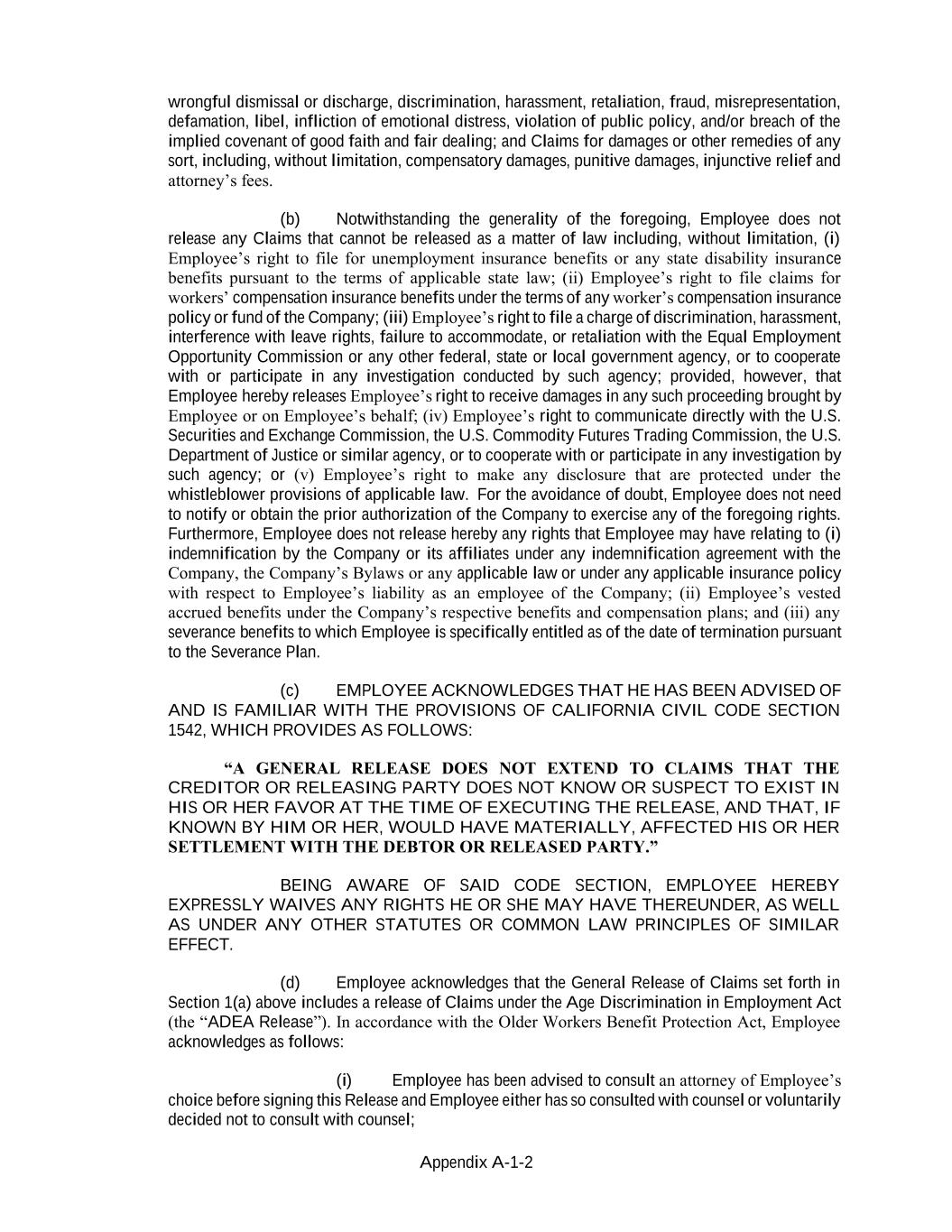 Appendix A-1-2 wrongful dismissal or discharge, discrimination, harassment, retaliation, fraud, misrepresentation, defamation, libel, infliction of emotional distress, violation of public policy, and/or breach of the implied covenant of good faith and fair dealing; and Claims for damages or other remedies of any sort, including, without limitation, compensatory damages, punitive damages, injunctive relief and attorney’s fees. (b) Notwithstanding the generality of the foregoing, Employee does not release any Claims that cannot be released as a matter of law including, without limitation, (i) Employee’s right to file for unemployment insurance benefits or any state disability insurance benefits pursuant to the terms of applicable state law; (ii) Employee’s right to file claims for workers’ compensation insurance benefits under the terms of any worker’s compensation insurance policy or fund of the Company; (iii) Employee’s right to file a charge of discrimination, harassment, interference with leave rights, failure to accommodate, or retaliation with the Equal Employment Opportunity Commission or any other federal, state or local government agency, or to cooperate with or participate in any investigation conducted by such agency; provided, however, that Employee hereby releases Employee’s right to receive damages in any such proceeding brought by Employee or on Employee’s behalf; (iv) Employee’s right to communicate directly with the U.S. Securities and Exchange Commission, the U.S. Commodity Futures Trading Commission, the U.S. Department of Justice or similar agency, or to cooperate with or participate in any investigation by such agency; or (v) Employee’s right to make any disclosure that are protected under the whistleblower provisions of applicable law. For the avoidance of doubt, Employee does not need to notify or obtain the prior authorization of the Company to exercise any of the foregoing rights. Furthermore, Employee does not release hereby any rights that Employee may have relating to (i) indemnification by the Company or its affiliates under any indemnification agreement with the Company, the Company’s Bylaws or any applicable law or under any applicable insurance policy with respect to Employee’s liability as an employee of the Company; (ii) Employee’s vested accrued benefits under the Company’s respective benefits and compensation plans; and (iii) any severance benefits to which Employee is specifically entitled as of the date of termination pursuant to the Severance Plan. (c) EMPLOYEE ACKNOWLEDGES THAT HE HAS BEEN ADVISED OF AND IS FAMILIAR WITH THE PROVISIONS OF CALIFORNIA CIVIL CODE SECTION 1542, WHICH PROVIDES AS FOLLOWS: “A GENERAL RELEASE DOES NOT EXTEND TO CLAIMS THAT THE CREDITOR OR RELEASING PARTY DOES NOT KNOW OR SUSPECT TO EXIST IN HIS OR HER FAVOR AT THE TIME OF EXECUTING THE RELEASE, AND THAT, IF KNOWN BY HIM OR HER, WOULD HAVE MATERIALLY, AFFECTED HIS OR HER SETTLEMENT WITH THE DEBTOR OR RELEASED PARTY.” BEING AWARE OF SAID CODE SECTION, EMPLOYEE HEREBY EXPRESSLY WAIVES ANY RIGHTS HE OR SHE MAY HAVE THEREUNDER, AS WELL AS UNDER ANY OTHER STATUTES OR COMMON LAW PRINCIPLES OF SIMILAR EFFECT. (d) Employee acknowledges that the General Release of Claims set forth in Section 1(a) above includes a release of Claims under the Age Discrimination in Employment Act (the “ADEA Release”). In accordance with the Older Workers Benefit Protection Act, Employee acknowledges as follows: (i) Employee has been advised to consult an attorney of Employee’s choice before signing this Release and Employee either has so consulted with counsel or voluntarily decided not to consult with counsel;