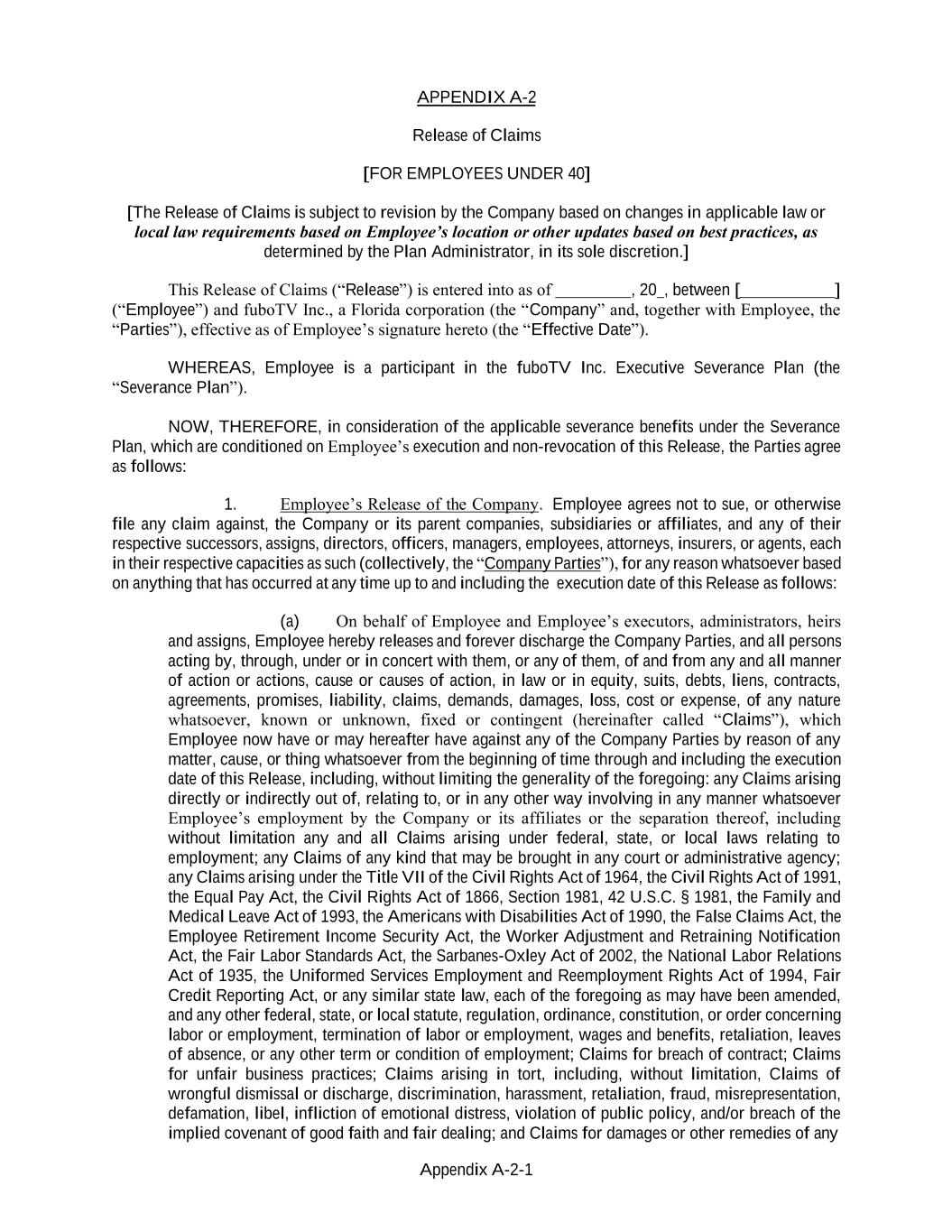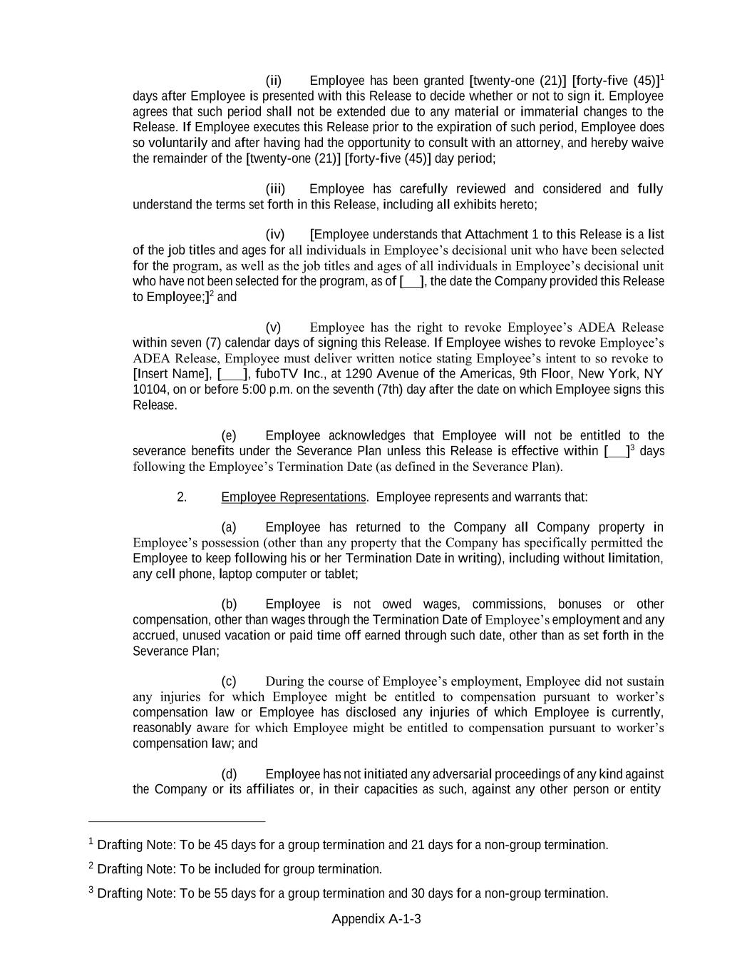 Appendix A-1-3 (ii) Employee has been granted [twenty-one (21)] [forty-five (45)]1 days after Employee is presented with this Release to decide whether or not to sign it. Employee agrees that such period shall not be extended due to any material or immaterial changes to the Release. If Employee executes this Release prior to the expiration of such period, Employee does so voluntarily and after having had the opportunity to consult with an attorney, and hereby waive the remainder of the [twenty-one (21)] [forty-five (45)] day period; (iii) Employee has carefully reviewed and considered and fully understand the terms set forth in this Release, including all exhibits hereto; (iv) [Employee understands that Attachment 1 to this Release is a list of the job titles and ages for all individuals in Employee’s decisional unit who have been selected for the program, as well as the job titles and ages of all individuals in Employee’s decisional unit who have not been selected for the program, as of [ ], the date the Company provided this Release to Employee;]2 and (v) Employee has the right to revoke Employee’s ADEA Release within seven (7) calendar days of signing this Release. If Employee wishes to revoke Employee’s ADEA Release, Employee must deliver written notice stating Employee’s intent to so revoke to [Insert Name], [ ], fuboTV Inc., at 1290 Avenue of the Americas, 9th Floor, New York, NY 10104, on or before 5:00 p.m. on the seventh (7th) day after the date on which Employee signs this Release. (e) Employee acknowledges that Employee will not be entitled to the severance benefits under the Severance Plan unless this Release is effective within [ ]3 days following the Employee’s Termination Date (as defined in the Severance Plan). 2. Employee Representations. Employee represents and warrants that: (a) Employee has returned to the Company all Company property in Employee’s possession (other than any property that the Company has specifically permitted the Employee to keep following his or her Termination Date in writing), including without limitation, any cell phone, laptop computer or tablet; (b) Employee is not owed wages, commissions, bonuses or other compensation, other than wages through the Termination Date of Employee’s employment and any accrued, unused vacation or paid time off earned through such date, other than as set forth in the Severance Plan; (c) During the course of Employee’s employment, Employee did not sustain any injuries for which Employee might be entitled to compensation pursuant to worker’s compensation law or Employee has disclosed any injuries of which Employee is currently, reasonably aware for which Employee might be entitled to compensation pursuant to worker’s compensation law; and (d) Employee has not initiated any adversarial proceedings of any kind against the Company or its affiliates or, in their capacities as such, against any other person or entity 1 Drafting Note: To be 45 days for a group termination and 21 days for a non-group termination. 2 Drafting Note: To be included for group termination. 3 Drafting Note: To be 55 days for a group termination and 30 days for a non-group termination.