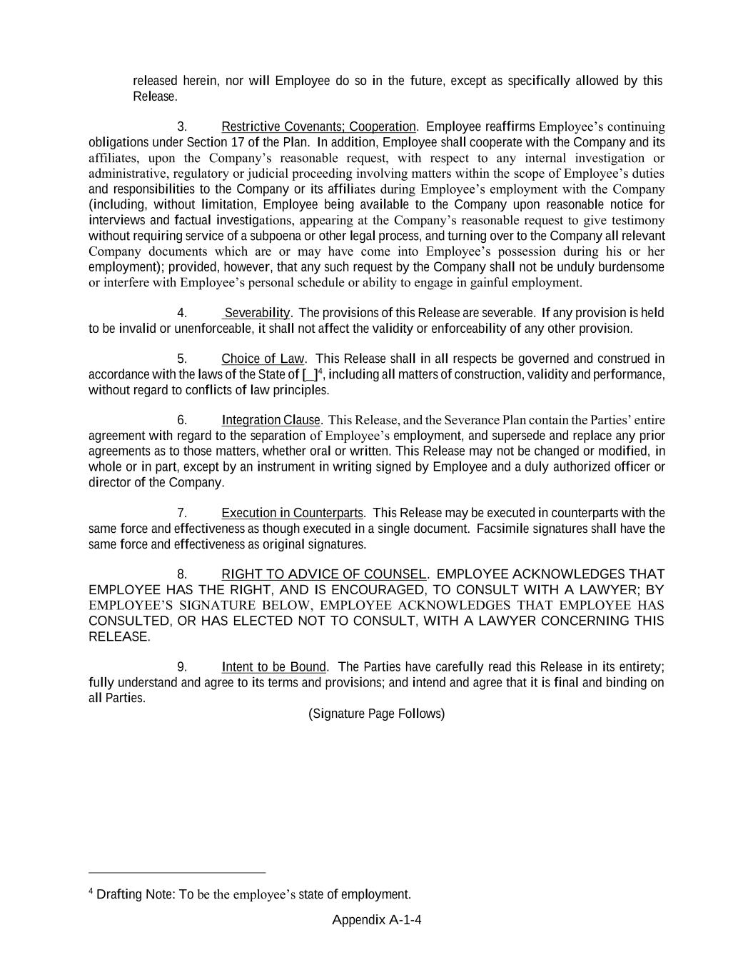 Appendix A-1-4 released herein, nor will Employee do so in the future, except as specifically allowed by this Release. 3. Restrictive Covenants; Cooperation. Employee reaffirms Employee’s continuing obligations under Section 17 of the Plan. In addition, Employee shall cooperate with the Company and its affiliates, upon the Company’s reasonable request, with respect to any internal investigation or administrative, regulatory or judicial proceeding involving matters within the scope of Employee’s duties and responsibilities to the Company or its affiliates during Employee’s employment with the Company (including, without limitation, Employee being available to the Company upon reasonable notice for interviews and factual investigations, appearing at the Company’s reasonable request to give testimony without requiring service of a subpoena or other legal process, and turning over to the Company all relevant Company documents which are or may have come into Employee’s possession during his or her employment); provided, however, that any such request by the Company shall not be unduly burdensome or interfere with Employee’s personal schedule or ability to engage in gainful employment. 4. Severability. The provisions of this Release are severable. If any provision is held to be invalid or unenforceable, it shall not affect the validity or enforceability of any other provision. 5. Choice of Law. This Release shall in all respects be governed and construed in accordance with the laws of the State of [ ]4, including all matters of construction, validity and performance, without regard to conflicts of law principles. 6. Integration Clause. This Release, and the Severance Plan contain the Parties’ entire agreement with regard to the separation of Employee’s employment, and supersede and replace any prior agreements as to those matters, whether oral or written. This Release may not be changed or modified, in whole or in part, except by an instrument in writing signed by Employee and a duly authorized officer or director of the Company. 7. Execution in Counterparts. This Release may be executed in counterparts with the same force and effectiveness as though executed in a single document. Facsimile signatures shall have the same force and effectiveness as original signatures. 8. RIGHT TO ADVICE OF COUNSEL. EMPLOYEE ACKNOWLEDGES THAT EMPLOYEE HAS THE RIGHT, AND IS ENCOURAGED, TO CONSULT WITH A LAWYER; BY EMPLOYEE’S SIGNATURE BELOW, EMPLOYEE ACKNOWLEDGES THAT EMPLOYEE HAS CONSULTED, OR HAS ELECTED NOT TO CONSULT, WITH A LAWYER CONCERNING THIS RELEASE. 9. Intent to be Bound. The Parties have carefully read this Release in its entirety; fully understand and agree to its terms and provisions; and intend and agree that it is final and binding on all Parties. (Signature Page Follows) 4 Drafting Note: To be the employee’s state of employment.