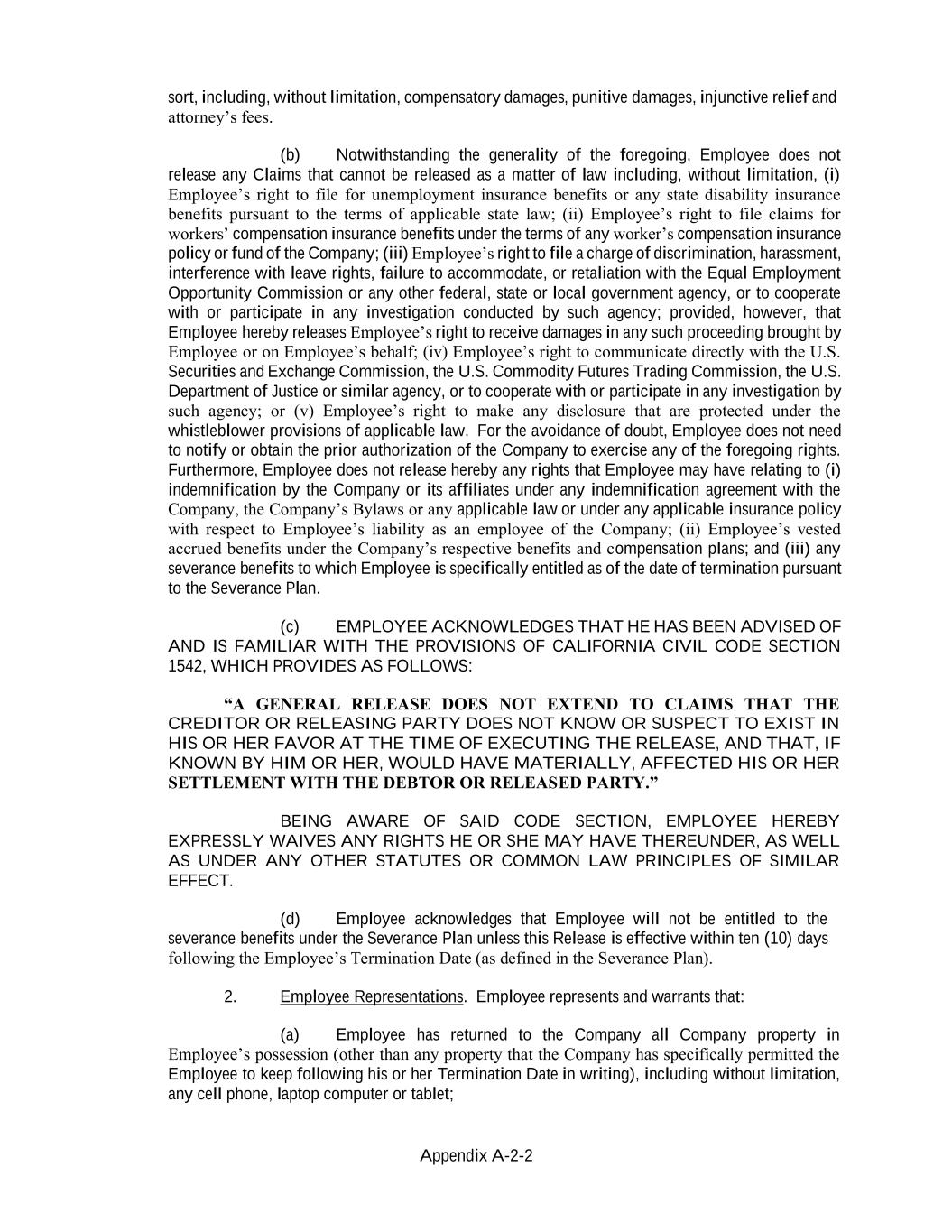 Appendix A-2-2 sort, including, without limitation, compensatory damages, punitive damages, injunctive relief and attorney’s fees. (b) Notwithstanding the generality of the foregoing, Employee does not release any Claims that cannot be released as a matter of law including, without limitation, (i) Employee’s right to file for unemployment insurance benefits or any state disability insurance benefits pursuant to the terms of applicable state law; (ii) Employee’s right to file claims for workers’ compensation insurance benefits under the terms of any worker’s compensation insurance policy or fund of the Company; (iii) Employee’s right to file a charge of discrimination, harassment, interference with leave rights, failure to accommodate, or retaliation with the Equal Employment Opportunity Commission or any other federal, state or local government agency, or to cooperate with or participate in any investigation conducted by such agency; provided, however, that Employee hereby releases Employee’s right to receive damages in any such proceeding brought by Employee or on Employee’s behalf; (iv) Employee’s right to communicate directly with the U.S. Securities and Exchange Commission, the U.S. Commodity Futures Trading Commission, the U.S. Department of Justice or similar agency, or to cooperate with or participate in any investigation by such agency; or (v) Employee’s right to make any disclosure that are protected under the whistleblower provisions of applicable law. For the avoidance of doubt, Employee does not need to notify or obtain the prior authorization of the Company to exercise any of the foregoing rights. Furthermore, Employee does not release hereby any rights that Employee may have relating to (i) indemnification by the Company or its affiliates under any indemnification agreement with the Company, the Company’s Bylaws or any applicable law or under any applicable insurance policy with respect to Employee’s liability as an employee of the Company; (ii) Employee’s vested accrued benefits under the Company’s respective benefits and compensation plans; and (iii) any severance benefits to which Employee is specifically entitled as of the date of termination pursuant to the Severance Plan. (c) EMPLOYEE ACKNOWLEDGES THAT HE HAS BEEN ADVISED OF AND IS FAMILIAR WITH THE PROVISIONS OF CALIFORNIA CIVIL CODE SECTION 1542, WHICH PROVIDES AS FOLLOWS: “A GENERAL RELEASE DOES NOT EXTEND TO CLAIMS THAT THE CREDITOR OR RELEASING PARTY DOES NOT KNOW OR SUSPECT TO EXIST IN HIS OR HER FAVOR AT THE TIME OF EXECUTING THE RELEASE, AND THAT, IF KNOWN BY HIM OR HER, WOULD HAVE MATERIALLY, AFFECTED HIS OR HER SETTLEMENT WITH THE DEBTOR OR RELEASED PARTY.” BEING AWARE OF SAID CODE SECTION, EMPLOYEE HEREBY EXPRESSLY WAIVES ANY RIGHTS HE OR SHE MAY HAVE THEREUNDER, AS WELL AS UNDER ANY OTHER STATUTES OR COMMON LAW PRINCIPLES OF SIMILAR EFFECT. (d) Employee acknowledges that Employee will not be entitled to the severance benefits under the Severance Plan unless this Release is effective within ten (10) days following the Employee’s Termination Date (as defined in the Severance Plan). 2. Employee Representations. Employee represents and warrants that: (a) Employee has returned to the Company all Company property in Employee’s possession (other than any property that the Company has specifically permitted the Employee to keep following his or her Termination Date in writing), including without limitation, any cell phone, laptop computer or tablet;