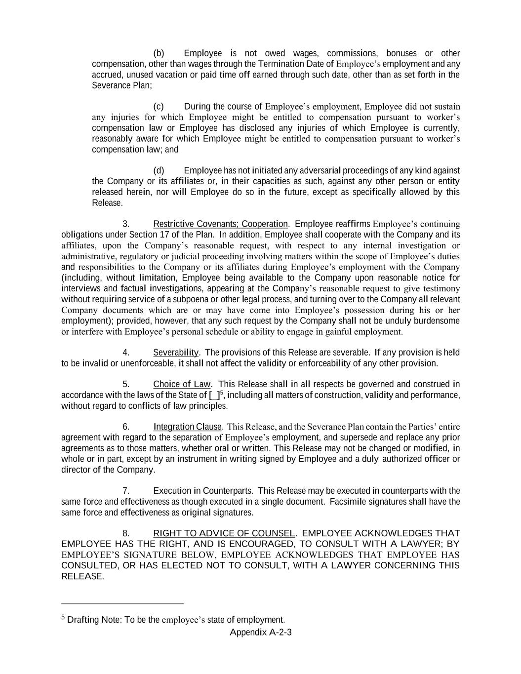 Appendix A-2-3 (b) Employee is not owed wages, commissions, bonuses or other compensation, other than wages through the Termination Date of Employee’s employment and any accrued, unused vacation or paid time off earned through such date, other than as set forth in the Severance Plan; (c) During the course of Employee’s employment, Employee did not sustain any injuries for which Employee might be entitled to compensation pursuant to worker’s compensation law or Employee has disclosed any injuries of which Employee is currently, reasonably aware for which Employee might be entitled to compensation pursuant to worker’s compensation law; and (d) Employee has not initiated any adversarial proceedings of any kind against the Company or its affiliates or, in their capacities as such, against any other person or entity released herein, nor will Employee do so in the future, except as specifically allowed by this Release. 3. Restrictive Covenants; Cooperation. Employee reaffirms Employee’s continuing obligations under Section 17 of the Plan. In addition, Employee shall cooperate with the Company and its affiliates, upon the Company’s reasonable request, with respect to any internal investigation or administrative, regulatory or judicial proceeding involving matters within the scope of Employee’s duties and responsibilities to the Company or its affiliates during Employee’s employment with the Company (including, without limitation, Employee being available to the Company upon reasonable notice for interviews and factual investigations, appearing at the Company’s reasonable request to give testimony without requiring service of a subpoena or other legal process, and turning over to the Company all relevant Company documents which are or may have come into Employee’s possession during his or her employment); provided, however, that any such request by the Company shall not be unduly burdensome or interfere with Employee’s personal schedule or ability to engage in gainful employment. 4. Severability. The provisions of this Release are severable. If any provision is held to be invalid or unenforceable, it shall not affect the validity or enforceability of any other provision. 5. Choice of Law. This Release shall in all respects be governed and construed in accordance with the laws of the State of [ ]5, including all matters of construction, validity and performance, without regard to conflicts of law principles. 6. Integration Clause. This Release, and the Severance Plan contain the Parties’ entire agreement with regard to the separation of Employee’s employment, and supersede and replace any prior agreements as to those matters, whether oral or written. This Release may not be changed or modified, in whole or in part, except by an instrument in writing signed by Employee and a duly authorized officer or director of the Company. 7. Execution in Counterparts. This Release may be executed in counterparts with the same force and effectiveness as though executed in a single document. Facsimile signatures shall have the same force and effectiveness as original signatures. 8. RIGHT TO ADVICE OF COUNSEL. EMPLOYEE ACKNOWLEDGES THAT EMPLOYEE HAS THE RIGHT, AND IS ENCOURAGED, TO CONSULT WITH A LAWYER; BY EMPLOYEE’S SIGNATURE BELOW, EMPLOYEE ACKNOWLEDGES THAT EMPLOYEE HAS CONSULTED, OR HAS ELECTED NOT TO CONSULT, WITH A LAWYER CONCERNING THIS RELEASE. 5 Drafting Note: To be the employee’s state of employment.