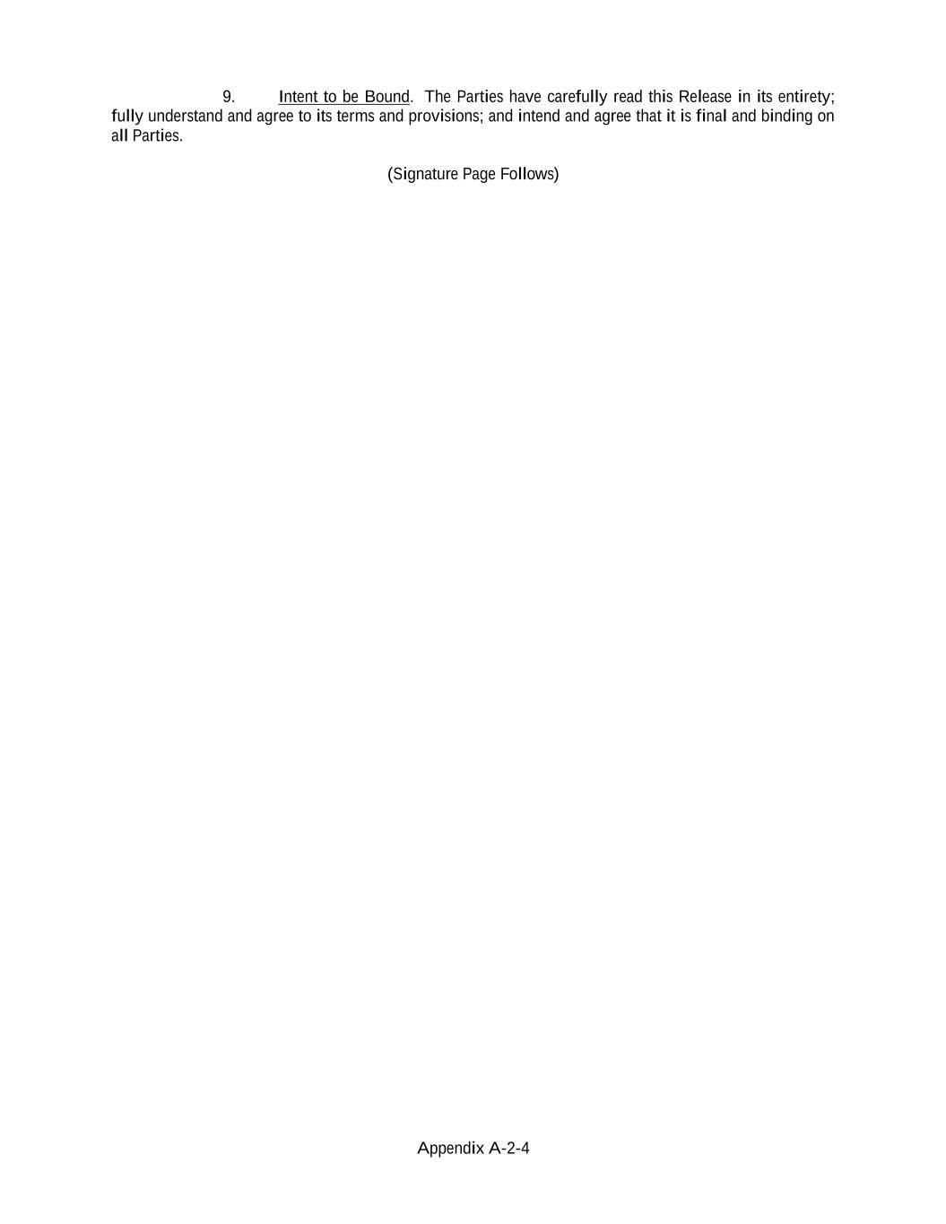 Appendix A-2-4 9. Intent to be Bound. The Parties have carefully read this Release in its entirety; fully understand and agree to its terms and provisions; and intend and agree that it is final and binding on all Parties. (Signature Page Follows)