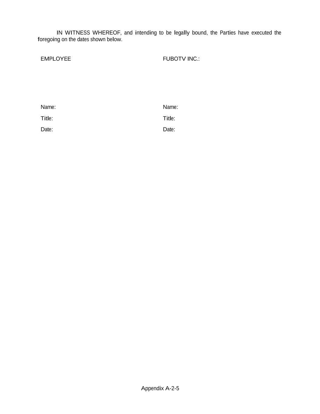 Appendix A-2-5 IN WITNESS WHEREOF, and intending to be legally bound, the Parties have executed the foregoing on the dates shown below. EMPLOYEE FUBOTV INC.: Name: Name: Title: Title: Date: Date: