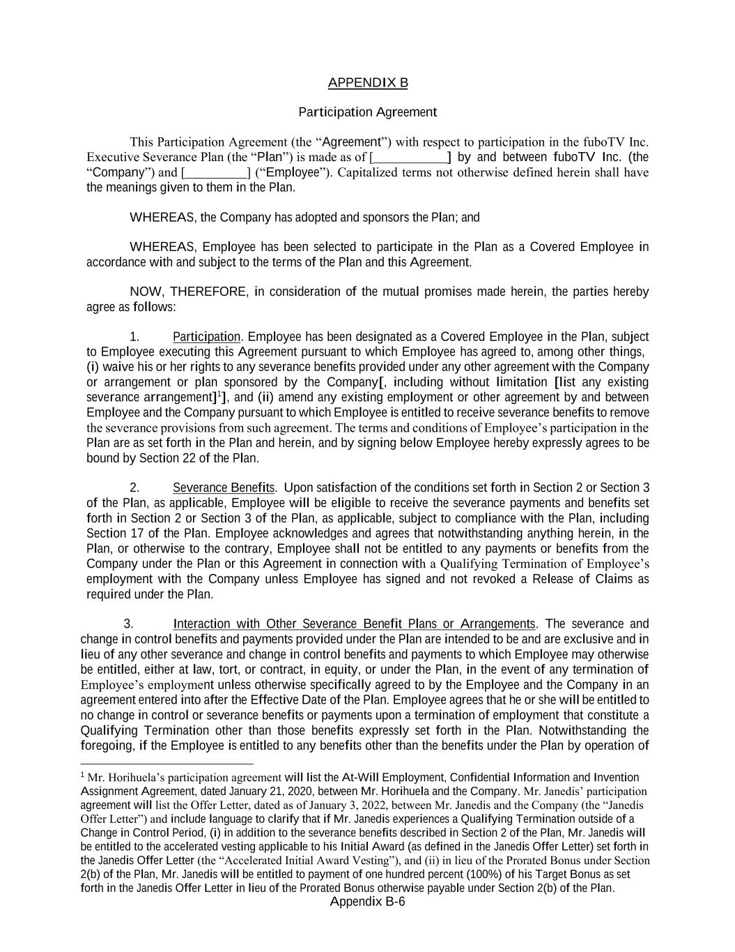 Appendix B-6 APPENDIX B Participation Agreement This Participation Agreement (the “Agreement”) with respect to participation in the fuboTV Inc. Executive Severance Plan (the “Plan”) is made as of [ ] by and between fuboTV Inc. (the “Company”) and [ ] (“Employee”). Capitalized terms not otherwise defined herein shall have the meanings given to them in the Plan. WHEREAS, the Company has adopted and sponsors the Plan; and WHEREAS, Employee has been selected to participate in the Plan as a Covered Employee in accordance with and subject to the terms of the Plan and this Agreement. NOW, THEREFORE, in consideration of the mutual promises made herein, the parties hereby agree as follows: 1. Participation. Employee has been designated as a Covered Employee in the Plan, subject to Employee executing this Agreement pursuant to which Employee has agreed to, among other things, (i) waive his or her rights to any severance benefits provided under any other agreement with the Company or arrangement or plan sponsored by the Company[, including without limitation [list any existing severance arrangement]1], and (ii) amend any existing employment or other agreement by and between Employee and the Company pursuant to which Employee is entitled to receive severance benefits to remove the severance provisions from such agreement. The terms and conditions of Employee’s participation in the Plan are as set forth in the Plan and herein, and by signing below Employee hereby expressly agrees to be bound by Section 22 of the Plan. 2. Severance Benefits. Upon satisfaction of the conditions set forth in Section 2 or Section 3 of the Plan, as applicable, Employee will be eligible to receive the severance payments and benefits set forth in Section 2 or Section 3 of the Plan, as applicable, subject to compliance with the Plan, including Section 17 of the Plan. Employee acknowledges and agrees that notwithstanding anything herein, in the Plan, or otherwise to the contrary, Employee shall not be entitled to any payments or benefits from the Company under the Plan or this Agreement in connection with a Qualifying Termination of Employee’s employment with the Company unless Employee has signed and not revoked a Release of Claims as required under the Plan. 3. Interaction with Other Severance Benefit Plans or Arrangements. The severance and change in control benefits and payments provided under the Plan are intended to be and are exclusive and in lieu of any other severance and change in control benefits and payments to which Employee may otherwise be entitled, either at law, tort, or contract, in equity, or under the Plan, in the event of any termination of Employee’s employment unless otherwise specifically agreed to by the Employee and the Company in an agreement entered into after the Effective Date of the Plan. Employee agrees that he or she will be entitled to no change in control or severance benefits or payments upon a termination of employment that constitute a Qualifying Termination other than those benefits expressly set forth in the Plan. Notwithstanding the foregoing, if the Employee is entitled to any benefits other than the benefits under the Plan by operation of 1 Mr. Horihuela’s participation agreement will list the At-Will Employment, Confidential Information and Invention Assignment Agreement, dated January 21, 2020, between Mr. Horihuela and the Company. Mr. Janedis’ participation agreement will list the Offer Letter, dated as of January 3, 2022, between Mr. Janedis and the Company (the “Janedis Offer Letter”) and include language to clarify that if Mr. Janedis experiences a Qualifying Termination outside of a Change in Control Period, (i) in addition to the severance benefits described in Section 2 of the Plan, Mr. Janedis will be entitled to the accelerated vesting applicable to his Initial Award (as defined in the Janedis Offer Letter) set forth in the Janedis Offer Letter (the “Accelerated Initial Award Vesting”), and (ii) in lieu of the Prorated Bonus under Section 2(b) of the Plan, Mr. Janedis will be entitled to payment of one hundred percent (100%) of his Target Bonus as set forth in the Janedis Offer Letter in lieu of the Prorated Bonus otherwise payable under Section 2(b) of the Plan.