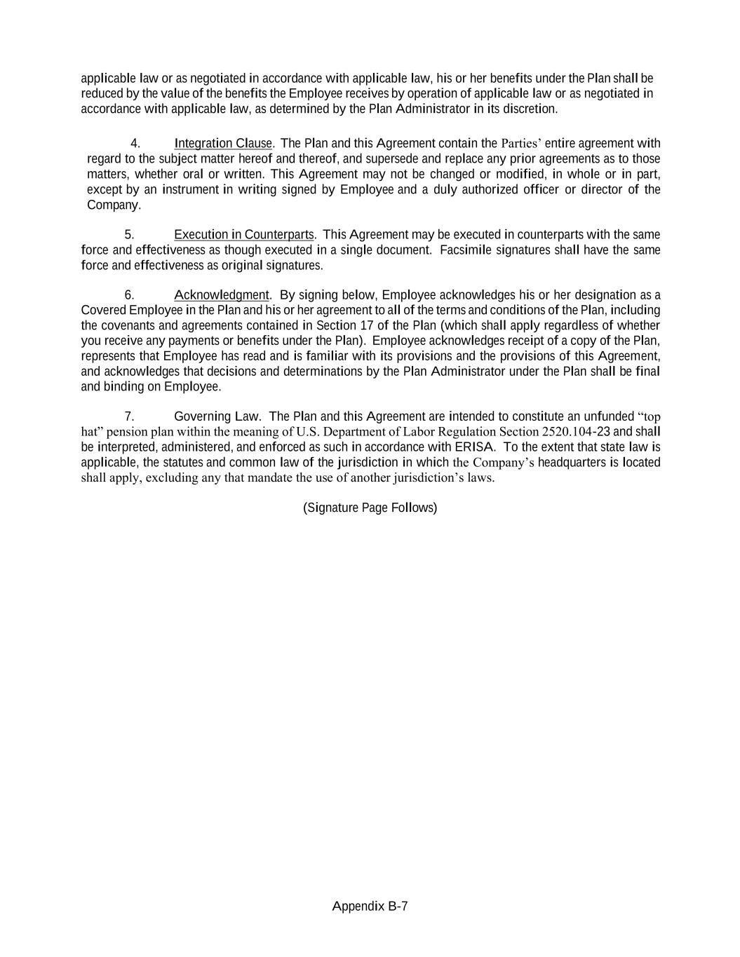 Appendix B-7 applicable law or as negotiated in accordance with applicable law, his or her benefits under the Plan shall be reduced by the value of the benefits the Employee receives by operation of applicable law or as negotiated in accordance with applicable law, as determined by the Plan Administrator in its discretion. 4. Integration Clause. The Plan and this Agreement contain the Parties’ entire agreement with regard to the subject matter hereof and thereof, and supersede and replace any prior agreements as to those matters, whether oral or written. This Agreement may not be changed or modified, in whole or in part, except by an instrument in writing signed by Employee and a duly authorized officer or director of the Company. 5. Execution in Counterparts. This Agreement may be executed in counterparts with the same force and effectiveness as though executed in a single document. Facsimile signatures shall have the same force and effectiveness as original signatures. 6. Acknowledgment. By signing below, Employee acknowledges his or her designation as a Covered Employee in the Plan and his or her agreement to all of the terms and conditions of the Plan, including the covenants and agreements contained in Section 17 of the Plan (which shall apply regardless of whether you receive any payments or benefits under the Plan). Employee acknowledges receipt of a copy of the Plan, represents that Employee has read and is familiar with its provisions and the provisions of this Agreement, and acknowledges that decisions and determinations by the Plan Administrator under the Plan shall be final and binding on Employee. 7. Governing Law. The Plan and this Agreement are intended to constitute an unfunded “top hat” pension plan within the meaning of U.S. Department of Labor Regulation Section 2520.104-23 and shall be interpreted, administered, and enforced as such in accordance with ERISA. To the extent that state law is applicable, the statutes and common law of the jurisdiction in which the Company’s headquarters is located shall apply, excluding any that mandate the use of another jurisdiction’s laws. (Signature Page Follows)