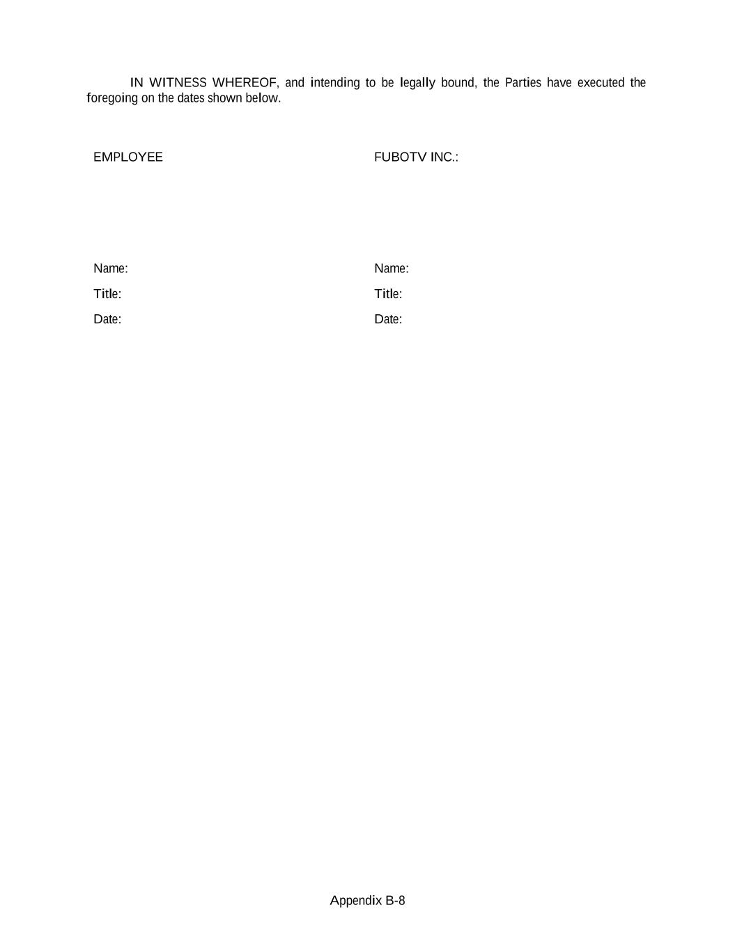 Appendix B-8 IN WITNESS WHEREOF, and intending to be legally bound, the Parties have executed the foregoing on the dates shown below. EMPLOYEE FUBOTV INC.: Name: Name: Title: Title: Date: Date: