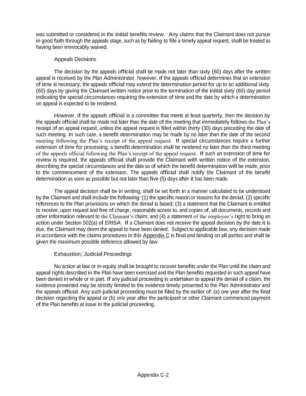 Appendix C-2 was submitted or considered in the initial benefits review. Any claims that the Claimant does not pursue in good faith through the appeals stage, such as by failing to file a timely appeal request, shall be treated as having been irrevocably waived. Appeals Decisions The decision by the appeals official shall be made not later than sixty (60) days after the written appeal is received by the Plan Administrator, however, if the appeals official determines that an extension of time is necessary, the appeals official may extend the determination period for up to an additional sixty (60) days by giving the Claimant written notice prior to the termination of the initial sixty (60) day period indicating the special circumstances requiring the extension of time and the date by which a determination on appeal is expected to be rendered. However, if the appeals official is a committee that meets at least quarterly, then the decision by the appeals official shall be made not later than the date of the meeting that immediately follows the Plan’s receipt of an appeal request, unless the appeal request is filed within thirty (30) days preceding the date of such meeting. In such case, a benefit determination may be made by no later than the date of the second meeting following the Plan’s receipt of the appeal request. If special circumstances require a further extension of time for processing, a benefit determination shall be rendered no later than the third meeting of the appeals official following the Plan’s receipt of the appeal request. If such an extension of time for review is required, the appeals official shall provide the Claimant with written notice of the extension, describing the special circumstances and the date as of which the benefit determination will be made, prior to the commencement of the extension. The appeals official shall notify the Claimant of the benefit determination as soon as possible but not later than five (5) days after it has been made. The appeal decision shall be in writing, shall be set forth in a manner calculated to be understood by the Claimant and shall include the following: (1) the specific reason or reasons for the denial; (2) specific references to the Plan provisions on which the denial is based; (3) a statement that the Claimant is entitled to receive, upon request and free of charge, reasonable access to, and copies of, all documents, records and other information relevant to the Claimant’s claim; and (4) a statement of the employee’s right to bring an action under Section 502(a) of ERISA. If a Claimant does not receive the appeal decision by the date it is due, the Claimant may deem the appeal to have been denied. Subject to applicable law, any decision made in accordance with the claims procedures in this Appendix C is final and binding on all parties and shall be given the maximum possible deference allowed by law. Exhaustion; Judicial Proceedings No action at law or in equity shall be brought to recover benefits under the Plan until the claim and appeal rights described in the Plan have been exercised and the Plan benefits requested in such appeal have been denied in whole or in part. If any judicial proceeding is undertaken to appeal the denial of a claim, the evidence presented may be strictly limited to the evidence timely presented to the Plan Administrator and the appeals official. Any such judicial proceeding must be filed by the earlier of: (a) one year after the final decision regarding the appeal or (b) one year after the participant or other Claimant commenced payment of the Plan benefits at issue in the judicial proceeding.