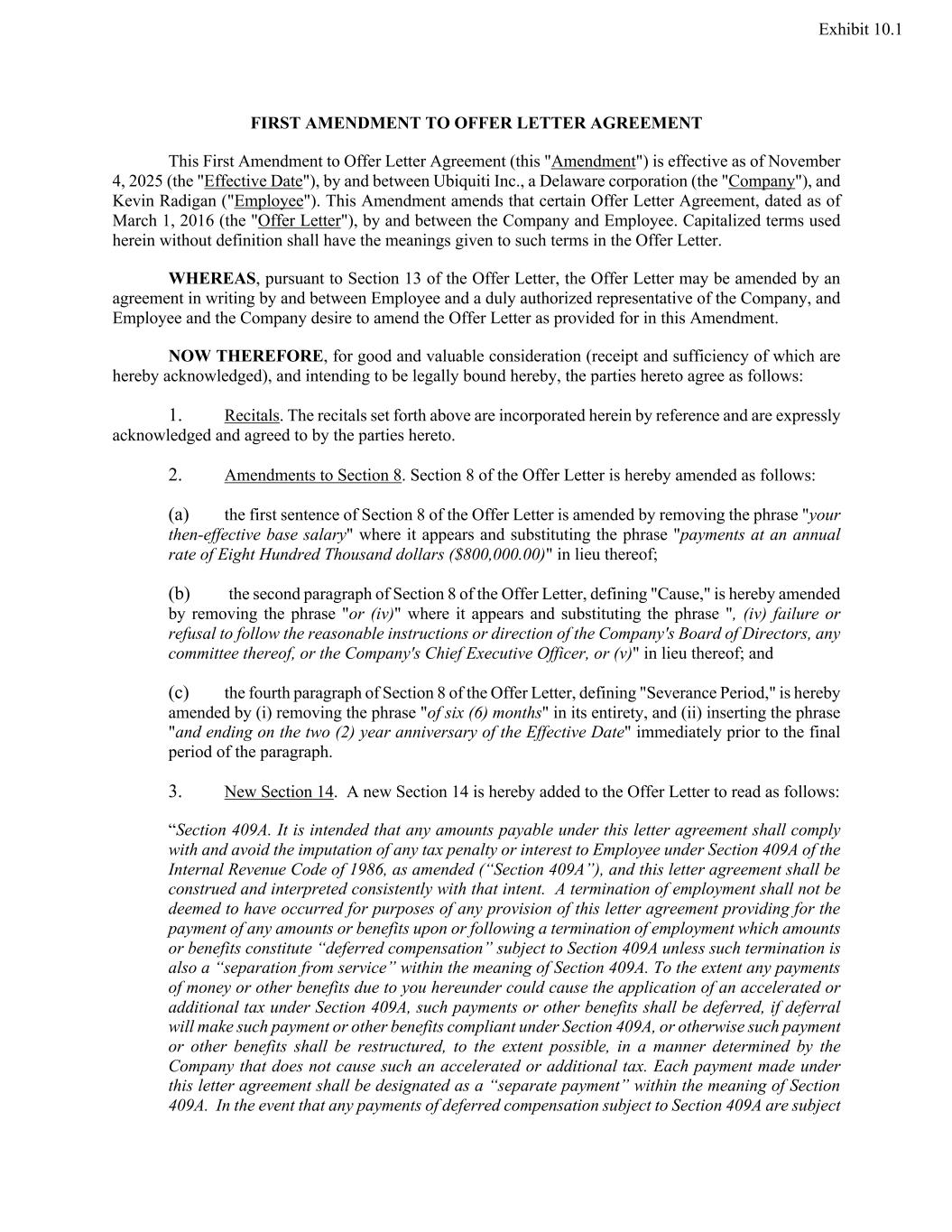 FIRST AMENDMENT TO OFFER LETTER AGREEMENT This First Amendment to Offer Letter Agreement (this "Amendment") is effective as of November 4, 2025 (the "Effective Date"), by and between Ubiquiti Inc., a Delaware corporation (the "Company"), and Kevin Radigan ("Employee"). This Amendment amends that certain Offer Letter Agreement, dated as of March 1, 2016 (the "Offer Letter"), by and between the Company and Employee. Capitalized terms used herein without definition shall have the meanings given to such terms in the Offer Letter. WHEREAS, pursuant to Section 13 of the Offer Letter, the Offer Letter may be amended by an agreement in writing by and between Employee and a duly authorized representative of the Company, and Employee and the Company desire to amend the Offer Letter as provided for in this Amendment. NOW THEREFORE, for good and valuable consideration (receipt and sufficiency of which are hereby acknowledged), and intending to be legally bound hereby, the parties hereto agree as follows: 1. Recitals. The recitals set forth above are incorporated herein by reference and are expressly acknowledged and agreed to by the parties hereto. 2. Amendments to Section 8. Section 8 of the Offer Letter is hereby amended as follows: (a) the first sentence of Section 8 of the Offer Letter is amended by removing the phrase "your then-effective base salary" where it appears and substituting the phrase "payments at an annual rate of Eight Hundred Thousand dollars ($800,000.00)" in lieu thereof; (b) the second paragraph of Section 8 of the Offer Letter, defining "Cause," is hereby amended by removing the phrase "or (iv)" where it appears and substituting the phrase ", (iv) failure or refusal to follow the reasonable instructions or direction of the Company's Board of Directors, any committee thereof, or the Company's Chief Executive Officer, or (v)" in lieu thereof; and (c) the fourth paragraph of Section 8 of the Offer Letter, defining "Severance Period," is hereby amended by (i) removing the phrase "of six (6) months" in its entirety, and (ii) inserting the phrase "and ending on the two (2) year anniversary of the Effective Date" immediately prior to the final period of the paragraph. 3. New Section 14. A new Section 14 is hereby added to the Offer Letter to read as follows: “Section 409A. It is intended that any amounts payable under this letter agreement shall comply with and avoid the imputation of any tax penalty or interest to Employee under Section 409A of the Internal Revenue Code of 1986, as amended (“Section 409A”), and this letter agreement shall be construed and interpreted consistently with that intent. A termination of employment shall not be deemed to have occurred for purposes of any provision of this letter agreement providing for the payment of any amounts or benefits upon or following a termination of employment which amounts or benefits constitute “deferred compensation” subject to Section 409A unless such termination is also a “separation from service” within the meaning of Section 409A. To the extent any payments of money or other benefits due to you hereunder could cause the application of an accelerated or additional tax under Section 409A, such payments or other benefits shall be deferred, if deferral will make such payment or other benefits compliant under Section 409A, or otherwise such payment or other benefits shall be restructured, to the extent possible, in a manner determined by the Company that does not cause such an accelerated or additional tax. Each payment made under this letter agreement shall be designated as a “separate payment” within the meaning of Section 409A. In the event that any payments of deferred compensation subject to Section 409A are subject Exhibit 10.1
