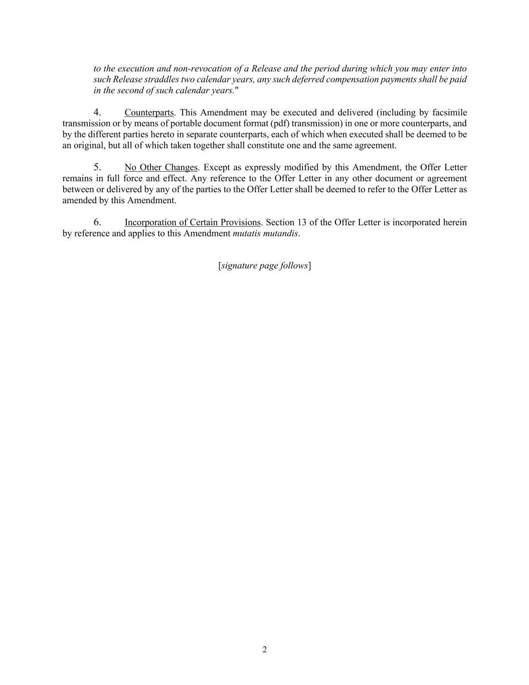 2 to the execution and non-revocation of a Release and the period during which you may enter into such Release straddles two calendar years, any such deferred compensation payments shall be paid in the second of such calendar years." 4. Counterparts. This Amendment may be executed and delivered (including by facsimile transmission or by means of portable document format (pdf) transmission) in one or more counterparts, and by the different parties hereto in separate counterparts, each of which when executed shall be deemed to be an original, but all of which taken together shall constitute one and the same agreement. 5. No Other Changes. Except as expressly modified by this Amendment, the Offer Letter remains in full force and effect. Any reference to the Offer Letter in any other document or agreement between or delivered by any of the parties to the Offer Letter shall be deemed to refer to the Offer Letter as amended by this Amendment. 6. Incorporation of Certain Provisions. Section 13 of the Offer Letter is incorporated herein by reference and applies to this Amendment mutatis mutandis. [signature page follows]