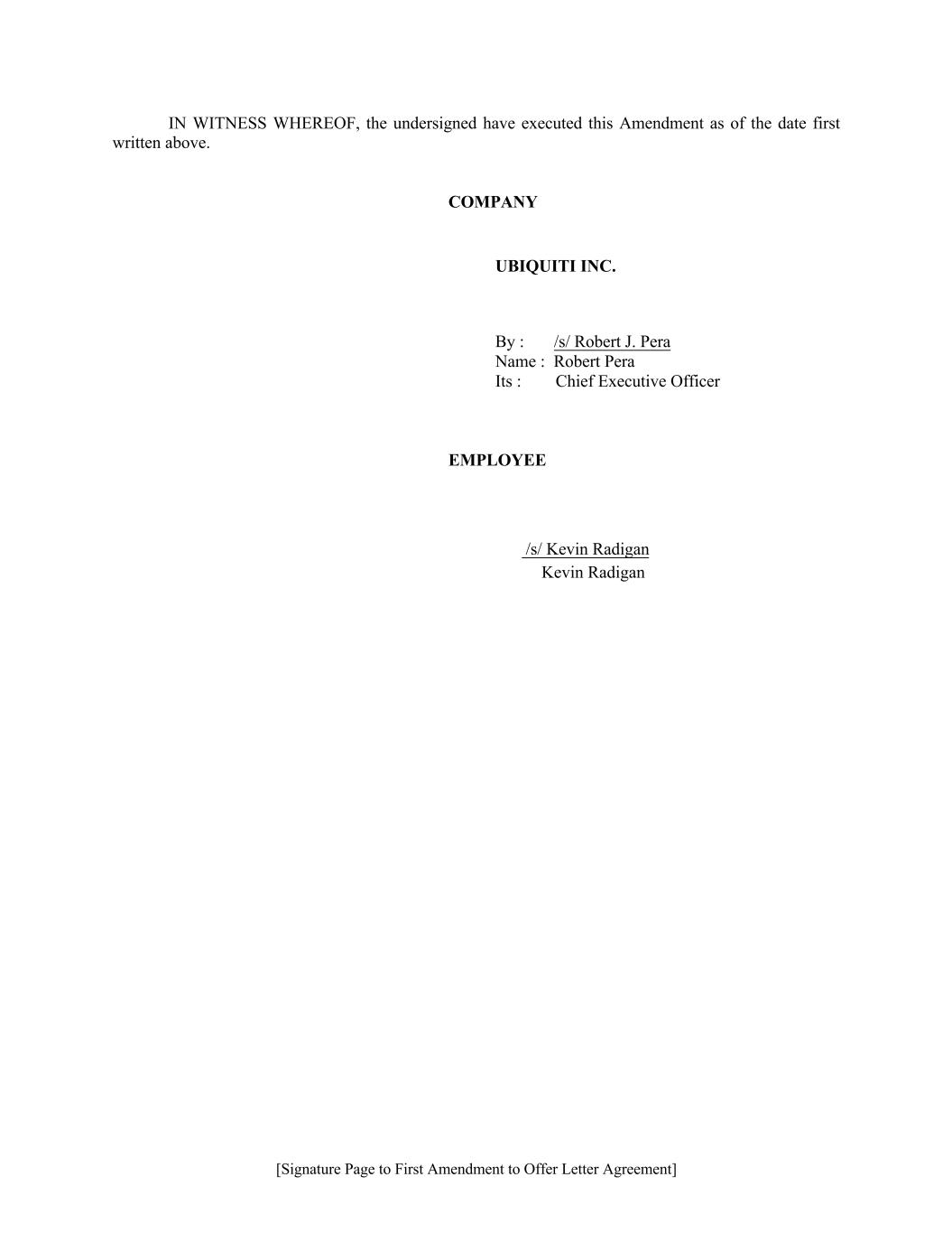 [Signature Page to First Amendment to Offer Letter Agreement] IN WITNESS WHEREOF, the undersigned have executed this Amendment as of the date first written above. COMPANY UBIQUITI INC. By : /s/ Robert J. Pera Name : Robert Pera Its : Chief Executive Officer EMPLOYEE /s/ Kevin Radigan Kevin Radigan