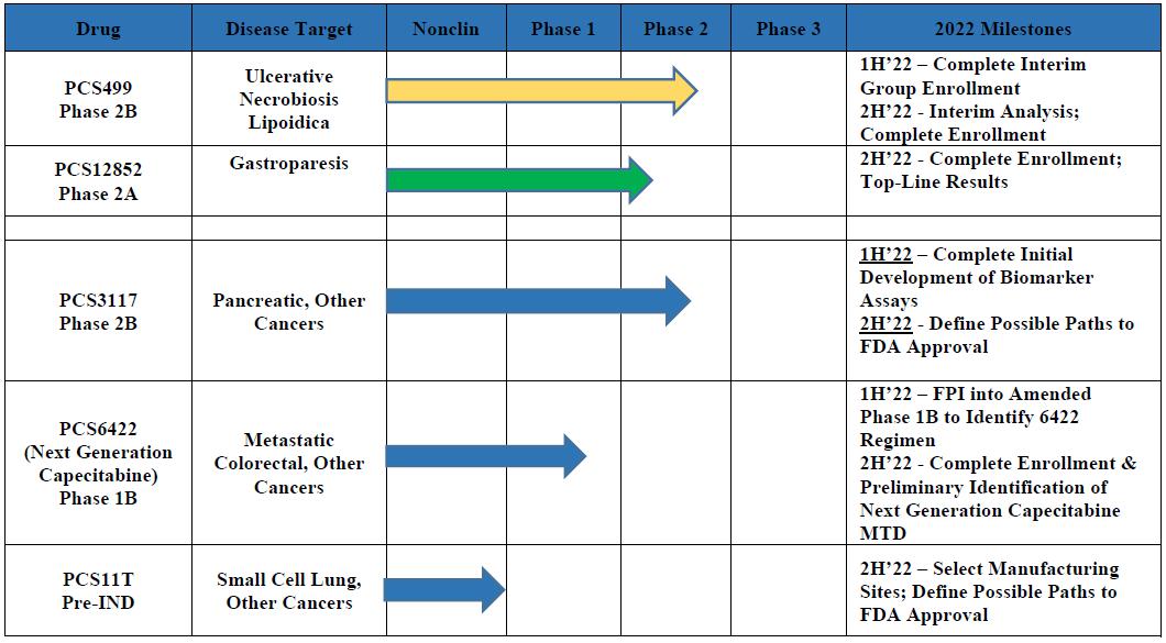 The funding necessary to bring a drug candidate to market is subject to numerous uncertainties. Once a drug candidate is identified, the further development of that drug candidate may be halted or abandoned at any time due to a number of factors. These factors include, but are not limited to, funding constraints, safety or a change in market demand. For each of our drug candidate programs, we periodically assess the scientific progress and merits of the programs to determine if continued research and development is economically viable. Some programs may be terminated due to the lack of scientific progress and lack of prospects for ultimate commercialization. As noted above, we anticipate our research and development costs to increase in the future as we conduct the Phase 2B trial to evaluate the ability of PCS499 to completely close ulcers in patients with NL, restart our Phase 1B clinical trial for PCS6422 and conduct our Phase 2 trial for PCS12852 in gastroparesis.