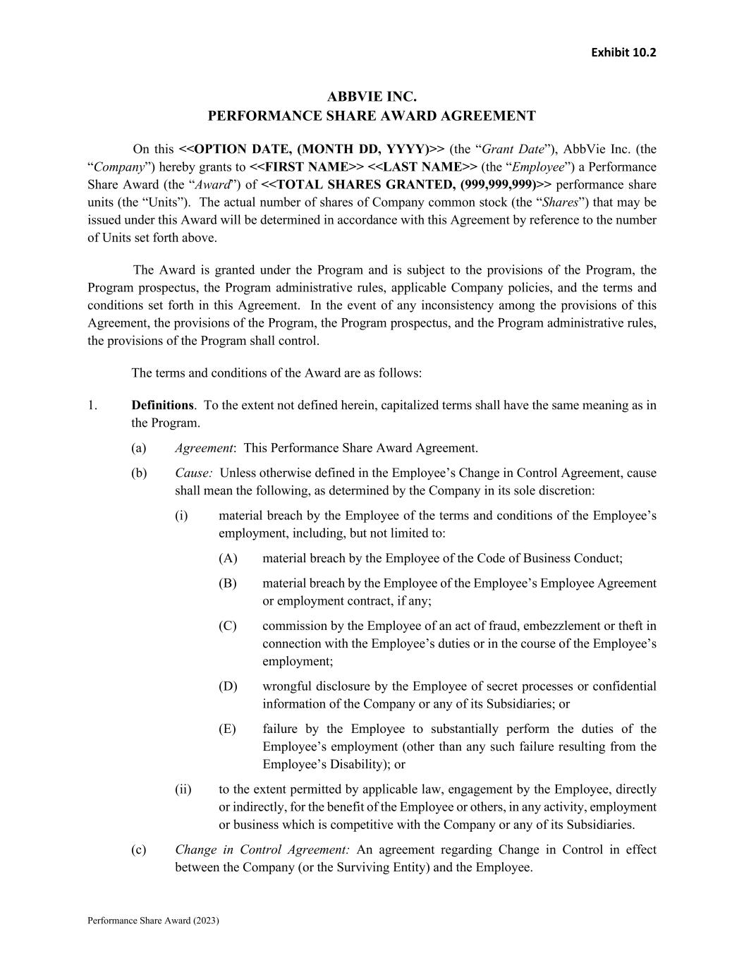 Exhibit 10.2 Performance Share Award (2023) ABBVIE INC. PERFORMANCE SHARE AWARD AGREEMENT On this <<OPTION DATE, (MONTH DD, YYYY)>> (the “Grant Date”), AbbVie Inc. (the “Company”) hereby grants to <<FIRST NAME>> <<LAST NAME>> (the “Employee”) a Performance Share Award (the “Award”) of <<TOTAL SHARES GRANTED, (999,999,999)>> performance share units (the “Units”). The actual number of shares of Company common stock (the “Shares”) that may be issued under this Award will be determined in accordance with this Agreement by reference to the number of Units set forth above. The Award is granted under the Program and is subject to the provisions of the Program, the Program prospectus, the Program administrative rules, applicable Company policies, and the terms and conditions set forth in this Agreement. In the event of any inconsistency among the provisions of this Agreement, the provisions of the Program, the Program prospectus, and the Program administrative rules, the provisions of the Program shall control. The terms and conditions of the Award are as follows: 1. Definitions. To the extent not defined herein, capitalized terms shall have the same meaning as in the Program. (a) Agreement: This Performance Share Award Agreement. (b) Cause: Unless otherwise defined in the Employee’s Change in Control Agreement, cause shall mean the following, as determined by the Company in its sole discretion: (i) material breach by the Employee of the terms and conditions of the Employee’s employment, including, but not limited to: (A) material breach by the Employee of the Code of Business Conduct; (B) material breach by the Employee of the Employee’s Employee Agreement or employment contract, if any; (C) commission by the Employee of an act of fraud, embezzlement or theft in connection with the Employee’s duties or in the course of the Employee’s employment; (D) wrongful disclosure by the Employee of secret processes or confidential information of the Company or any of its Subsidiaries; or (E) failure by the Employee to substantially perform the duties of the Employee’s employment (other than any such failure resulting from the Employee’s Disability); or (ii) to the extent permitted by applicable law, engagement by the Employee, directly or indirectly, for the benefit of the Employee or others, in any activity, employment or business which is competitive with the Company or any of its Subsidiaries. (c) Change in Control Agreement: An agreement regarding Change in Control in effect between the Company (or the Surviving Entity) and the Employee.