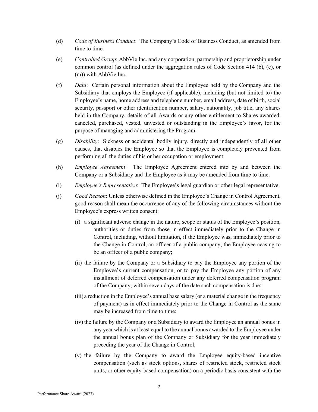 2 Performance Share Award (2023) (d) Code of Business Conduct: The Company’s Code of Business Conduct, as amended from time to time. (e) Controlled Group: AbbVie Inc. and any corporation, partnership and proprietorship under common control (as defined under the aggregation rules of Code Section 414 (b), (c), or (m)) with AbbVie Inc. (f) Data: Certain personal information about the Employee held by the Company and the Subsidiary that employs the Employee (if applicable), including (but not limited to) the Employee’s name, home address and telephone number, email address, date of birth, social security, passport or other identification number, salary, nationality, job title, any Shares held in the Company, details of all Awards or any other entitlement to Shares awarded, canceled, purchased, vested, unvested or outstanding in the Employee’s favor, for the purpose of managing and administering the Program. (g) Disability: Sickness or accidental bodily injury, directly and independently of all other causes, that disables the Employee so that the Employee is completely prevented from performing all the duties of his or her occupation or employment. (h) Employee Agreement: The Employee Agreement entered into by and between the Company or a Subsidiary and the Employee as it may be amended from time to time. (i) Employee’s Representative: The Employee’s legal guardian or other legal representative. (j) Good Reason: Unless otherwise defined in the Employee’s Change in Control Agreement, good reason shall mean the occurrence of any of the following circumstances without the Employee’s express written consent: (i) a significant adverse change in the nature, scope or status of the Employee’s position, authorities or duties from those in effect immediately prior to the Change in Control, including, without limitation, if the Employee was, immediately prior to the Change in Control, an officer of a public company, the Employee ceasing to be an officer of a public company; (ii) the failure by the Company or a Subsidiary to pay the Employee any portion of the Employee’s current compensation, or to pay the Employee any portion of any installment of deferred compensation under any deferred compensation program of the Company, within seven days of the date such compensation is due; (iii) a reduction in the Employee’s annual base salary (or a material change in the frequency of payment) as in effect immediately prior to the Change in Control as the same may be increased from time to time; (iv) the failure by the Company or a Subsidiary to award the Employee an annual bonus in any year which is at least equal to the annual bonus awarded to the Employee under the annual bonus plan of the Company or Subsidiary for the year immediately preceding the year of the Change in Control; (v) the failure by the Company to award the Employee equity-based incentive compensation (such as stock options, shares of restricted stock, restricted stock units, or other equity-based compensation) on a periodic basis consistent with the
