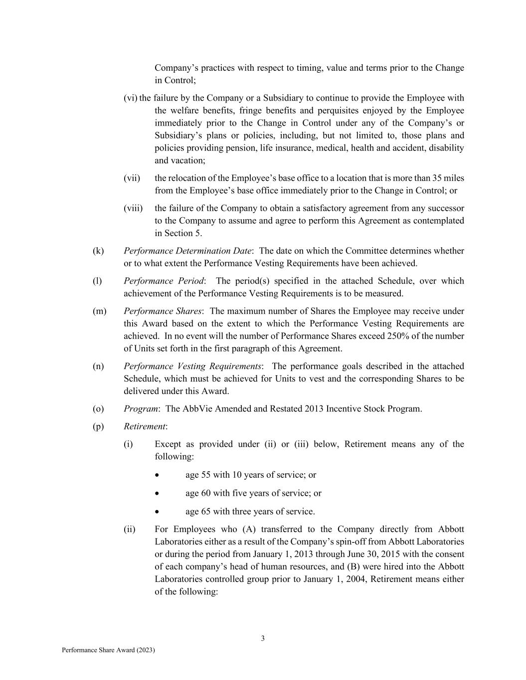 3 Performance Share Award (2023) Company’s practices with respect to timing, value and terms prior to the Change in Control; (vi) the failure by the Company or a Subsidiary to continue to provide the Employee with the welfare benefits, fringe benefits and perquisites enjoyed by the Employee immediately prior to the Change in Control under any of the Company’s or Subsidiary’s plans or policies, including, but not limited to, those plans and policies providing pension, life insurance, medical, health and accident, disability and vacation; (vii) the relocation of the Employee’s base office to a location that is more than 35 miles from the Employee’s base office immediately prior to the Change in Control; or (viii) the failure of the Company to obtain a satisfactory agreement from any successor to the Company to assume and agree to perform this Agreement as contemplated in Section 5. (k) Performance Determination Date: The date on which the Committee determines whether or to what extent the Performance Vesting Requirements have been achieved. (l) Performance Period: The period(s) specified in the attached Schedule, over which achievement of the Performance Vesting Requirements is to be measured. (m) Performance Shares: The maximum number of Shares the Employee may receive under this Award based on the extent to which the Performance Vesting Requirements are achieved. In no event will the number of Performance Shares exceed 250% of the number of Units set forth in the first paragraph of this Agreement. (n) Performance Vesting Requirements: The performance goals described in the attached Schedule, which must be achieved for Units to vest and the corresponding Shares to be delivered under this Award. (o) Program: The AbbVie Amended and Restated 2013 Incentive Stock Program. (p) Retirement: (i) Except as provided under (ii) or (iii) below, Retirement means any of the following:  age 55 with 10 years of service; or  age 60 with five years of service; or  age 65 with three years of service. (ii) For Employees who (A) transferred to the Company directly from Abbott Laboratories either as a result of the Company’s spin-off from Abbott Laboratories or during the period from January 1, 2013 through June 30, 2015 with the consent of each company’s head of human resources, and (B) were hired into the Abbott Laboratories controlled group prior to January 1, 2004, Retirement means either of the following: