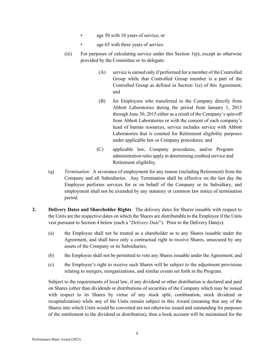 4 Performance Share Award (2023) • age 50 with 10 years of service; or • age 65 with three years of service. (iii) For purposes of calculating service under this Section 1(p), except as otherwise provided by the Committee or its delegate: (A) service is earned only if performed for a member of the Controlled Group while that Controlled Group member is a part of the Controlled Group as defined in Section 1(e) of this Agreement; and (B) for Employees who transferred to the Company directly from Abbott Laboratories during the period from January 1, 2013 through June 30, 2015 either as a result of the Company’s spin-off from Abbott Laboratories or with the consent of each company’s head of human resources, service includes service with Abbott Laboratories that is counted for Retirement eligibility purposes under applicable law or Company procedures; and (C) applicable law, Company procedures, and/or Program administration rules apply in determining credited service and Retirement eligibility. (q) Termination: A severance of employment for any reason (including Retirement) from the Company and all Subsidiaries. Any Termination shall be effective on the last day the Employee performs services for or on behalf of the Company or its Subsidiary, and employment shall not be extended by any statutory or common law notice of termination period. 2. Delivery Dates and Shareholder Rights. The delivery dates for Shares issuable with respect to the Units are the respective dates on which the Shares are distributable to the Employee if the Units vest pursuant to Section 4 below (each a “Delivery Date”). Prior to the Delivery Date(s): (a) the Employee shall not be treated as a shareholder as to any Shares issuable under the Agreement, and shall have only a contractual right to receive Shares, unsecured by any assets of the Company or its Subsidiaries; (b) the Employee shall not be permitted to vote any Shares issuable under the Agreement; and (c) the Employee’s right to receive such Shares will be subject to the adjustment provisions relating to mergers, reorganizations, and similar events set forth in the Program. Subject to the requirements of local law, if any dividend or other distribution is declared and paid on Shares (other than dividends or distributions of securities of the Company which may be issued with respect to its Shares by virtue of any stock split, combination, stock dividend or recapitalization) while any of the Units remain subject to this Award (meaning that any of the Shares into which Units would be converted are not otherwise issued and outstanding for purposes of the entitlement to the dividend or distribution), then a book account will be maintained for the