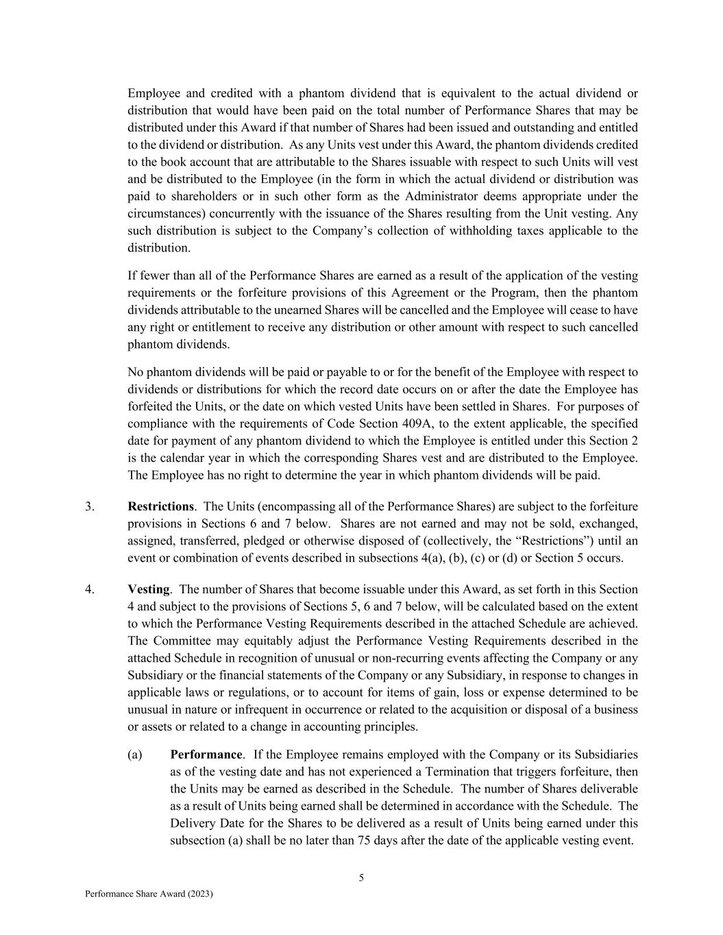 5 Performance Share Award (2023) Employee and credited with a phantom dividend that is equivalent to the actual dividend or distribution that would have been paid on the total number of Performance Shares that may be distributed under this Award if that number of Shares had been issued and outstanding and entitled to the dividend or distribution. As any Units vest under this Award, the phantom dividends credited to the book account that are attributable to the Shares issuable with respect to such Units will vest and be distributed to the Employee (in the form in which the actual dividend or distribution was paid to shareholders or in such other form as the Administrator deems appropriate under the circumstances) concurrently with the issuance of the Shares resulting from the Unit vesting. Any such distribution is subject to the Company’s collection of withholding taxes applicable to the distribution. If fewer than all of the Performance Shares are earned as a result of the application of the vesting requirements or the forfeiture provisions of this Agreement or the Program, then the phantom dividends attributable to the unearned Shares will be cancelled and the Employee will cease to have any right or entitlement to receive any distribution or other amount with respect to such cancelled phantom dividends. No phantom dividends will be paid or payable to or for the benefit of the Employee with respect to dividends or distributions for which the record date occurs on or after the date the Employee has forfeited the Units, or the date on which vested Units have been settled in Shares. For purposes of compliance with the requirements of Code Section 409A, to the extent applicable, the specified date for payment of any phantom dividend to which the Employee is entitled under this Section 2 is the calendar year in which the corresponding Shares vest and are distributed to the Employee. The Employee has no right to determine the year in which phantom dividends will be paid. 3. Restrictions. The Units (encompassing all of the Performance Shares) are subject to the forfeiture provisions in Sections 6 and 7 below. Shares are not earned and may not be sold, exchanged, assigned, transferred, pledged or otherwise disposed of (collectively, the “Restrictions”) until an event or combination of events described in subsections 4(a), (b), (c) or (d) or Section 5 occurs. 4. Vesting. The number of Shares that become issuable under this Award, as set forth in this Section 4 and subject to the provisions of Sections 5, 6 and 7 below, will be calculated based on the extent to which the Performance Vesting Requirements described in the attached Schedule are achieved. The Committee may equitably adjust the Performance Vesting Requirements described in the attached Schedule in recognition of unusual or non-recurring events affecting the Company or any Subsidiary or the financial statements of the Company or any Subsidiary, in response to changes in applicable laws or regulations, or to account for items of gain, loss or expense determined to be unusual in nature or infrequent in occurrence or related to the acquisition or disposal of a business or assets or related to a change in accounting principles. (a) Performance. If the Employee remains employed with the Company or its Subsidiaries as of the vesting date and has not experienced a Termination that triggers forfeiture, then the Units may be earned as described in the Schedule. The number of Shares deliverable as a result of Units being earned shall be determined in accordance with the Schedule. The Delivery Date for the Shares to be delivered as a result of Units being earned under this subsection (a) shall be no later than 75 days after the date of the applicable vesting event.