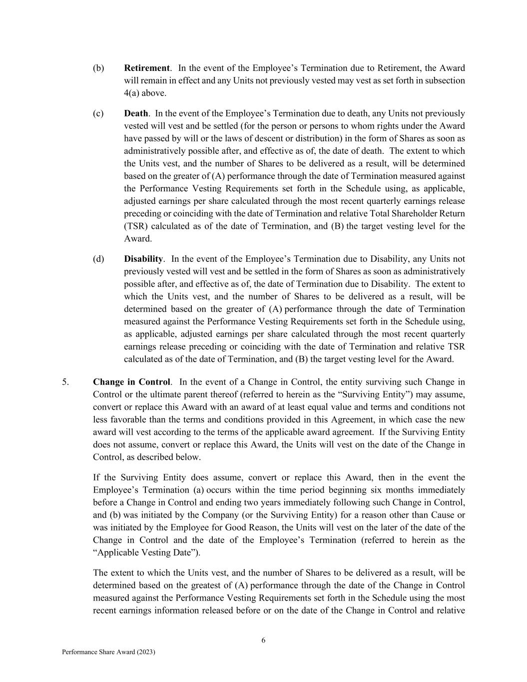 6 Performance Share Award (2023) (b) Retirement. In the event of the Employee’s Termination due to Retirement, the Award will remain in effect and any Units not previously vested may vest as set forth in subsection 4(a) above. (c) Death. In the event of the Employee’s Termination due to death, any Units not previously vested will vest and be settled (for the person or persons to whom rights under the Award have passed by will or the laws of descent or distribution) in the form of Shares as soon as administratively possible after, and effective as of, the date of death. The extent to which the Units vest, and the number of Shares to be delivered as a result, will be determined based on the greater of (A) performance through the date of Termination measured against the Performance Vesting Requirements set forth in the Schedule using, as applicable, adjusted earnings per share calculated through the most recent quarterly earnings release preceding or coinciding with the date of Termination and relative Total Shareholder Return (TSR) calculated as of the date of Termination, and (B) the target vesting level for the Award. (d) Disability. In the event of the Employee’s Termination due to Disability, any Units not previously vested will vest and be settled in the form of Shares as soon as administratively possible after, and effective as of, the date of Termination due to Disability. The extent to which the Units vest, and the number of Shares to be delivered as a result, will be determined based on the greater of (A) performance through the date of Termination measured against the Performance Vesting Requirements set forth in the Schedule using, as applicable, adjusted earnings per share calculated through the most recent quarterly earnings release preceding or coinciding with the date of Termination and relative TSR calculated as of the date of Termination, and (B) the target vesting level for the Award. 5. Change in Control. In the event of a Change in Control, the entity surviving such Change in Control or the ultimate parent thereof (referred to herein as the “Surviving Entity”) may assume, convert or replace this Award with an award of at least equal value and terms and conditions not less favorable than the terms and conditions provided in this Agreement, in which case the new award will vest according to the terms of the applicable award agreement. If the Surviving Entity does not assume, convert or replace this Award, the Units will vest on the date of the Change in Control, as described below. If the Surviving Entity does assume, convert or replace this Award, then in the event the Employee’s Termination (a) occurs within the time period beginning six months immediately before a Change in Control and ending two years immediately following such Change in Control, and (b) was initiated by the Company (or the Surviving Entity) for a reason other than Cause or was initiated by the Employee for Good Reason, the Units will vest on the later of the date of the Change in Control and the date of the Employee’s Termination (referred to herein as the “Applicable Vesting Date”). The extent to which the Units vest, and the number of Shares to be delivered as a result, will be determined based on the greatest of (A) performance through the date of the Change in Control measured against the Performance Vesting Requirements set forth in the Schedule using the most recent earnings information released before or on the date of the Change in Control and relative
