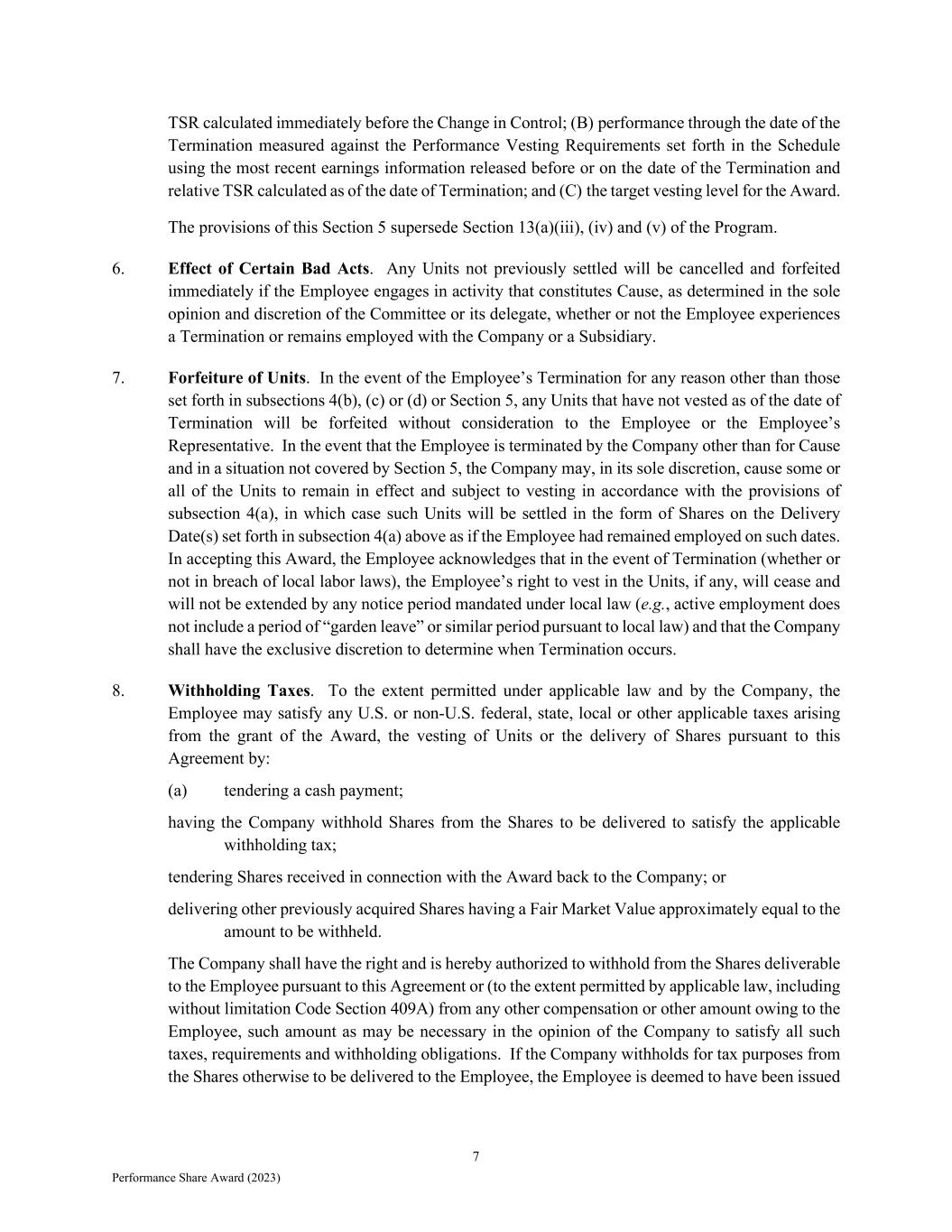 7 Performance Share Award (2023) TSR calculated immediately before the Change in Control; (B) performance through the date of the Termination measured against the Performance Vesting Requirements set forth in the Schedule using the most recent earnings information released before or on the date of the Termination and relative TSR calculated as of the date of Termination; and (C) the target vesting level for the Award. The provisions of this Section 5 supersede Section 13(a)(iii), (iv) and (v) of the Program. 6. Effect of Certain Bad Acts. Any Units not previously settled will be cancelled and forfeited immediately if the Employee engages in activity that constitutes Cause, as determined in the sole opinion and discretion of the Committee or its delegate, whether or not the Employee experiences a Termination or remains employed with the Company or a Subsidiary. 7. Forfeiture of Units. In the event of the Employee’s Termination for any reason other than those set forth in subsections 4(b), (c) or (d) or Section 5, any Units that have not vested as of the date of Termination will be forfeited without consideration to the Employee or the Employee’s Representative. In the event that the Employee is terminated by the Company other than for Cause and in a situation not covered by Section 5, the Company may, in its sole discretion, cause some or all of the Units to remain in effect and subject to vesting in accordance with the provisions of subsection 4(a), in which case such Units will be settled in the form of Shares on the Delivery Date(s) set forth in subsection 4(a) above as if the Employee had remained employed on such dates. In accepting this Award, the Employee acknowledges that in the event of Termination (whether or not in breach of local labor laws), the Employee’s right to vest in the Units, if any, will cease and will not be extended by any notice period mandated under local law (e.g., active employment does not include a period of “garden leave” or similar period pursuant to local law) and that the Company shall have the exclusive discretion to determine when Termination occurs. 8. Withholding Taxes. To the extent permitted under applicable law and by the Company, the Employee may satisfy any U.S. or non-U.S. federal, state, local or other applicable taxes arising from the grant of the Award, the vesting of Units or the delivery of Shares pursuant to this Agreement by: (a) tendering a cash payment; having the Company withhold Shares from the Shares to be delivered to satisfy the applicable withholding tax; tendering Shares received in connection with the Award back to the Company; or delivering other previously acquired Shares having a Fair Market Value approximately equal to the amount to be withheld. The Company shall have the right and is hereby authorized to withhold from the Shares deliverable to the Employee pursuant to this Agreement or (to the extent permitted by applicable law, including without limitation Code Section 409A) from any other compensation or other amount owing to the Employee, such amount as may be necessary in the opinion of the Company to satisfy all such taxes, requirements and withholding obligations. If the Company withholds for tax purposes from the Shares otherwise to be delivered to the Employee, the Employee is deemed to have been issued