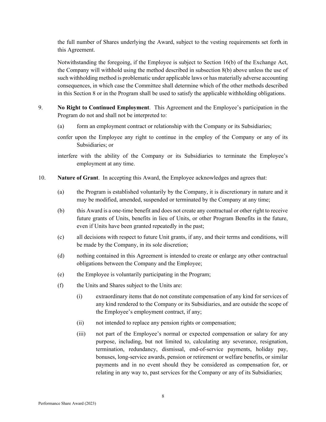 8 Performance Share Award (2023) the full number of Shares underlying the Award, subject to the vesting requirements set forth in this Agreement. Notwithstanding the foregoing, if the Employee is subject to Section 16(b) of the Exchange Act, the Company will withhold using the method described in subsection 8(b) above unless the use of such withholding method is problematic under applicable laws or has materially adverse accounting consequences, in which case the Committee shall determine which of the other methods described in this Section 8 or in the Program shall be used to satisfy the applicable withholding obligations. 9. No Right to Continued Employment. This Agreement and the Employee’s participation in the Program do not and shall not be interpreted to: (a) form an employment contract or relationship with the Company or its Subsidiaries; confer upon the Employee any right to continue in the employ of the Company or any of its Subsidiaries; or interfere with the ability of the Company or its Subsidiaries to terminate the Employee’s employment at any time. 10. Nature of Grant. In accepting this Award, the Employee acknowledges and agrees that: (a) the Program is established voluntarily by the Company, it is discretionary in nature and it may be modified, amended, suspended or terminated by the Company at any time; (b) this Award is a one-time benefit and does not create any contractual or other right to receive future grants of Units, benefits in lieu of Units, or other Program Benefits in the future, even if Units have been granted repeatedly in the past; (c) all decisions with respect to future Unit grants, if any, and their terms and conditions, will be made by the Company, in its sole discretion; (d) nothing contained in this Agreement is intended to create or enlarge any other contractual obligations between the Company and the Employee; (e) the Employee is voluntarily participating in the Program; (f) the Units and Shares subject to the Units are: (i) extraordinary items that do not constitute compensation of any kind for services of any kind rendered to the Company or its Subsidiaries, and are outside the scope of the Employee’s employment contract, if any; (ii) not intended to replace any pension rights or compensation; (iii) not part of the Employee’s normal or expected compensation or salary for any purpose, including, but not limited to, calculating any severance, resignation, termination, redundancy, dismissal, end-of-service payments, holiday pay, bonuses, long-service awards, pension or retirement or welfare benefits, or similar payments and in no event should they be considered as compensation for, or relating in any way to, past services for the Company or any of its Subsidiaries;