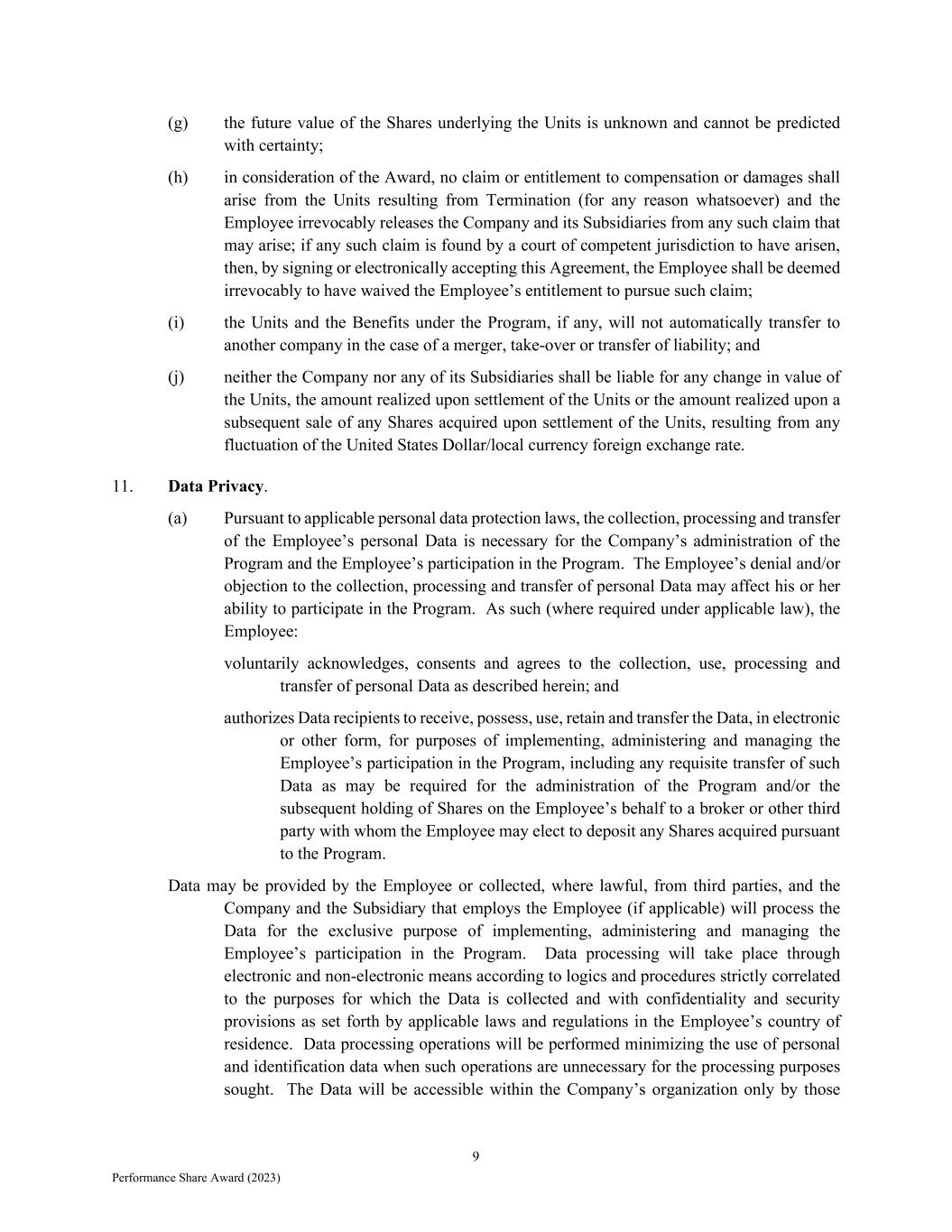 9 Performance Share Award (2023) (g) the future value of the Shares underlying the Units is unknown and cannot be predicted with certainty; (h) in consideration of the Award, no claim or entitlement to compensation or damages shall arise from the Units resulting from Termination (for any reason whatsoever) and the Employee irrevocably releases the Company and its Subsidiaries from any such claim that may arise; if any such claim is found by a court of competent jurisdiction to have arisen, then, by signing or electronically accepting this Agreement, the Employee shall be deemed irrevocably to have waived the Employee’s entitlement to pursue such claim; (i) the Units and the Benefits under the Program, if any, will not automatically transfer to another company in the case of a merger, take-over or transfer of liability; and (j) neither the Company nor any of its Subsidiaries shall be liable for any change in value of the Units, the amount realized upon settlement of the Units or the amount realized upon a subsequent sale of any Shares acquired upon settlement of the Units, resulting from any fluctuation of the United States Dollar/local currency foreign exchange rate. 11. Data Privacy. (a) Pursuant to applicable personal data protection laws, the collection, processing and transfer of the Employee’s personal Data is necessary for the Company’s administration of the Program and the Employee’s participation in the Program. The Employee’s denial and/or objection to the collection, processing and transfer of personal Data may affect his or her ability to participate in the Program. As such (where required under applicable law), the Employee: voluntarily acknowledges, consents and agrees to the collection, use, processing and transfer of personal Data as described herein; and authorizes Data recipients to receive, possess, use, retain and transfer the Data, in electronic or other form, for purposes of implementing, administering and managing the Employee’s participation in the Program, including any requisite transfer of such Data as may be required for the administration of the Program and/or the subsequent holding of Shares on the Employee’s behalf to a broker or other third party with whom the Employee may elect to deposit any Shares acquired pursuant to the Program. Data may be provided by the Employee or collected, where lawful, from third parties, and the Company and the Subsidiary that employs the Employee (if applicable) will process the Data for the exclusive purpose of implementing, administering and managing the Employee’s participation in the Program. Data processing will take place through electronic and non-electronic means according to logics and procedures strictly correlated to the purposes for which the Data is collected and with confidentiality and security provisions as set forth by applicable laws and regulations in the Employee’s country of residence. Data processing operations will be performed minimizing the use of personal and identification data when such operations are unnecessary for the processing purposes sought. The Data will be accessible within the Company’s organization only by those
