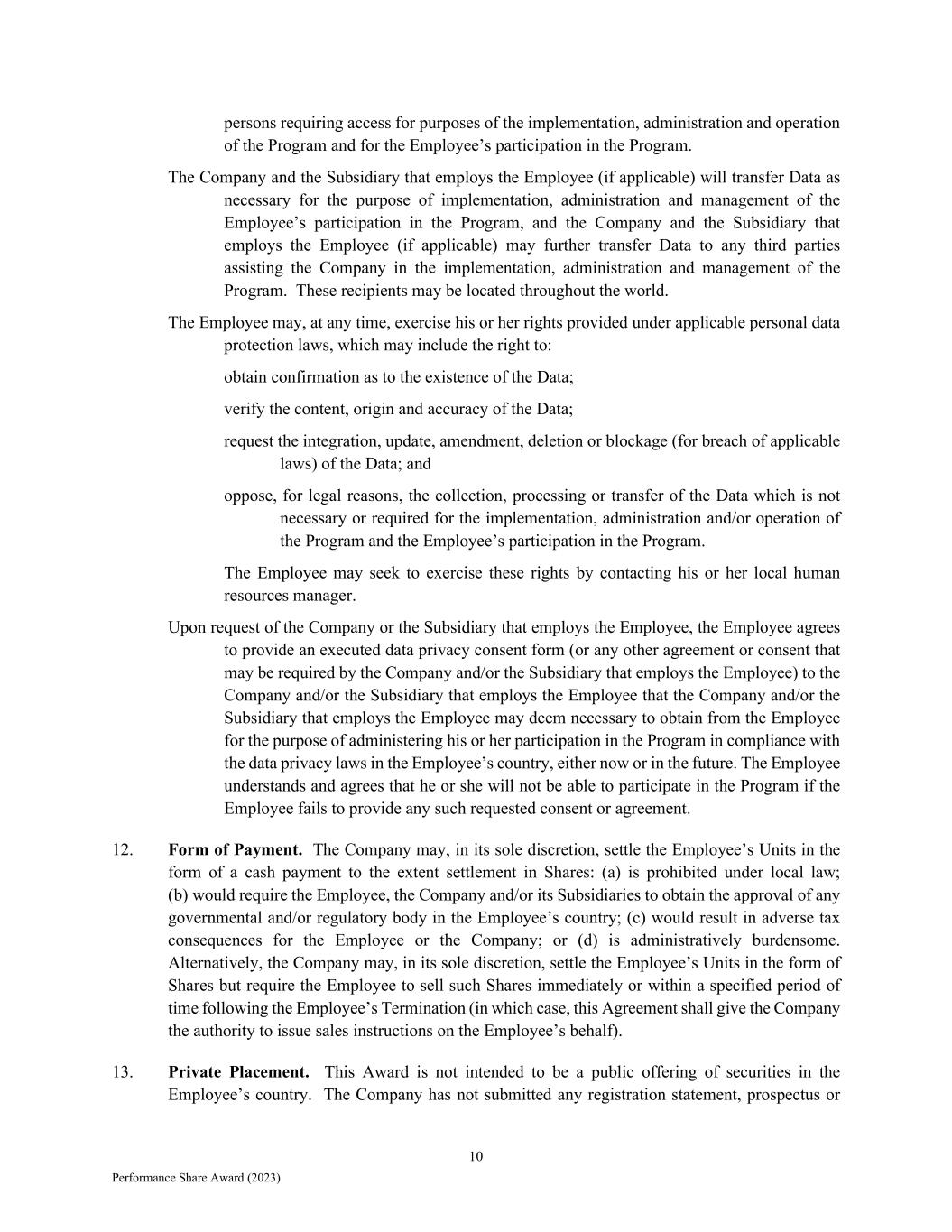 10 Performance Share Award (2023) persons requiring access for purposes of the implementation, administration and operation of the Program and for the Employee’s participation in the Program. The Company and the Subsidiary that employs the Employee (if applicable) will transfer Data as necessary for the purpose of implementation, administration and management of the Employee’s participation in the Program, and the Company and the Subsidiary that employs the Employee (if applicable) may further transfer Data to any third parties assisting the Company in the implementation, administration and management of the Program. These recipients may be located throughout the world. The Employee may, at any time, exercise his or her rights provided under applicable personal data protection laws, which may include the right to: obtain confirmation as to the existence of the Data; verify the content, origin and accuracy of the Data; request the integration, update, amendment, deletion or blockage (for breach of applicable laws) of the Data; and oppose, for legal reasons, the collection, processing or transfer of the Data which is not necessary or required for the implementation, administration and/or operation of the Program and the Employee’s participation in the Program. The Employee may seek to exercise these rights by contacting his or her local human resources manager. Upon request of the Company or the Subsidiary that employs the Employee, the Employee agrees to provide an executed data privacy consent form (or any other agreement or consent that may be required by the Company and/or the Subsidiary that employs the Employee) to the Company and/or the Subsidiary that employs the Employee that the Company and/or the Subsidiary that employs the Employee may deem necessary to obtain from the Employee for the purpose of administering his or her participation in the Program in compliance with the data privacy laws in the Employee’s country, either now or in the future. The Employee understands and agrees that he or she will not be able to participate in the Program if the Employee fails to provide any such requested consent or agreement. 12. Form of Payment. The Company may, in its sole discretion, settle the Employee’s Units in the form of a cash payment to the extent settlement in Shares: (a) is prohibited under local law; (b) would require the Employee, the Company and/or its Subsidiaries to obtain the approval of any governmental and/or regulatory body in the Employee’s country; (c) would result in adverse tax consequences for the Employee or the Company; or (d) is administratively burdensome. Alternatively, the Company may, in its sole discretion, settle the Employee’s Units in the form of Shares but require the Employee to sell such Shares immediately or within a specified period of time following the Employee’s Termination (in which case, this Agreement shall give the Company the authority to issue sales instructions on the Employee’s behalf). 13. Private Placement. This Award is not intended to be a public offering of securities in the Employee’s country. The Company has not submitted any registration statement, prospectus or