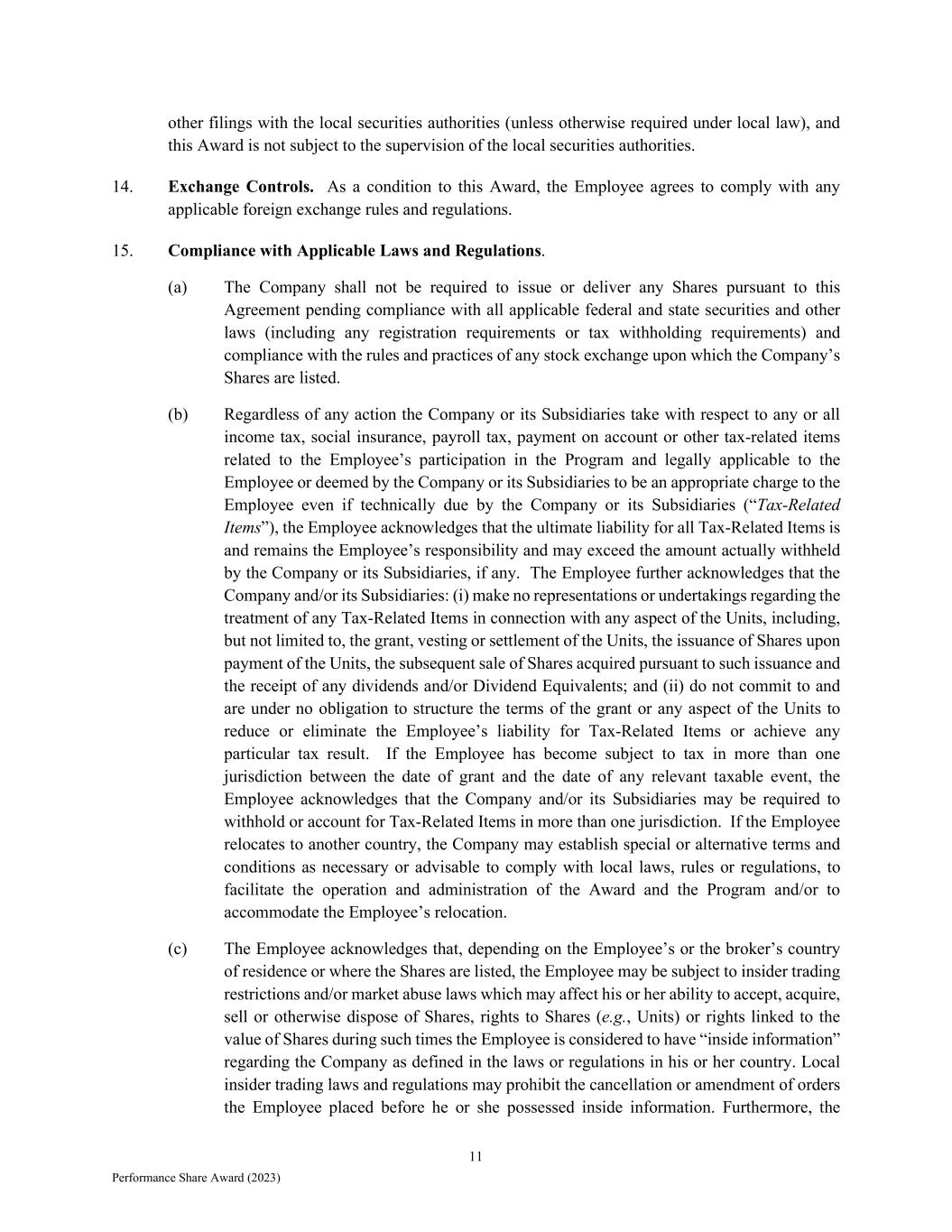 11 Performance Share Award (2023) other filings with the local securities authorities (unless otherwise required under local law), and this Award is not subject to the supervision of the local securities authorities. 14. Exchange Controls. As a condition to this Award, the Employee agrees to comply with any applicable foreign exchange rules and regulations. 15. Compliance with Applicable Laws and Regulations. (a) The Company shall not be required to issue or deliver any Shares pursuant to this Agreement pending compliance with all applicable federal and state securities and other laws (including any registration requirements or tax withholding requirements) and compliance with the rules and practices of any stock exchange upon which the Company’s Shares are listed. (b) Regardless of any action the Company or its Subsidiaries take with respect to any or all income tax, social insurance, payroll tax, payment on account or other tax-related items related to the Employee’s participation in the Program and legally applicable to the Employee or deemed by the Company or its Subsidiaries to be an appropriate charge to the Employee even if technically due by the Company or its Subsidiaries (“Tax-Related Items”), the Employee acknowledges that the ultimate liability for all Tax-Related Items is and remains the Employee’s responsibility and may exceed the amount actually withheld by the Company or its Subsidiaries, if any. The Employee further acknowledges that the Company and/or its Subsidiaries: (i) make no representations or undertakings regarding the treatment of any Tax-Related Items in connection with any aspect of the Units, including, but not limited to, the grant, vesting or settlement of the Units, the issuance of Shares upon payment of the Units, the subsequent sale of Shares acquired pursuant to such issuance and the receipt of any dividends and/or Dividend Equivalents; and (ii) do not commit to and are under no obligation to structure the terms of the grant or any aspect of the Units to reduce or eliminate the Employee’s liability for Tax-Related Items or achieve any particular tax result. If the Employee has become subject to tax in more than one jurisdiction between the date of grant and the date of any relevant taxable event, the Employee acknowledges that the Company and/or its Subsidiaries may be required to withhold or account for Tax-Related Items in more than one jurisdiction. If the Employee relocates to another country, the Company may establish special or alternative terms and conditions as necessary or advisable to comply with local laws, rules or regulations, to facilitate the operation and administration of the Award and the Program and/or to accommodate the Employee’s relocation. (c) The Employee acknowledges that, depending on the Employee’s or the broker’s country of residence or where the Shares are listed, the Employee may be subject to insider trading restrictions and/or market abuse laws which may affect his or her ability to accept, acquire, sell or otherwise dispose of Shares, rights to Shares (e.g., Units) or rights linked to the value of Shares during such times the Employee is considered to have “inside information” regarding the Company as defined in the laws or regulations in his or her country. Local insider trading laws and regulations may prohibit the cancellation or amendment of orders the Employee placed before he or she possessed inside information. Furthermore, the