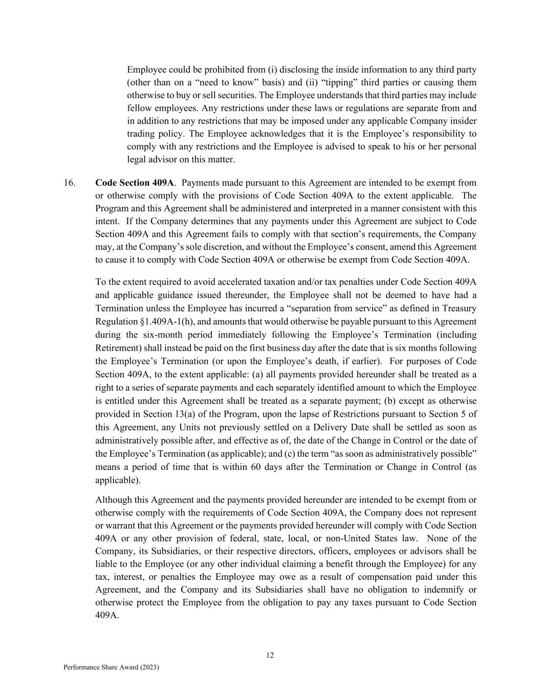 12 Performance Share Award (2023) Employee could be prohibited from (i) disclosing the inside information to any third party (other than on a “need to know” basis) and (ii) “tipping” third parties or causing them otherwise to buy or sell securities. The Employee understands that third parties may include fellow employees. Any restrictions under these laws or regulations are separate from and in addition to any restrictions that may be imposed under any applicable Company insider trading policy. The Employee acknowledges that it is the Employee’s responsibility to comply with any restrictions and the Employee is advised to speak to his or her personal legal advisor on this matter. 16. Code Section 409A. Payments made pursuant to this Agreement are intended to be exempt from or otherwise comply with the provisions of Code Section 409A to the extent applicable. The Program and this Agreement shall be administered and interpreted in a manner consistent with this intent. If the Company determines that any payments under this Agreement are subject to Code Section 409A and this Agreement fails to comply with that section’s requirements, the Company may, at the Company’s sole discretion, and without the Employee’s consent, amend this Agreement to cause it to comply with Code Section 409A or otherwise be exempt from Code Section 409A. To the extent required to avoid accelerated taxation and/or tax penalties under Code Section 409A and applicable guidance issued thereunder, the Employee shall not be deemed to have had a Termination unless the Employee has incurred a “separation from service” as defined in Treasury Regulation §1.409A-1(h), and amounts that would otherwise be payable pursuant to this Agreement during the six-month period immediately following the Employee’s Termination (including Retirement) shall instead be paid on the first business day after the date that is six months following the Employee’s Termination (or upon the Employee’s death, if earlier). For purposes of Code Section 409A, to the extent applicable: (a) all payments provided hereunder shall be treated as a right to a series of separate payments and each separately identified amount to which the Employee is entitled under this Agreement shall be treated as a separate payment; (b) except as otherwise provided in Section 13(a) of the Program, upon the lapse of Restrictions pursuant to Section 5 of this Agreement, any Units not previously settled on a Delivery Date shall be settled as soon as administratively possible after, and effective as of, the date of the Change in Control or the date of the Employee’s Termination (as applicable); and (c) the term “as soon as administratively possible” means a period of time that is within 60 days after the Termination or Change in Control (as applicable). Although this Agreement and the payments provided hereunder are intended to be exempt from or otherwise comply with the requirements of Code Section 409A, the Company does not represent or warrant that this Agreement or the payments provided hereunder will comply with Code Section 409A or any other provision of federal, state, local, or non-United States law. None of the Company, its Subsidiaries, or their respective directors, officers, employees or advisors shall be liable to the Employee (or any other individual claiming a benefit through the Employee) for any tax, interest, or penalties the Employee may owe as a result of compensation paid under this Agreement, and the Company and its Subsidiaries shall have no obligation to indemnify or otherwise protect the Employee from the obligation to pay any taxes pursuant to Code Section 409A.